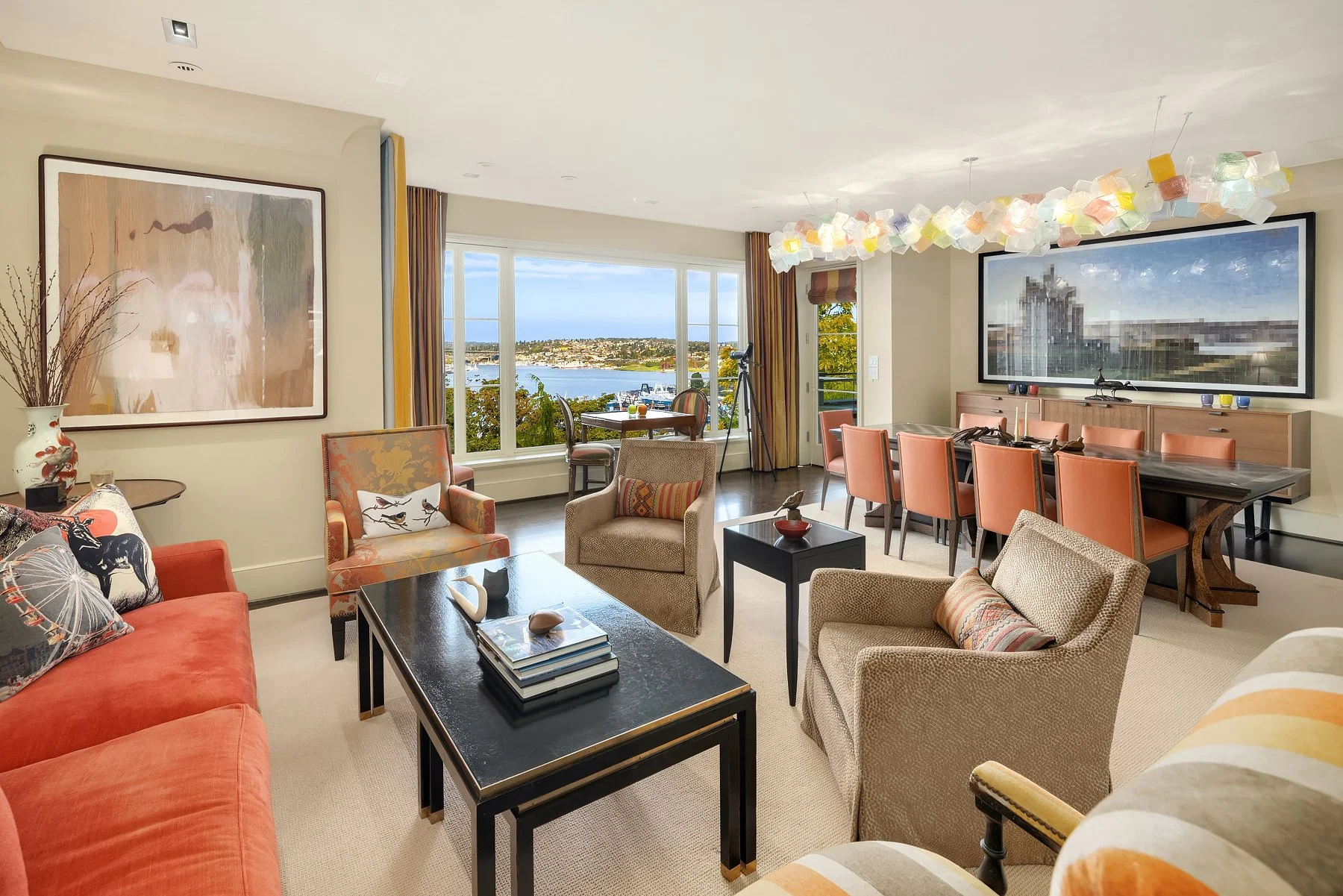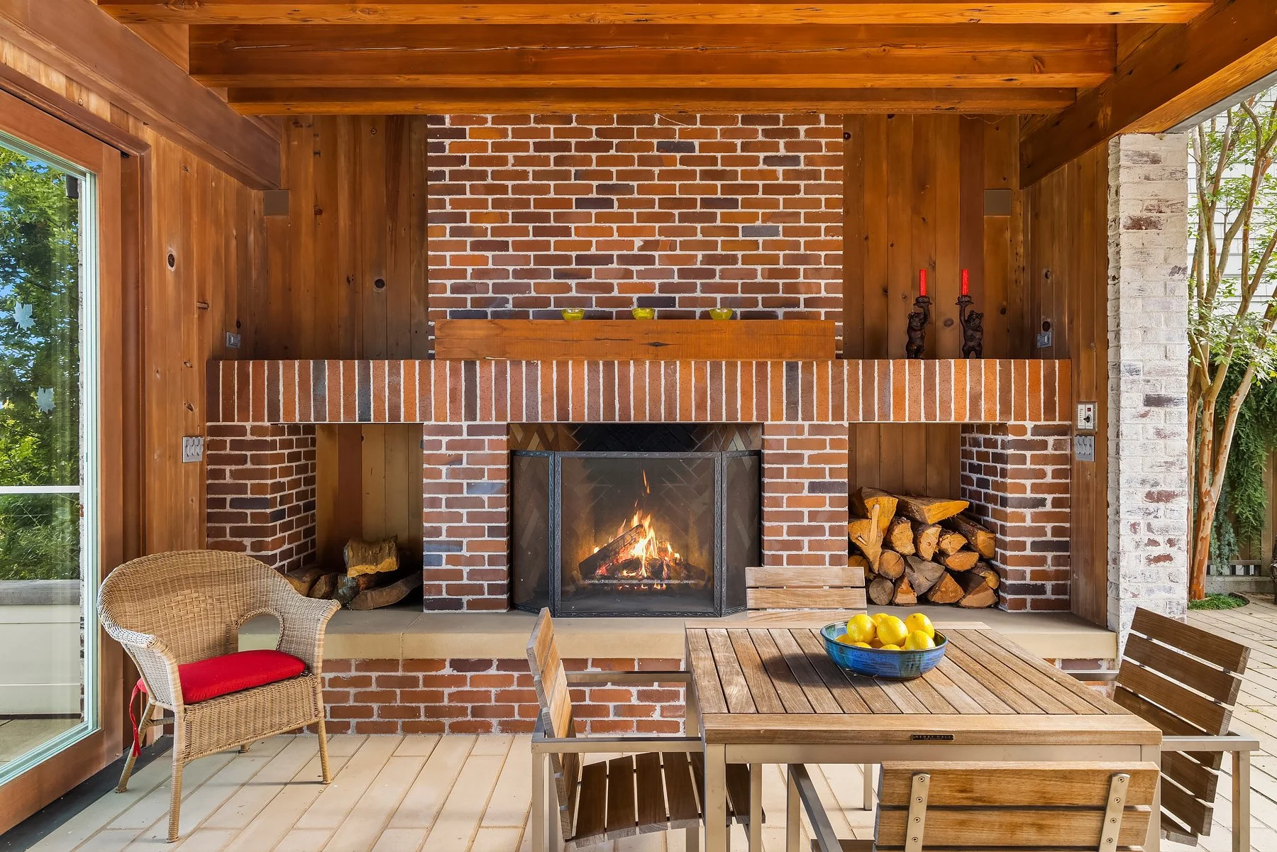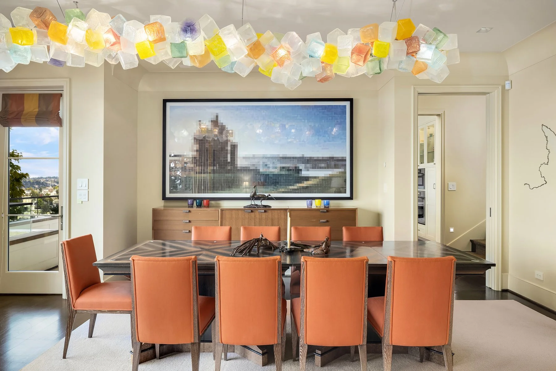 An inviting foyer leads to a gorgeous living room with walls of windows featuring iconic views and an eye-catching light fixture by Joe McDonnell. Updated kitchen with top-of-the-line appliances and access to a covered patio with fireplace & heaters, as well as a deck for dining al fresco while overlooking the dazzling city. Rustic white-washed brick, built-in Lynx BBQ, and professional landscaping with mature plantings all combine to create a sublime indoor-outdoor setup.