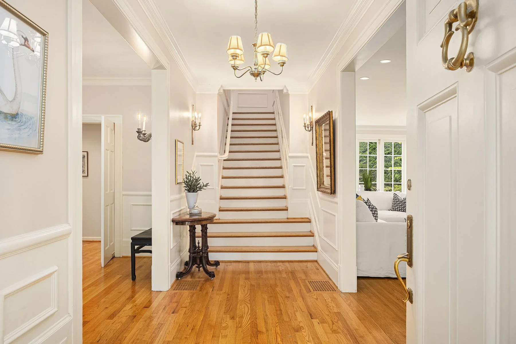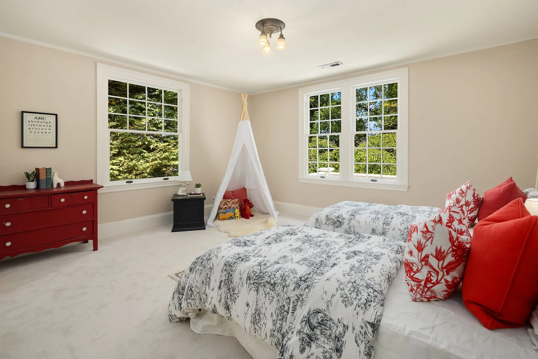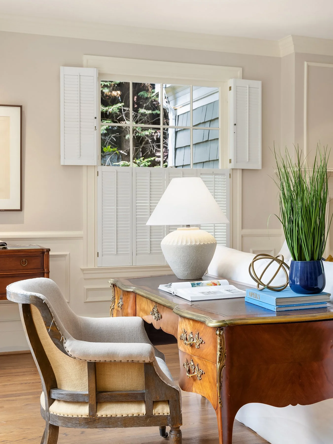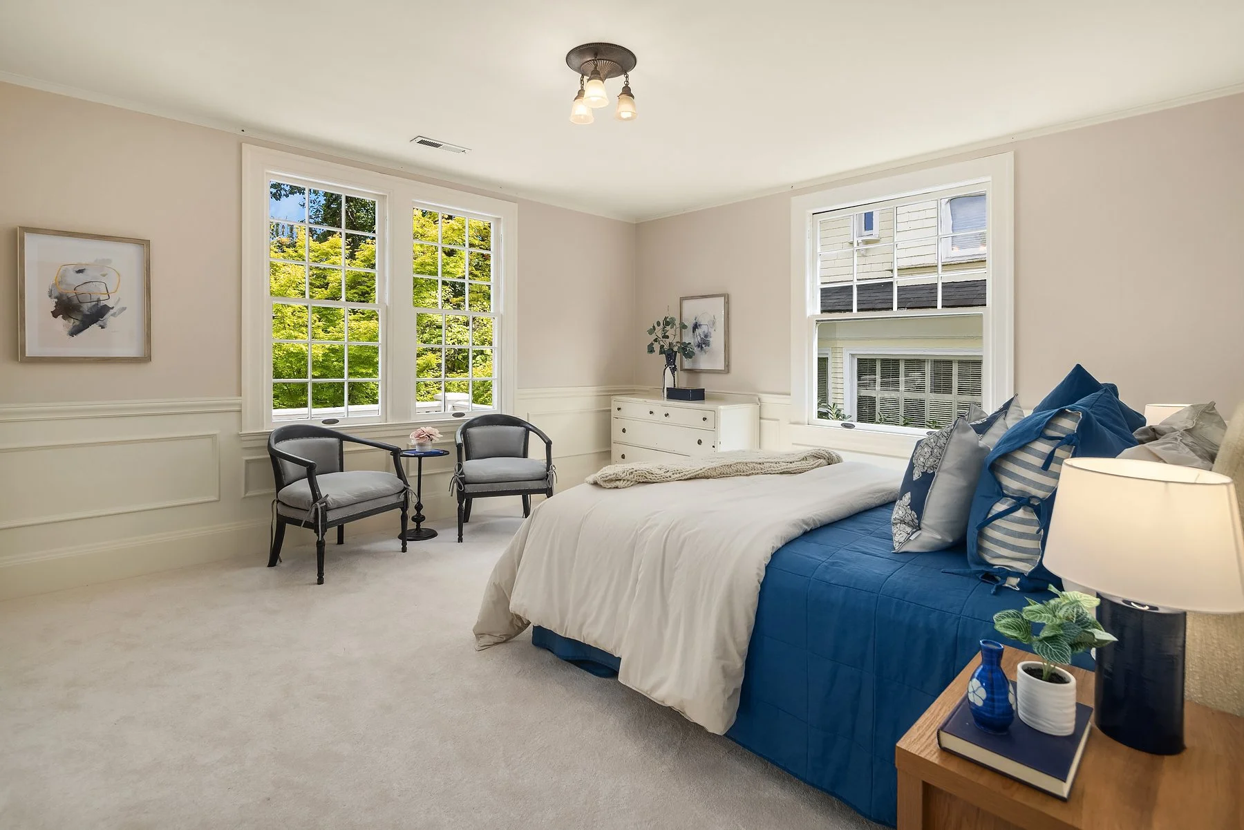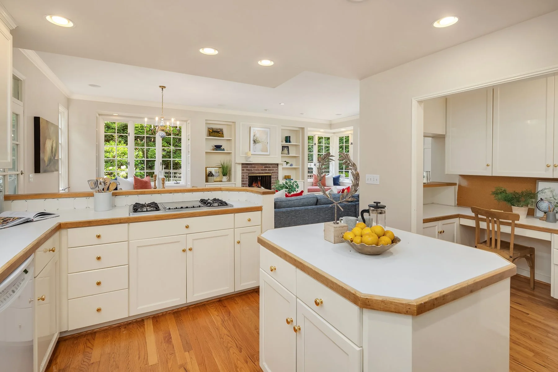 Discover this charming Colonial Revival home, where classic design meets modern comfort. Step into the spacious living room with a cozy fireplace and French doors that open to both the front porch and back deck. The kitchen boasts a casual eating nook and window seats, opening to the backyard for an effortless indoor-outdoor flow. The office nook with built-ins provides a functional workspace, while the formal dining room enhances the home’s timeless elegance.