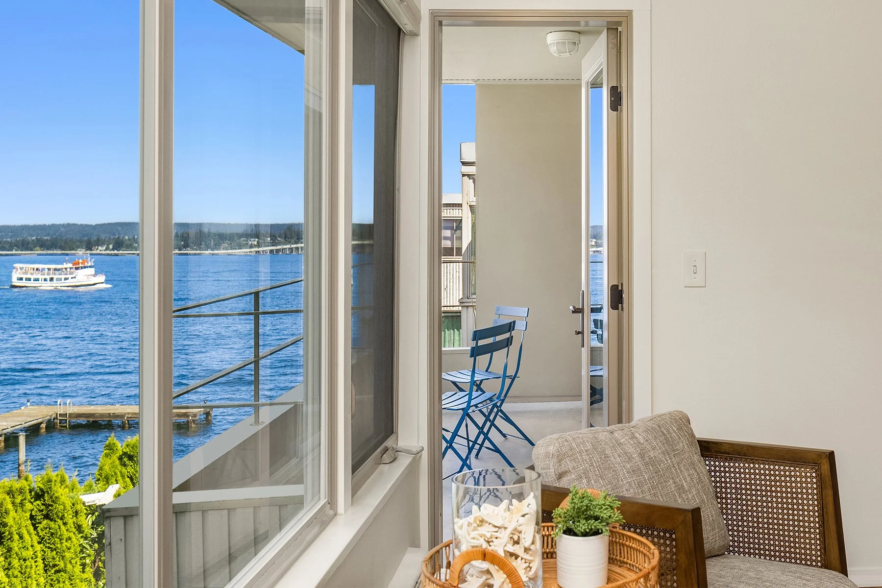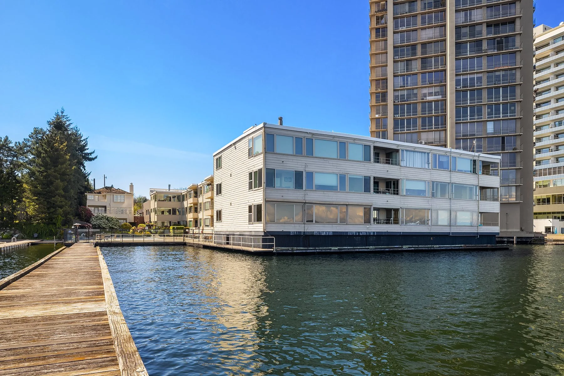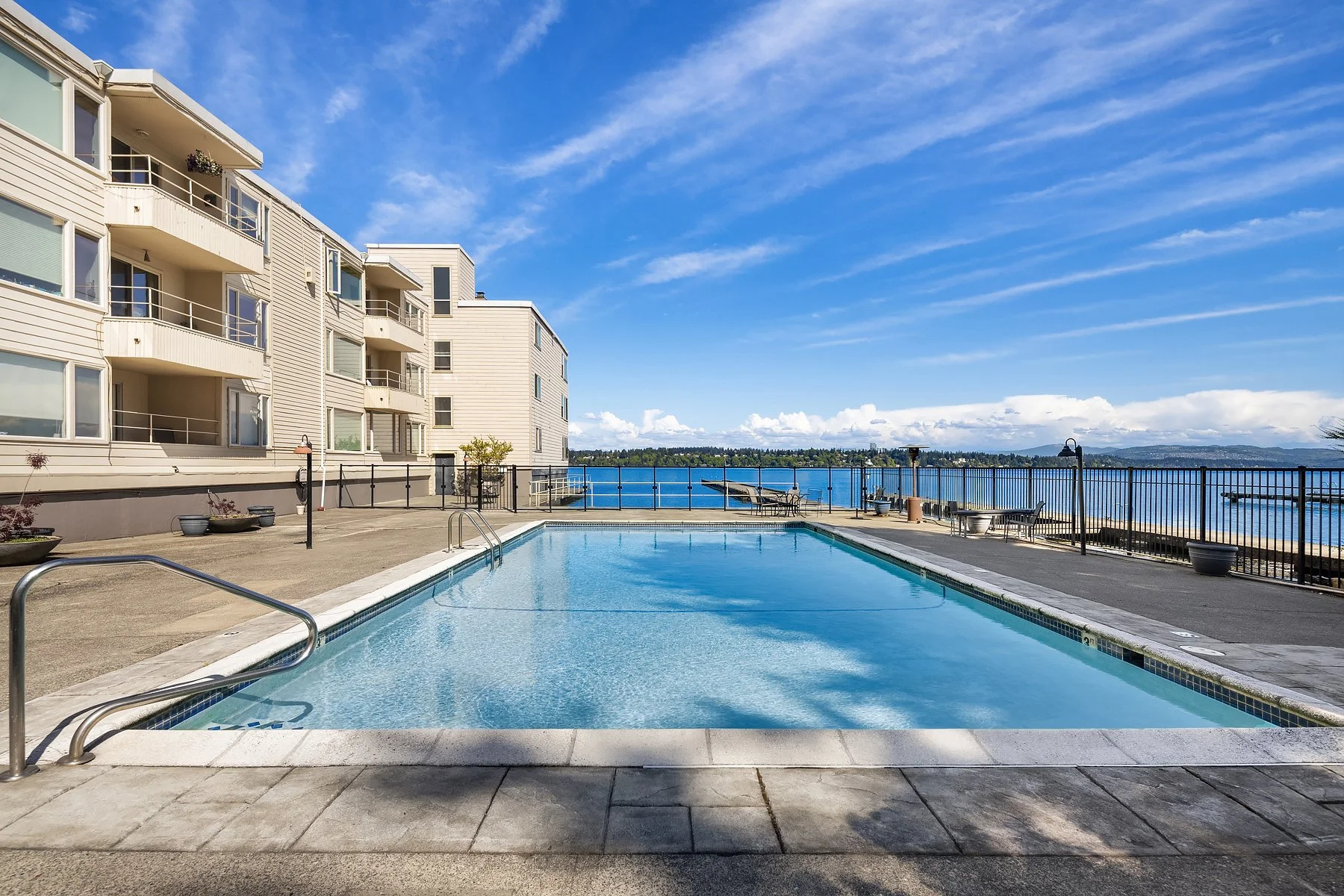 Welcome to Lanai Apartments, located in a serene setting beside Lake Washington. This 2-bedroom, 1-bathroom unit boasts captivating views of Lake Washington from its covered balcony. The main living space offers walls of windows, a modern light fixture above the dining area, and balcony access. The spacious primary bedroom exudes comfort, and the adaptable second bedroom can serve as a home office or guest room. Updated full bath; in-unit laundry room; one parking space. Relax with a refreshing dip in the pool or invite friends for a BBQ and soak up the sun! Perfectly located in coveted Madison Park, which offers an array of upscale dining and shopping options nearby.