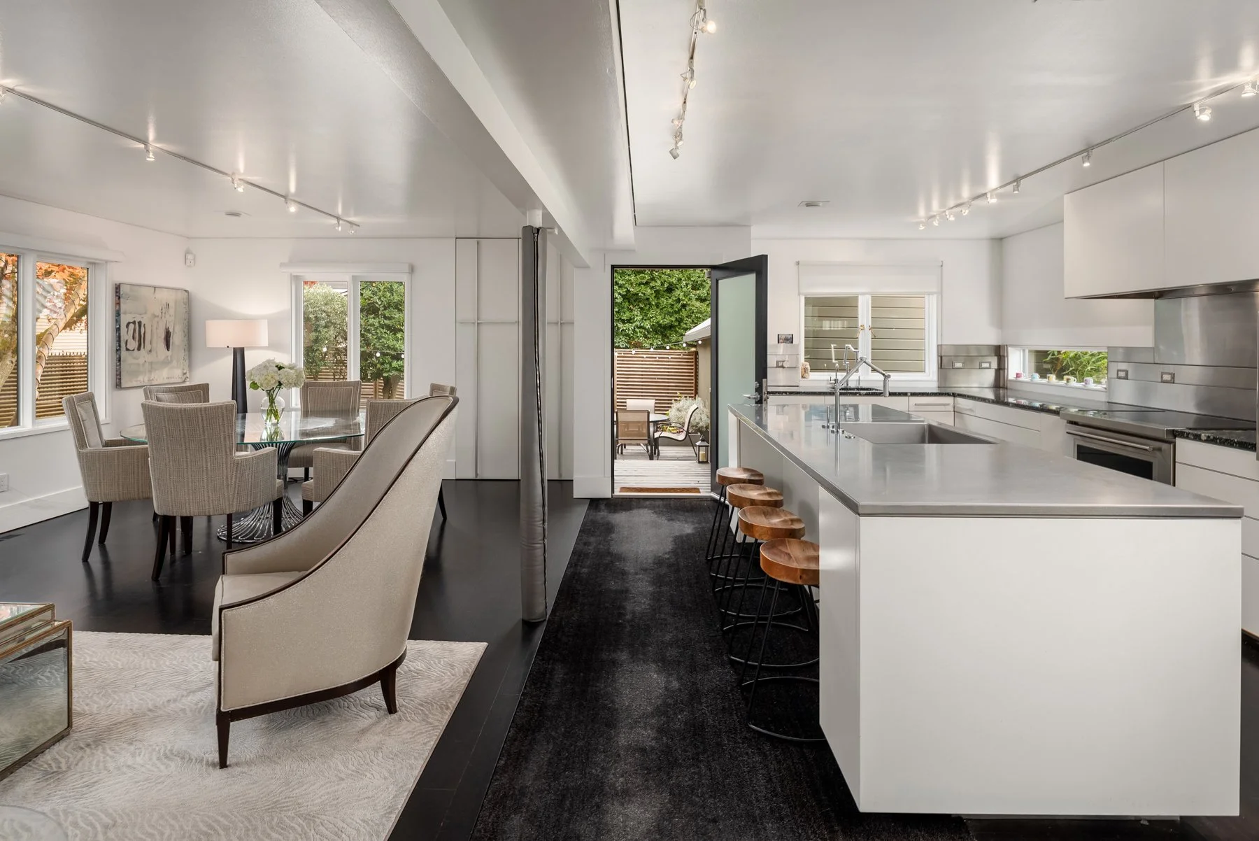 Designed by Lee Copeland and featured in the AIA Guide to Architecture in Washington State, this chic Madison Park residence sits quietly behind bamboo and plantings, offering complete privacy and architectural intention at every turn. Referred to as Chez Beech, walls of glass surround a sculptural beech tree so the tree can be experienced intimately throughout the home, creating a rare connection between architecture and nature.
