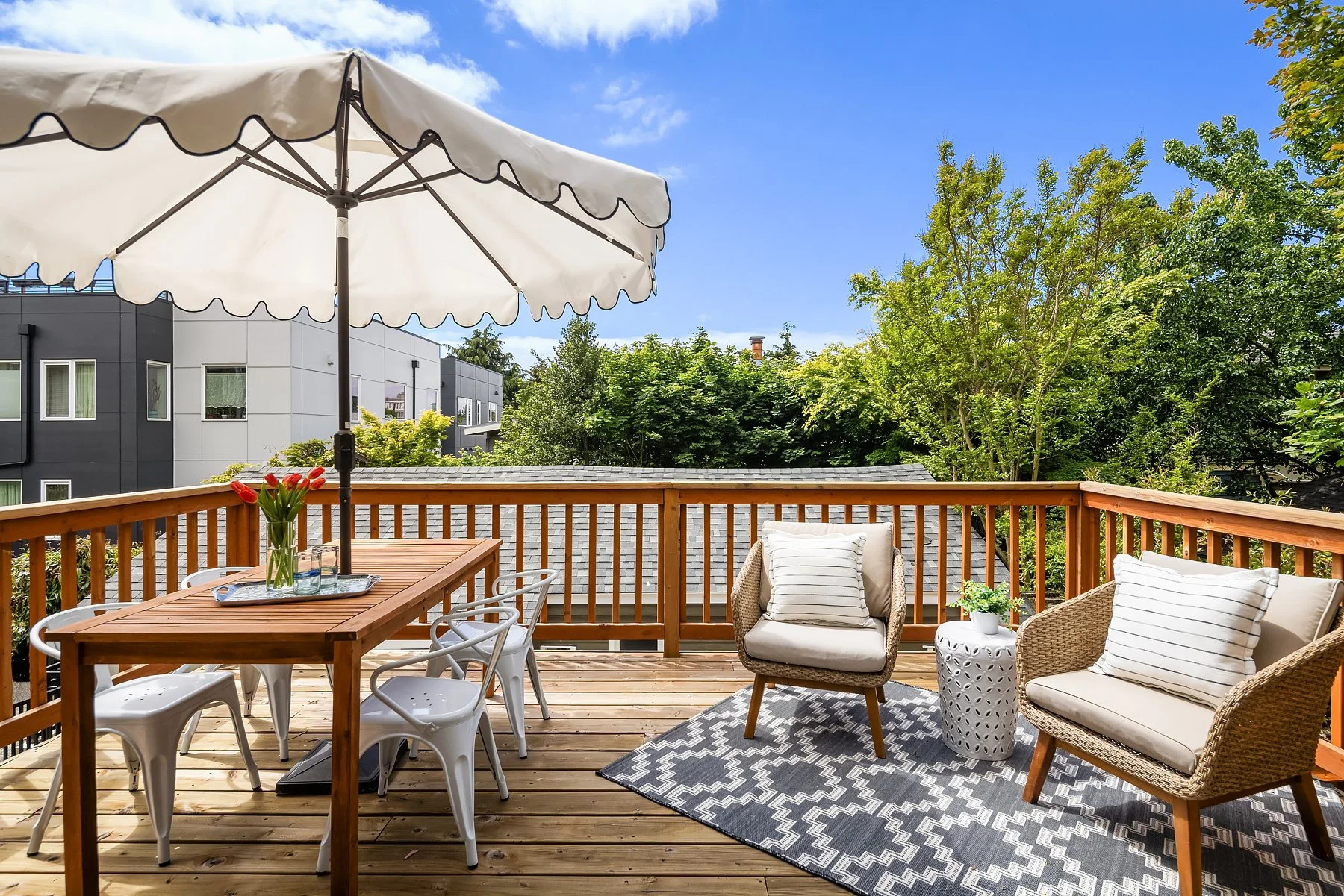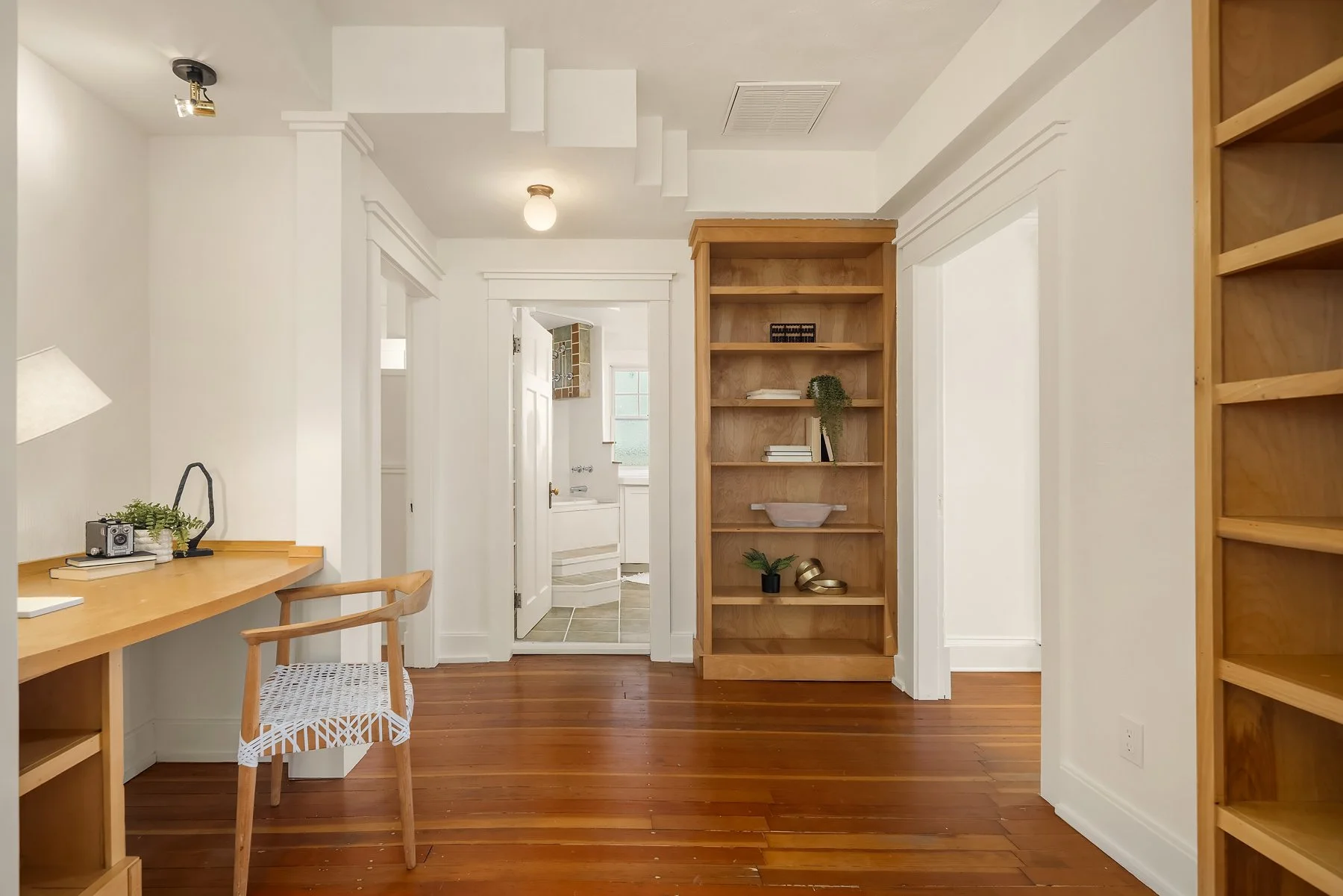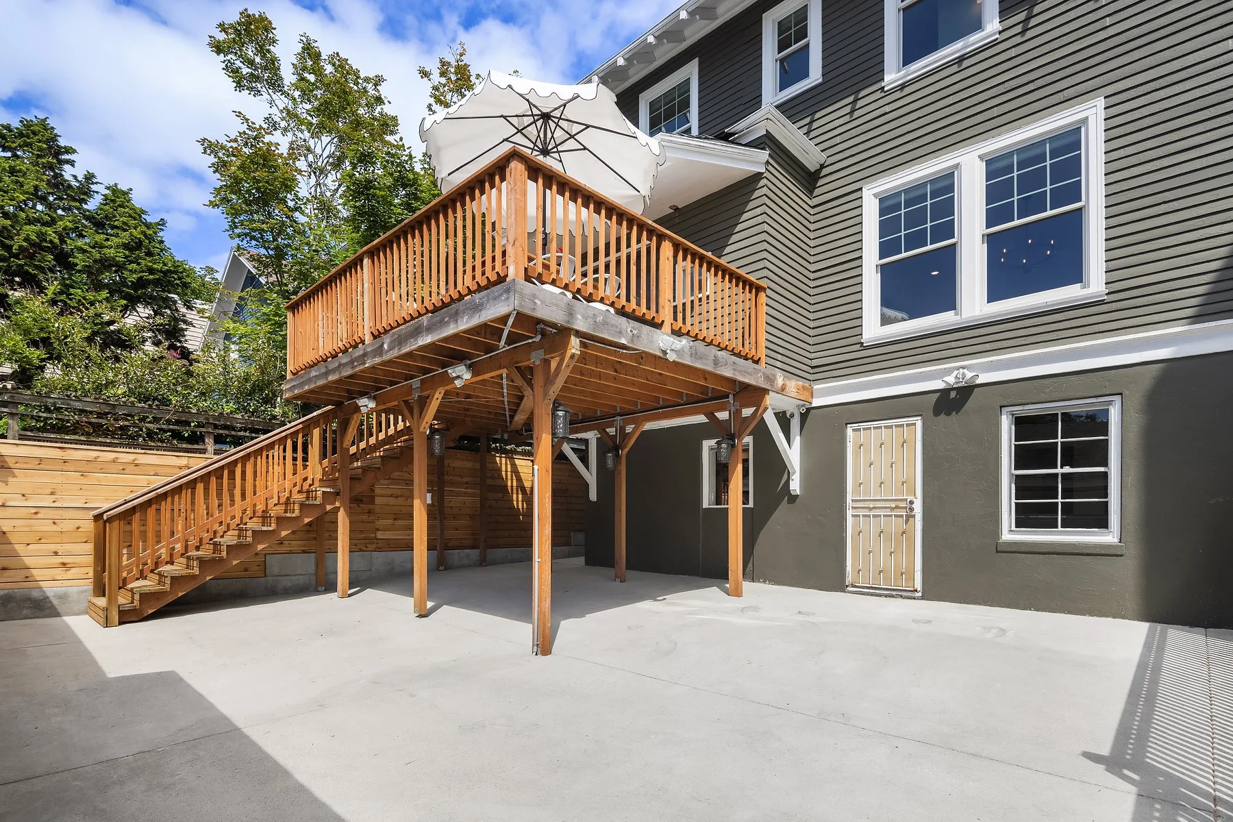 Upstairs, you'll feel like you're in a treehouse with captivating views, including the Space Needle. Original hardwood floors and Art Deco-inspired moldings add timeless charm. The landing area, with a built-in desk and bookshelves is perfect for working from home. The primary bedroom offers an en suite bath, and lots of natural light. A second bedroom, full bath, and a den complete this level.