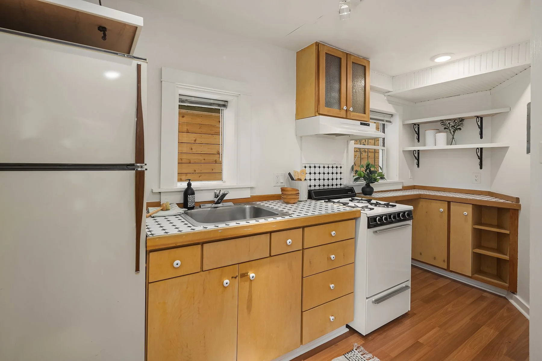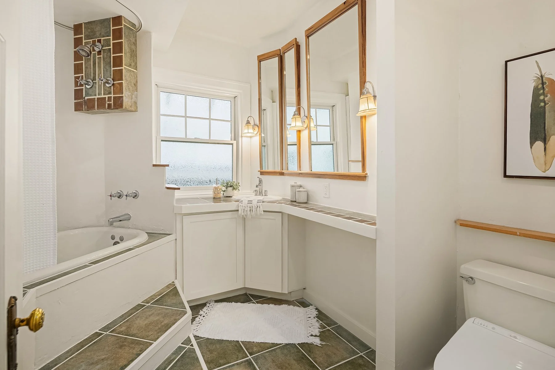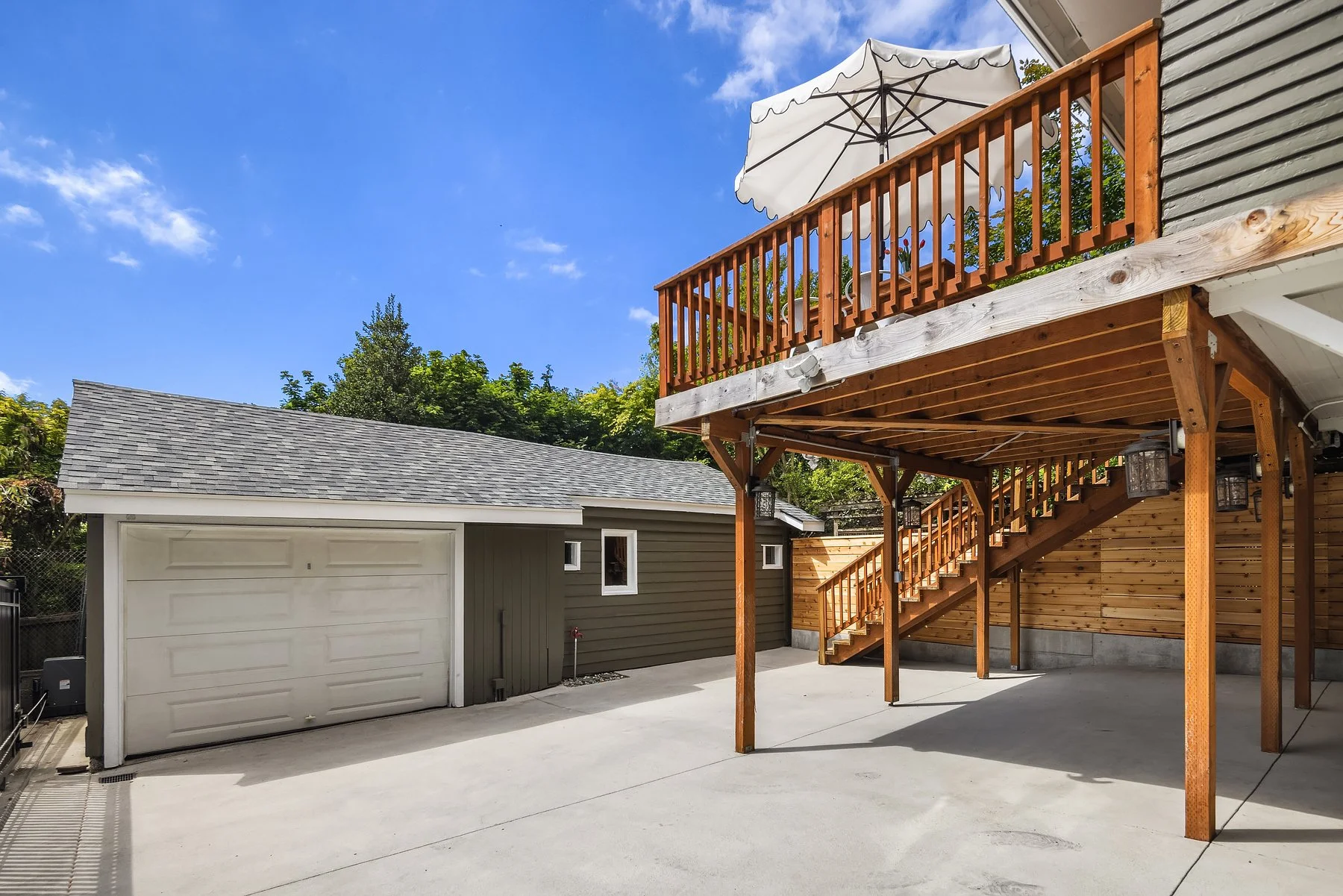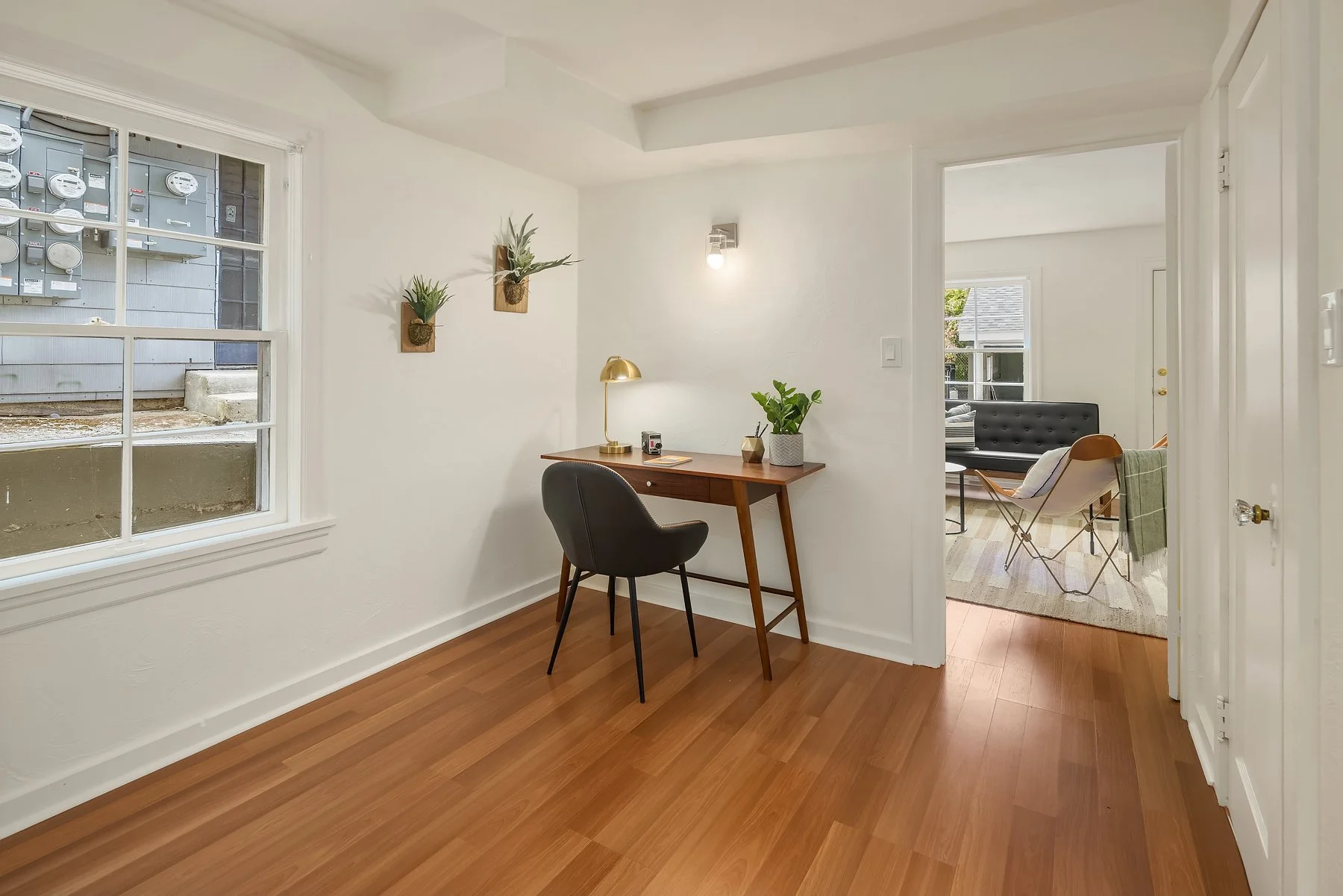 Upstairs, you'll feel like you're in a treehouse with captivating views, including the Space Needle. Original hardwood floors and Art Deco-inspired moldings add timeless charm. The landing area, with a built-in desk and bookshelves is perfect for working from home. The primary bedroom offers an en suite bath, and lots of natural light. A second bedroom, full bath, and a den complete this level.
