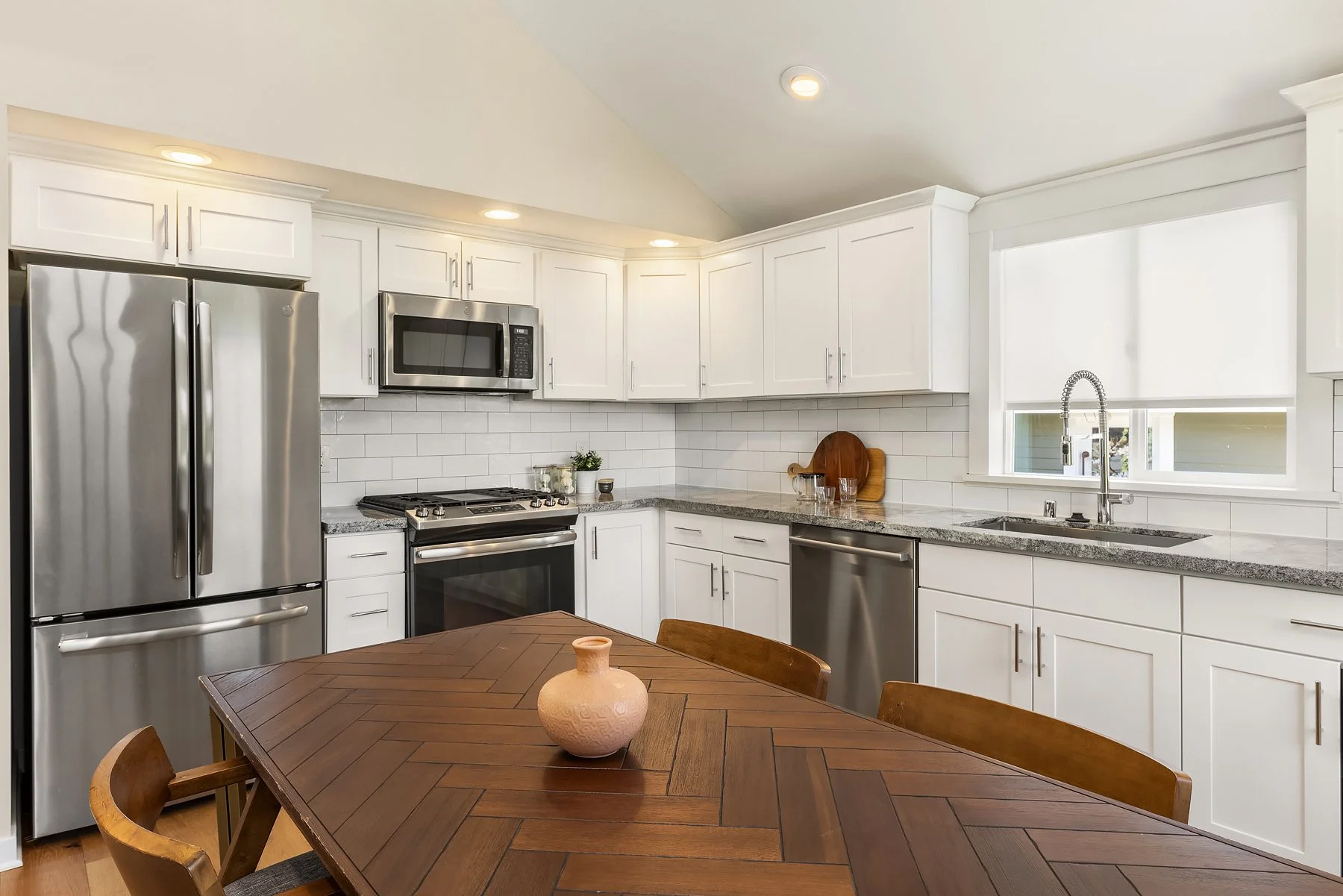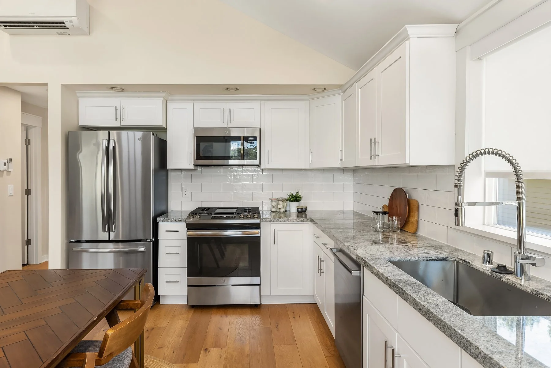Discover this charming home in North Delridge, completely remodeled down to the studs in 2019. The reverse floor plan places the great room on the upper level, with a vaulted ceiling and abundant natural light. The modern kitchen is equipped with stainless steel appliances and a subway tile backsplash. The primary suite offers an en suite bath with dual sinks, a pebble tile shower, and a walk-in closet.