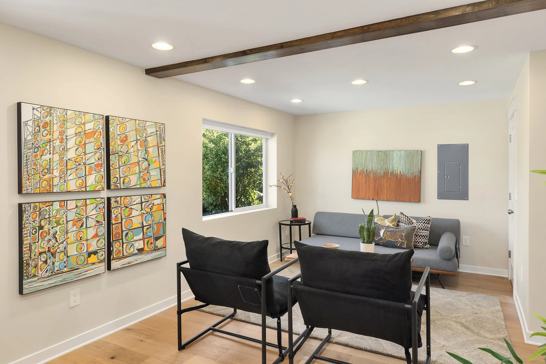The lower level features a flexible living room, two additional bedrooms, a full bath, and a convenient washer and dryer. One of the bedrooms includes its own mini-split system, providing ample space and comfort for family or guests.