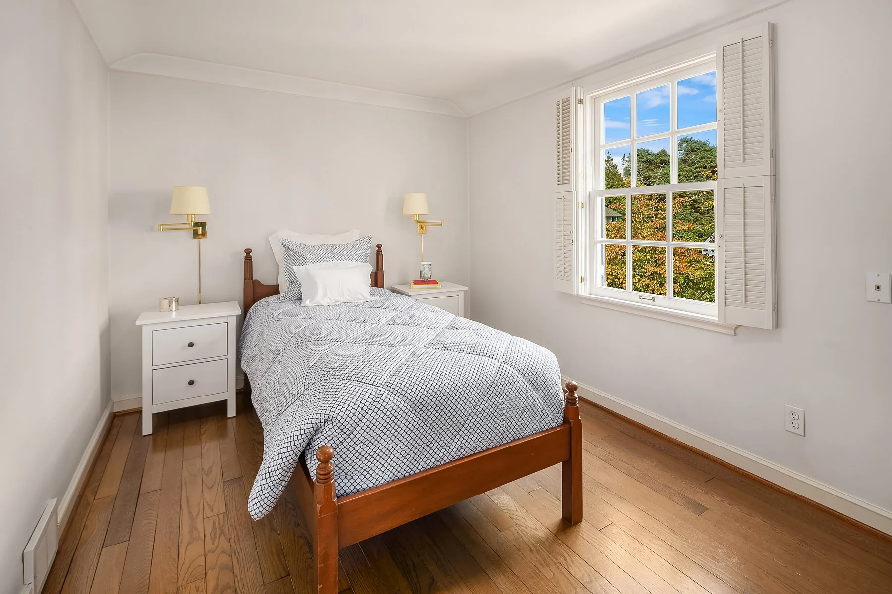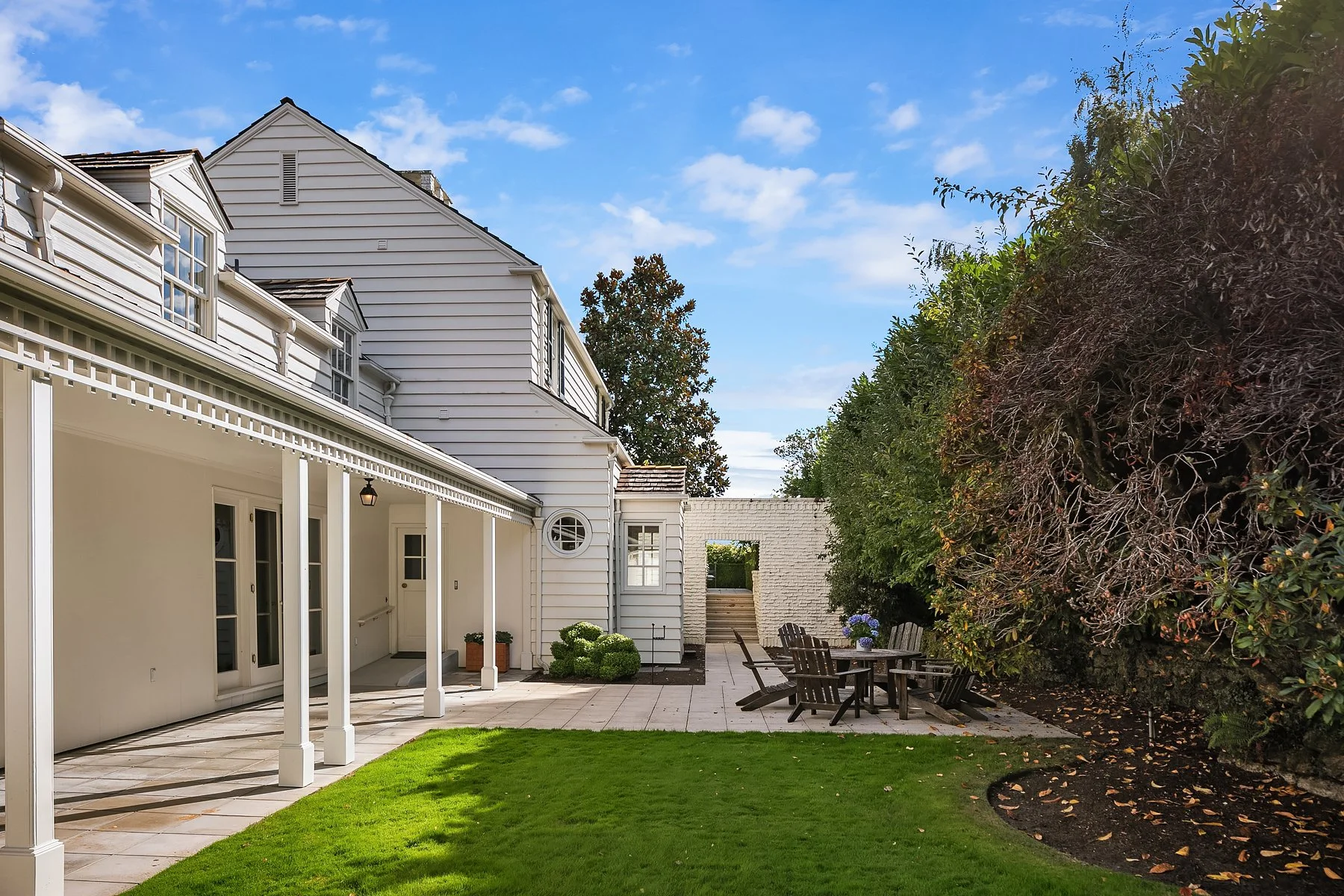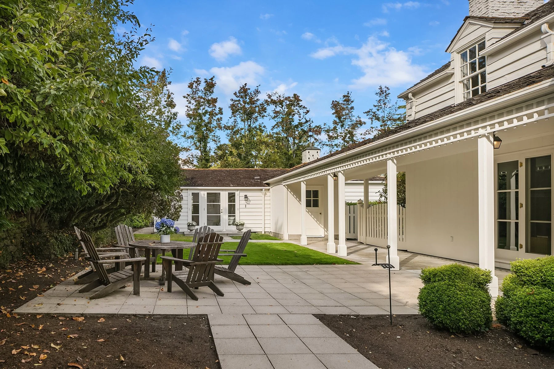 The primary suite is nestled in a separate, private wing of the home, featuring a cozy fireplace and a luxurious 5-piece bath. The top floor houses three additional bedrooms. Downstairs, the lower level has been updated with beamed ceiling and fireplace, office, and French doors leading out to the lawn. Outside, a covered walkway leads to the detached 2-car garage and the carriage house, a luxe guest suite with marble finishes.