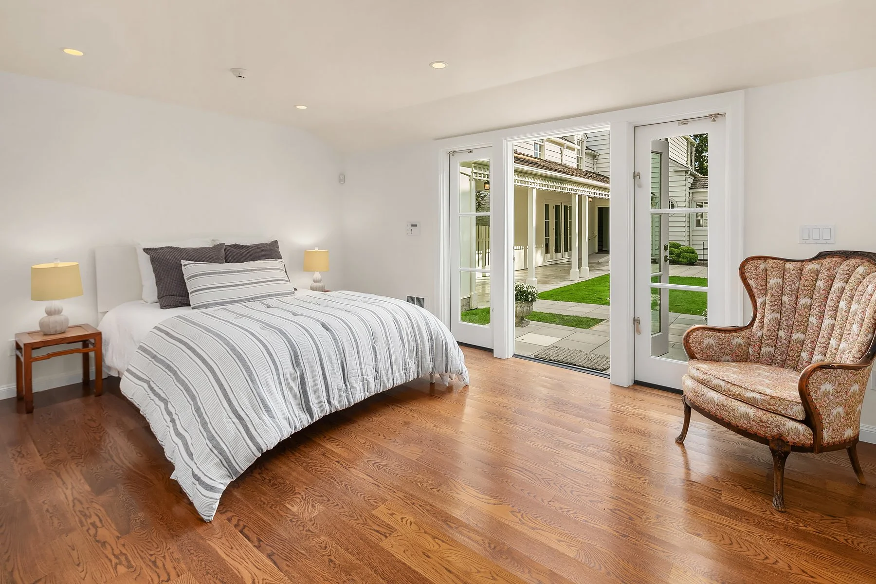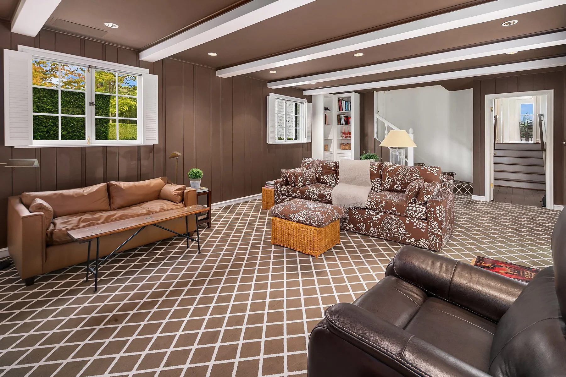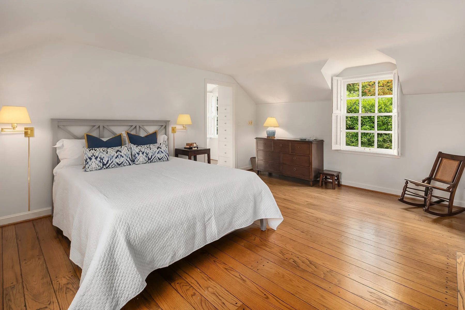 The primary suite is nestled in a separate, private wing of the home, featuring a cozy fireplace and a luxurious 5-piece bath. The top floor houses three additional bedrooms. Downstairs, the lower level has been updated with beamed ceiling and fireplace, office, and French doors leading out to the lawn. Outside, a covered walkway leads to the detached 2-car garage and the carriage house, a luxe guest suite with marble finishes.