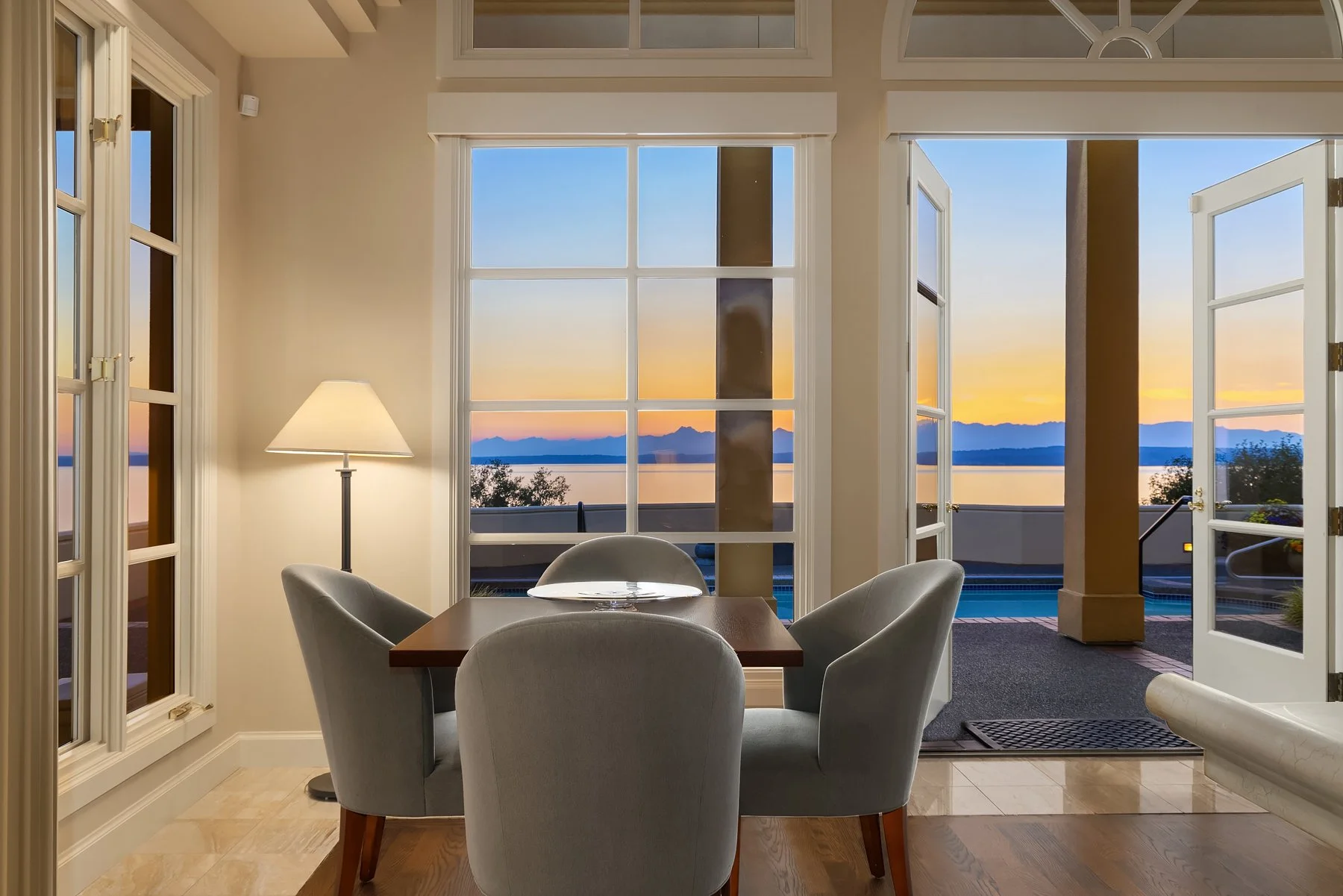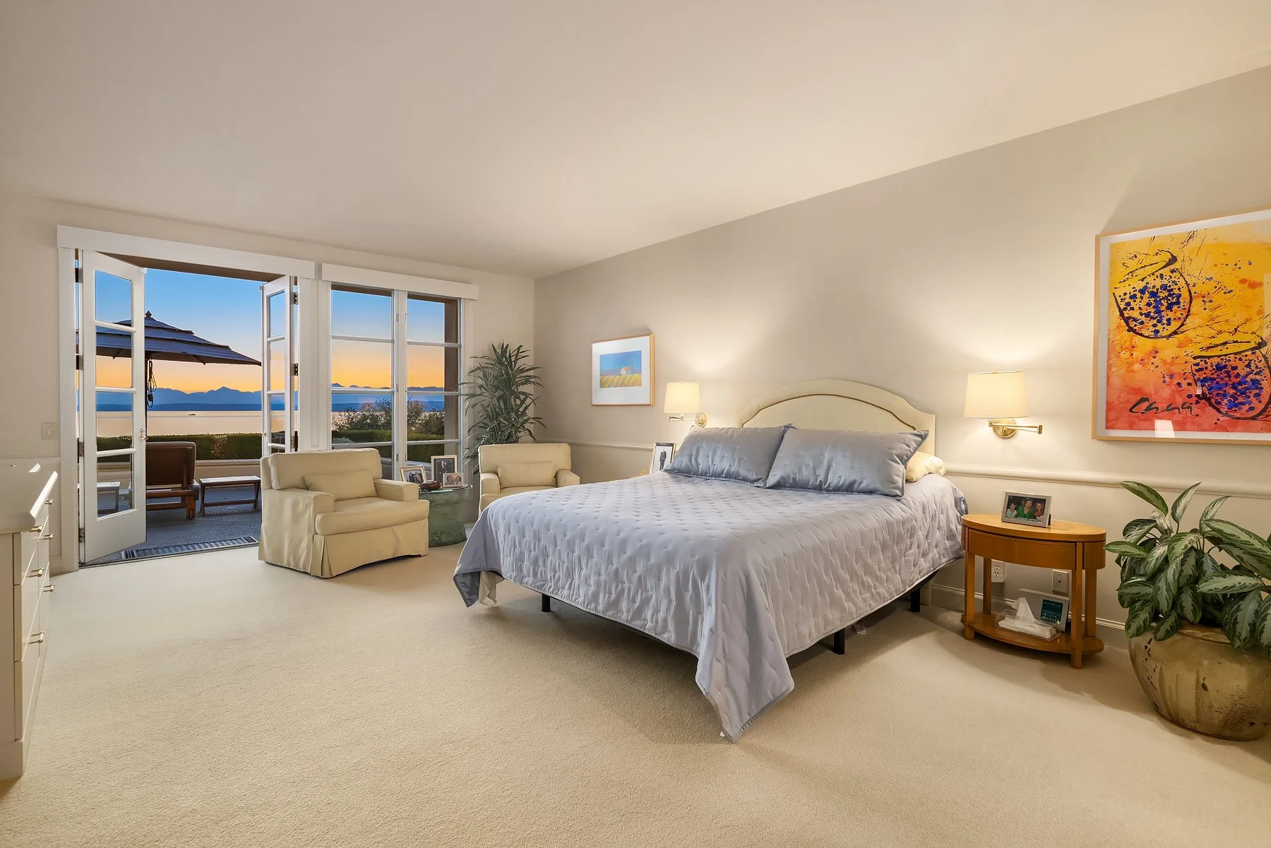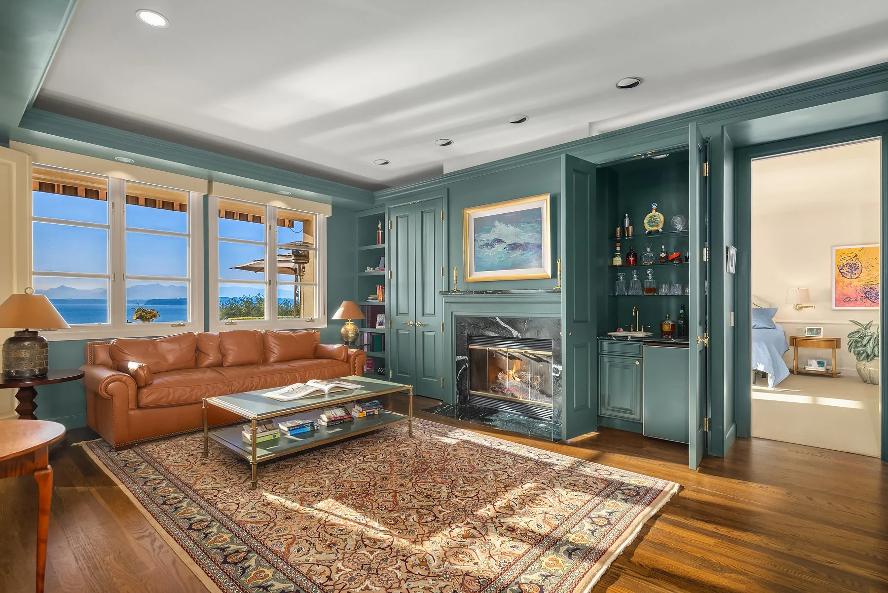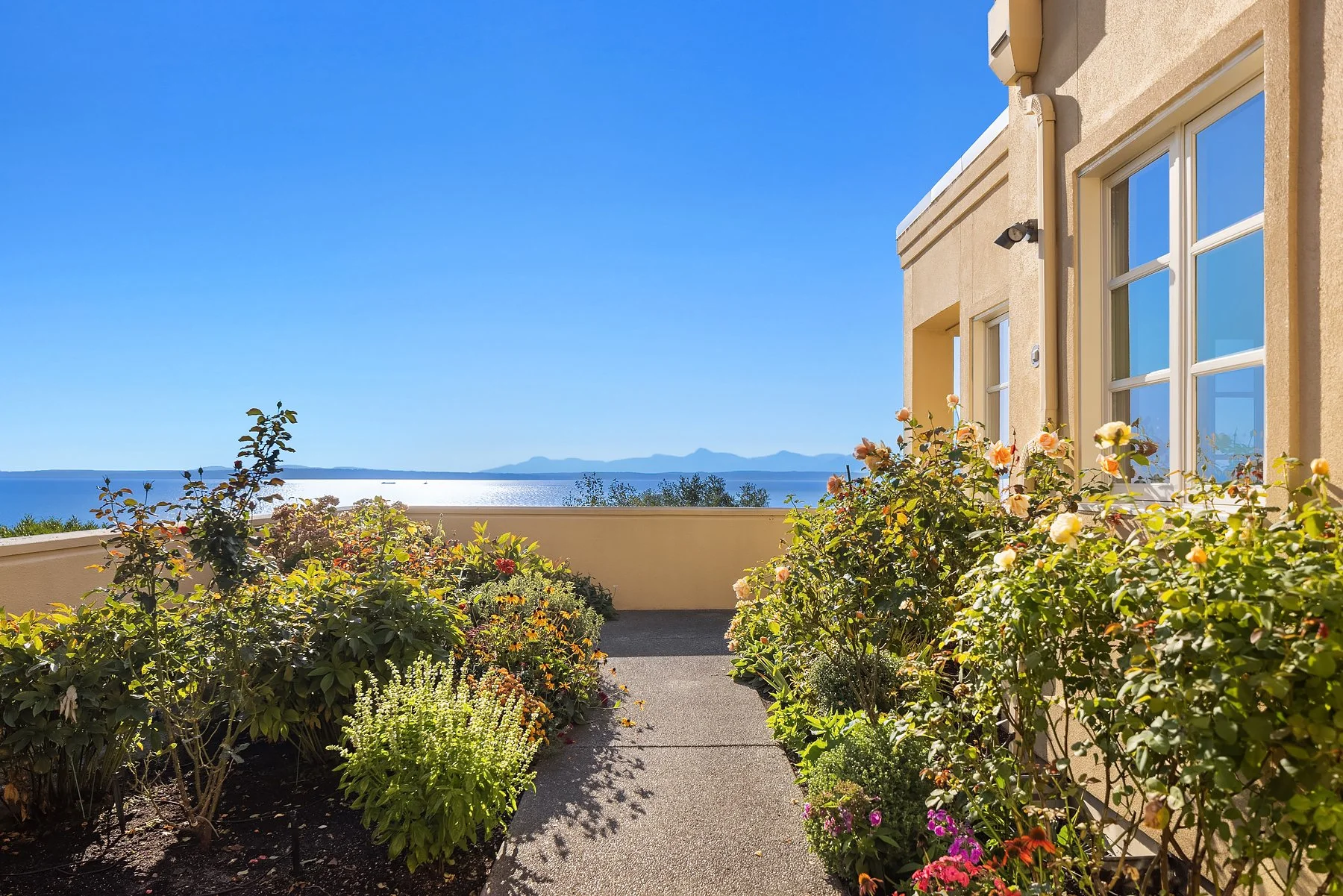 The primary suite is spacious, and opens up to the home’s signature views overlooking the Puget Sound and Olympic Mountains. It also features an opulent bath and oversized walk-in closet. The second bedroom is en suite and offers a unique garden patio with a tranquil water feature, while the third bedroom can double as a home office.