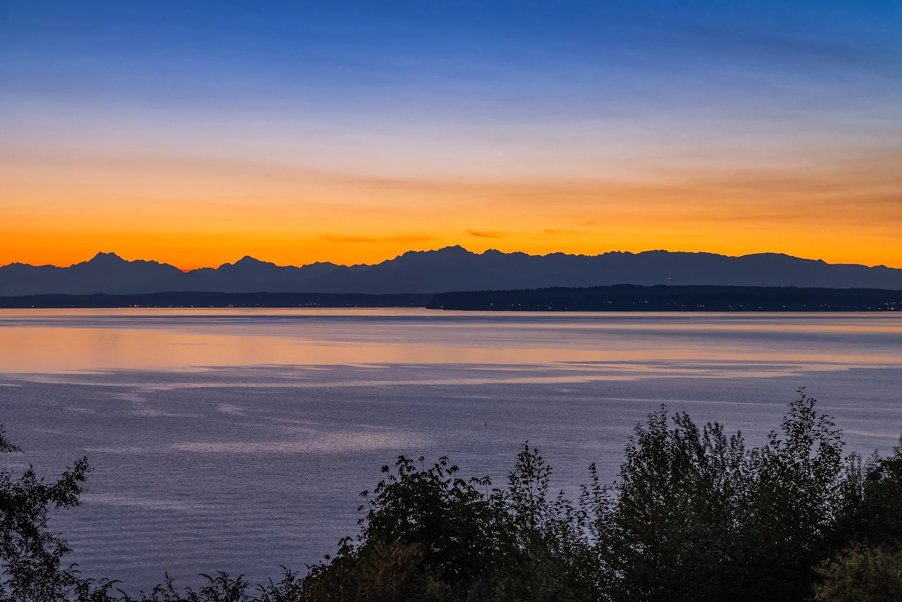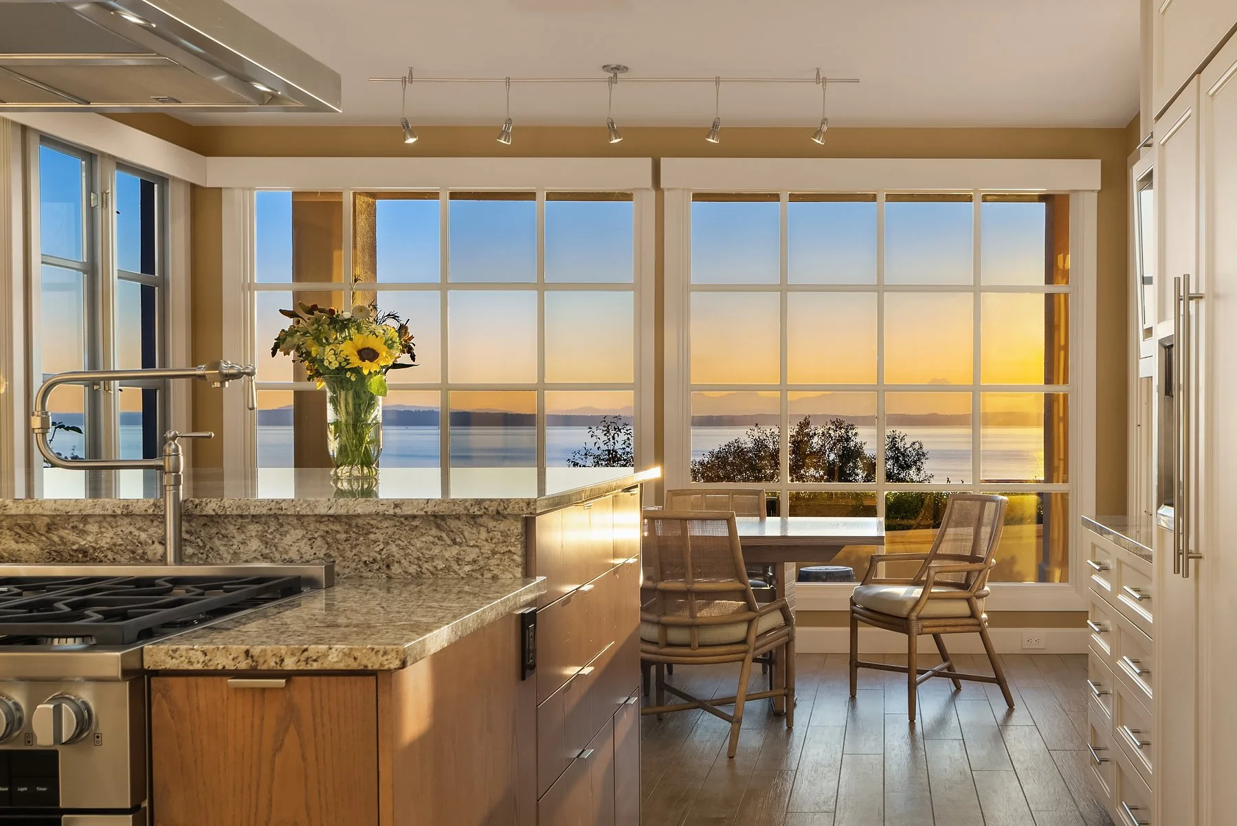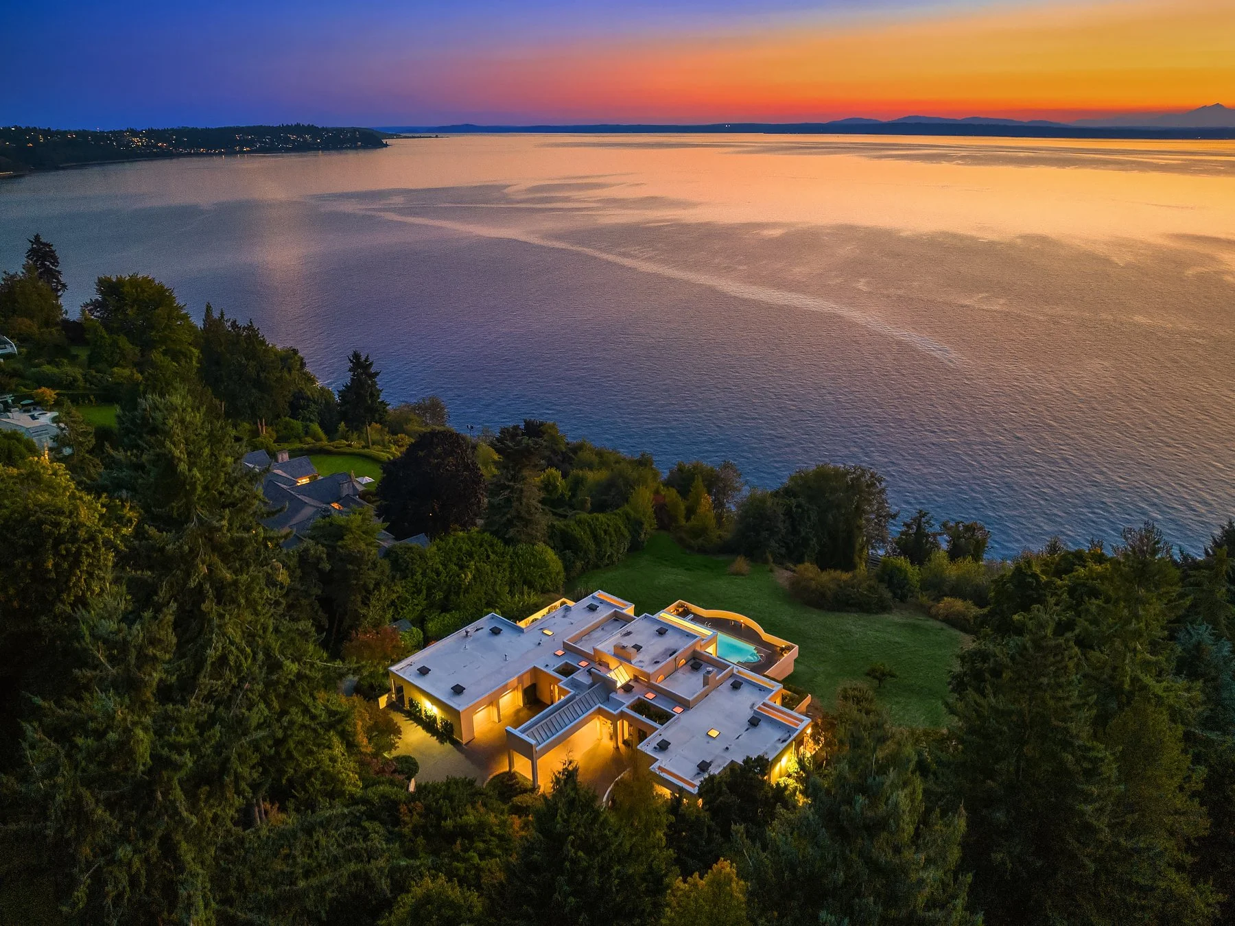 The primary suite is spacious, and opens up to the home’s signature views overlooking the Puget Sound and Olympic Mountains. It also features an opulent bath and oversized walk-in closet. The second bedroom is en suite and offers a unique garden patio with a tranquil water feature, while the third bedroom can double as a home office.