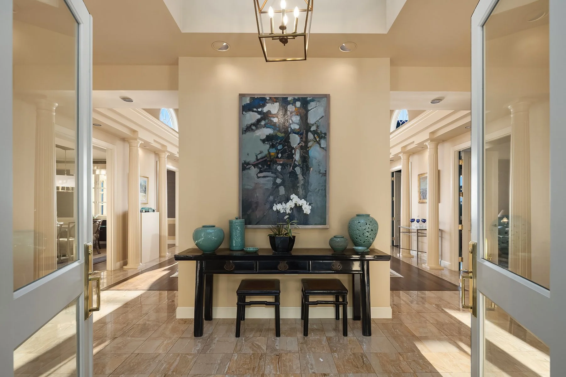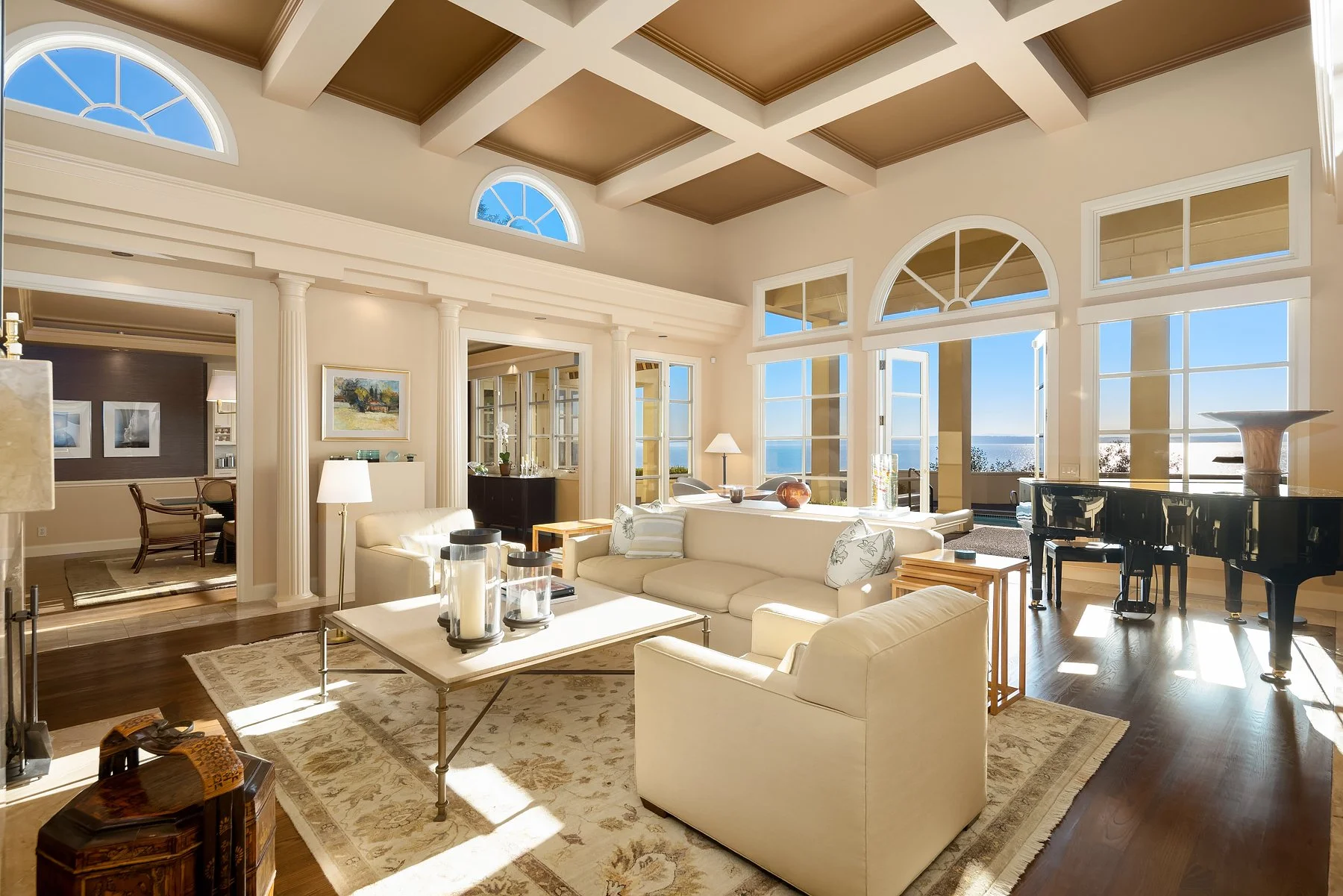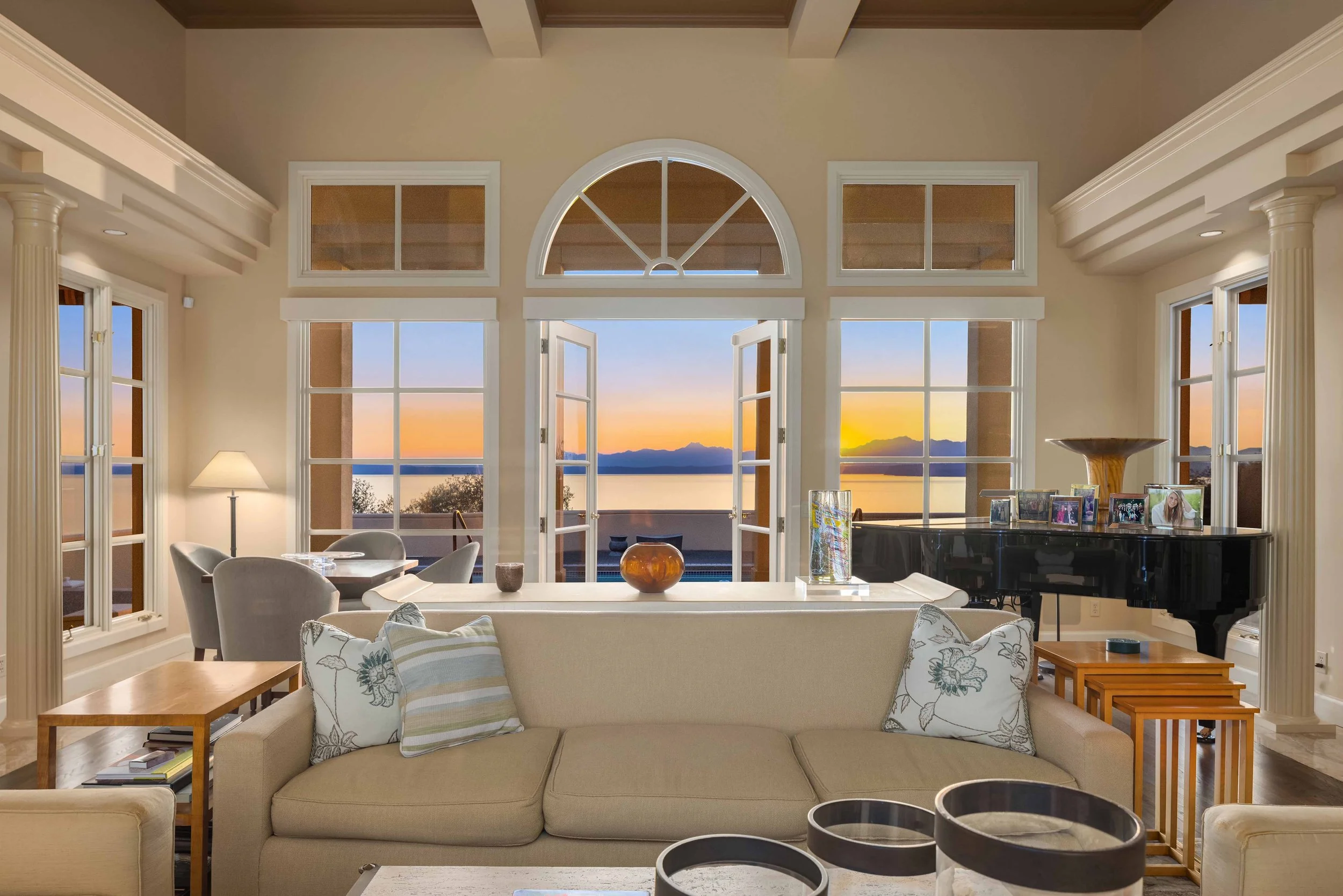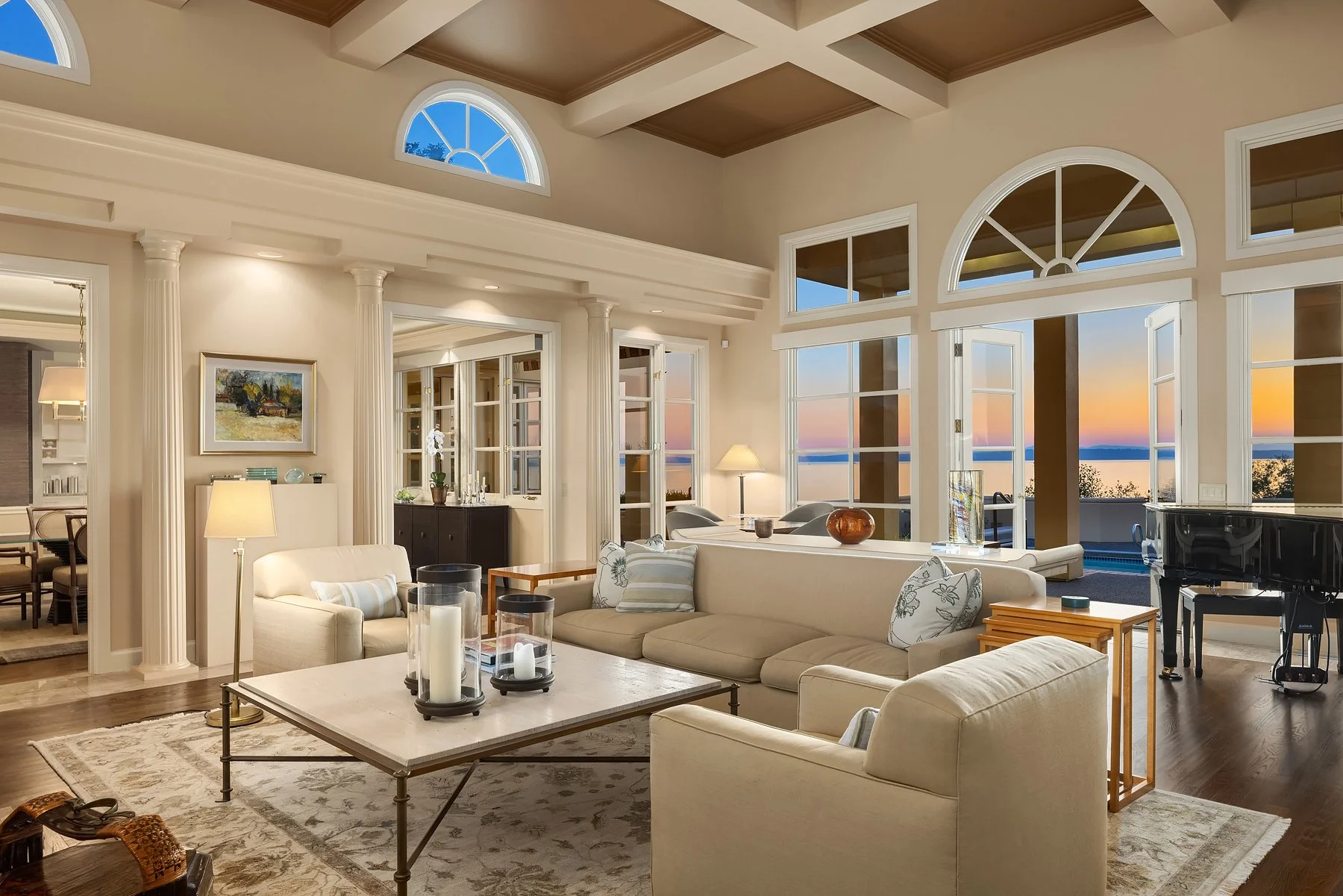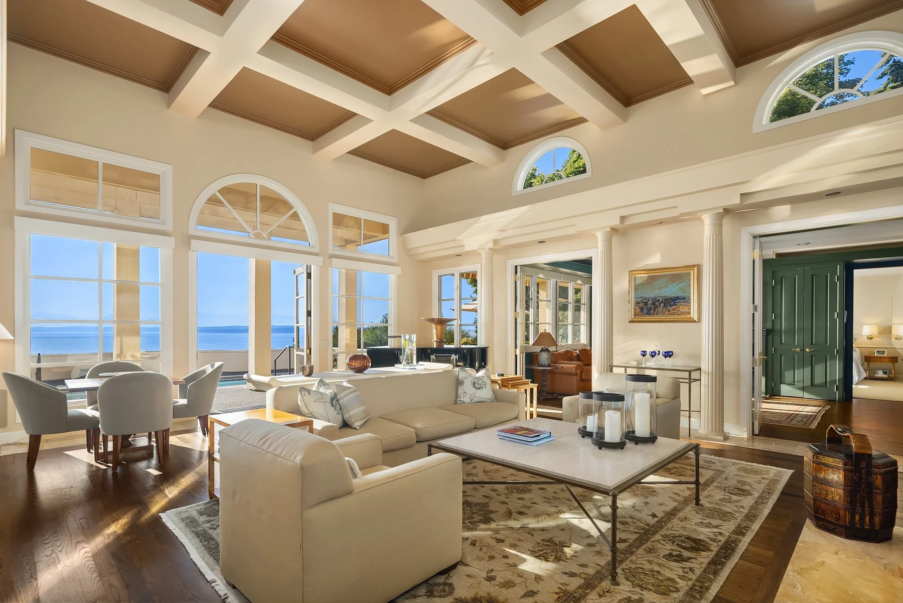 Nestled in the Highlands community with commanding westward views of the Puget Sound, this home embodies a balanced blend of thoughtful architectural and purposeful design. Almost every room offers mountain and water vistas, enhancing the one-level living space experience. The living room, adorned with Roman columns and soaring ceilings, is designed for both grand entertaining and daily comfort. A gourmet chef’s kitchen comes equipped with top-tier appliances and a central island with bar seating. Adjacent lies the formal dining room, setting an elegant tone for both festive gatherings and refined dinner parties. The den, with its gas fireplace and wet bar, promises warm and intimate evenings.