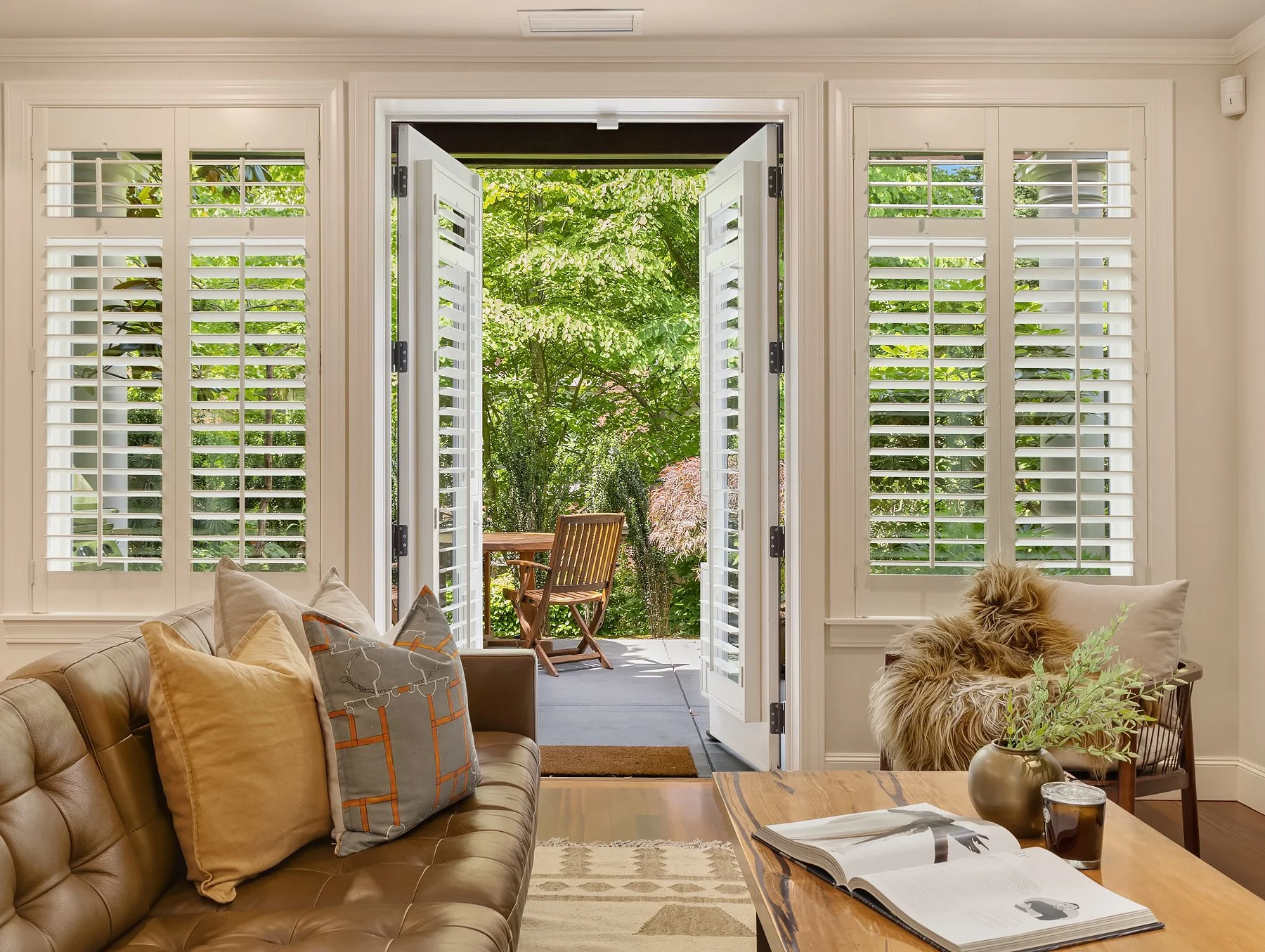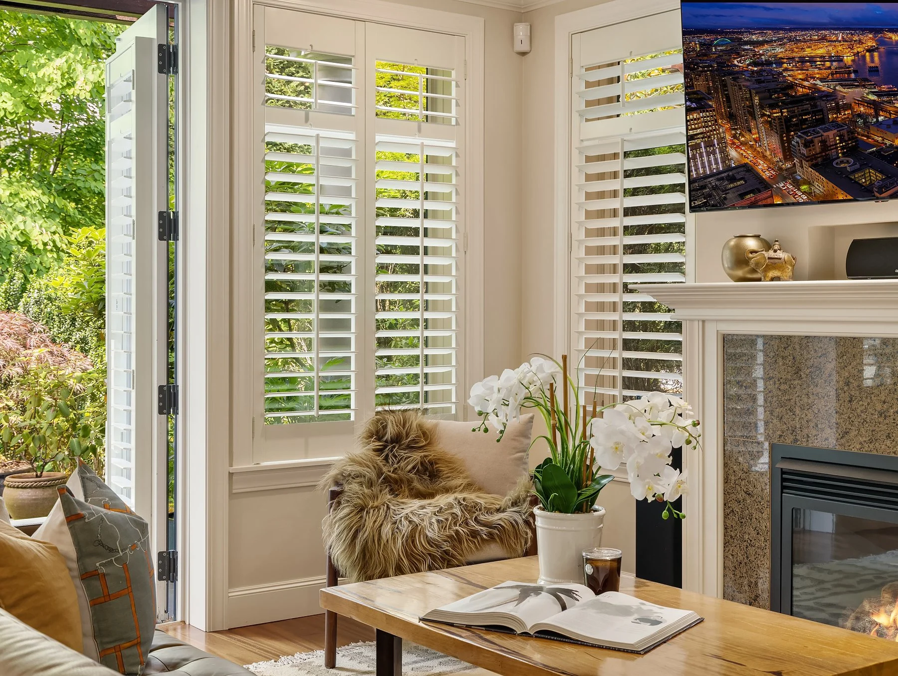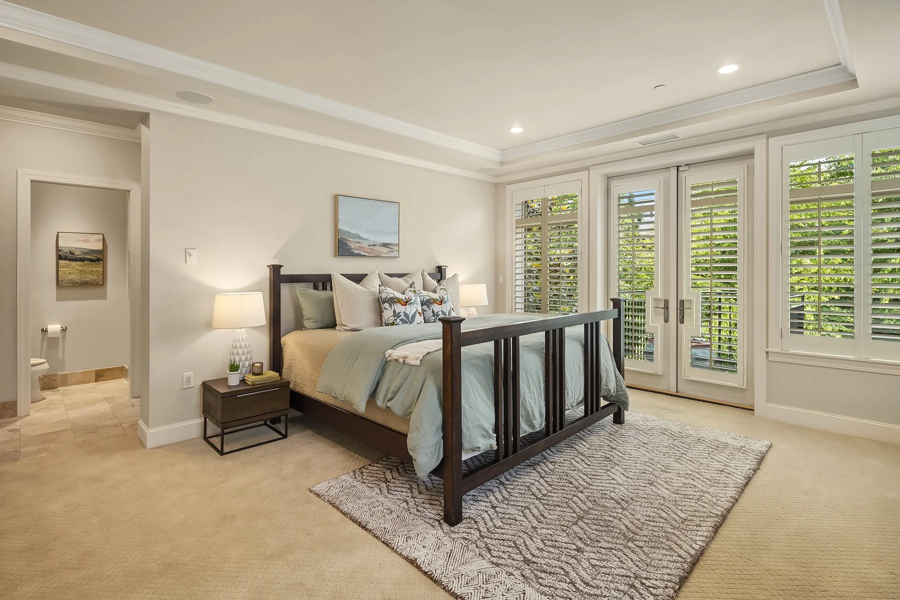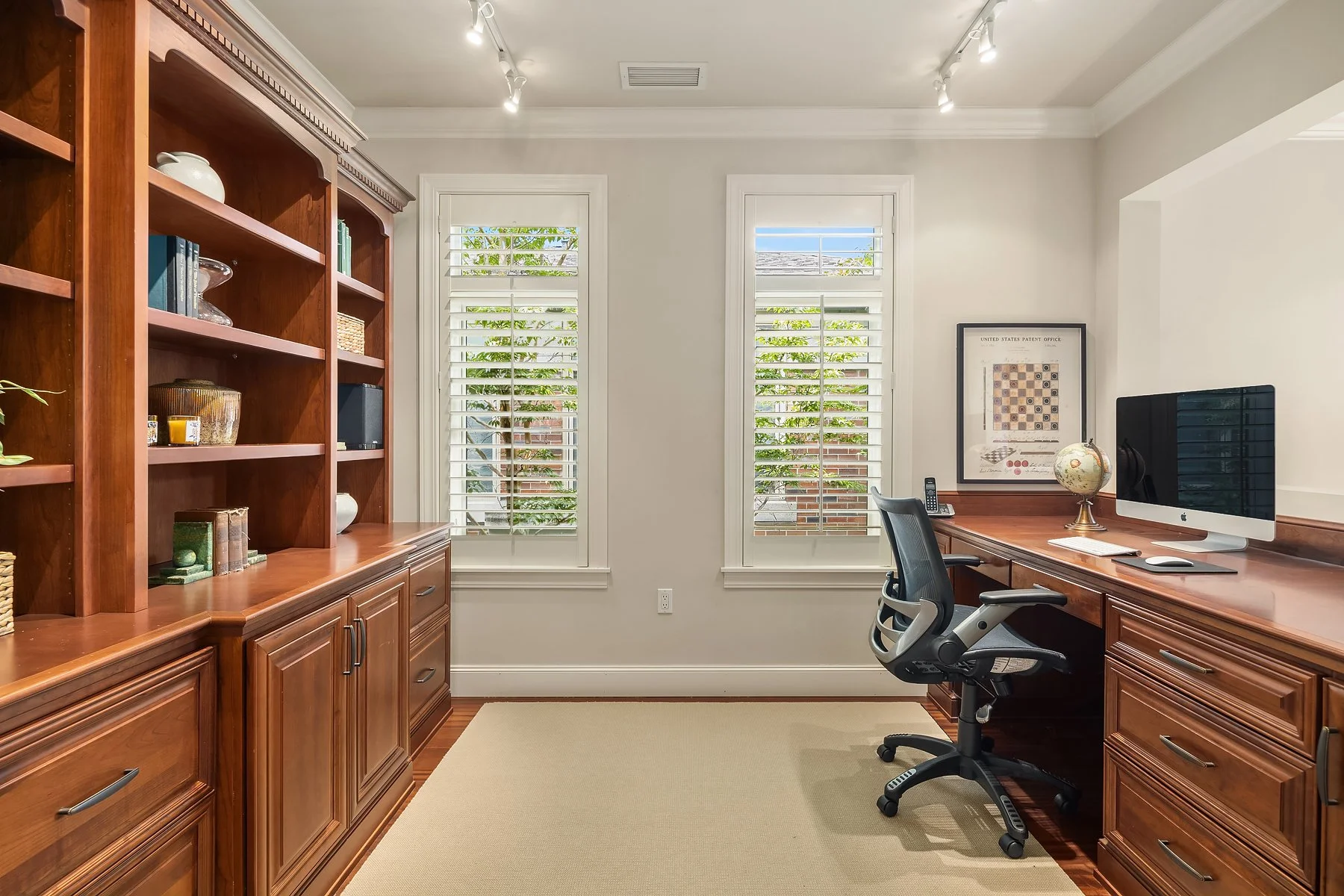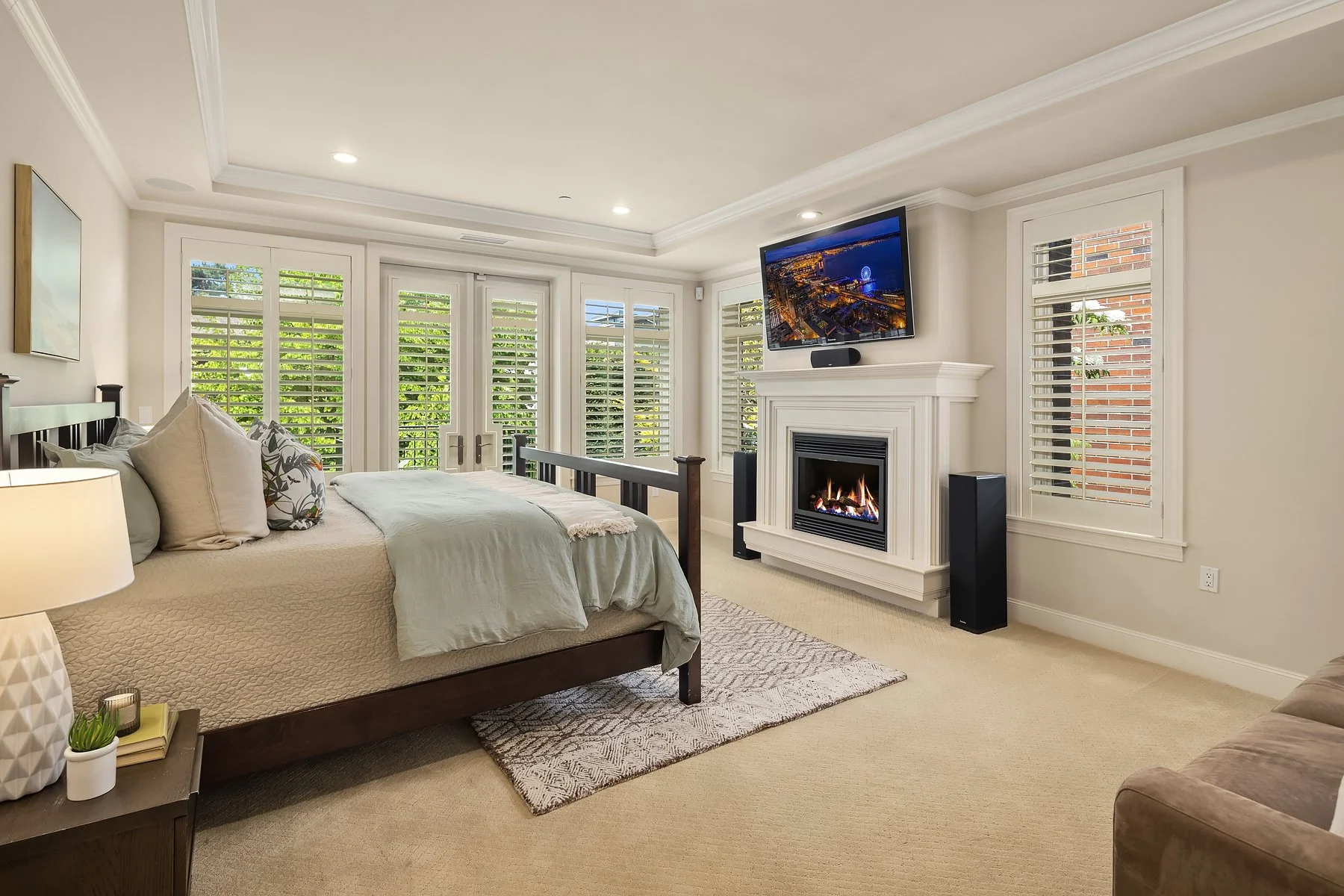 Luxurious primary suite boasts a private balcony, gas fireplace, 5-piece bath with heated floors, and a walk-in closet. Two additional bedrooms have closets with built-ins and share a ¾ bath. Pocket sliding doors open to reveal an in-home office with built-ins.