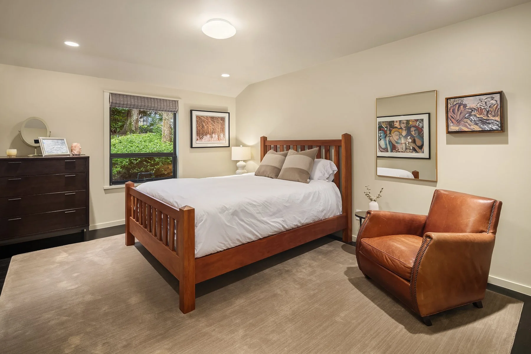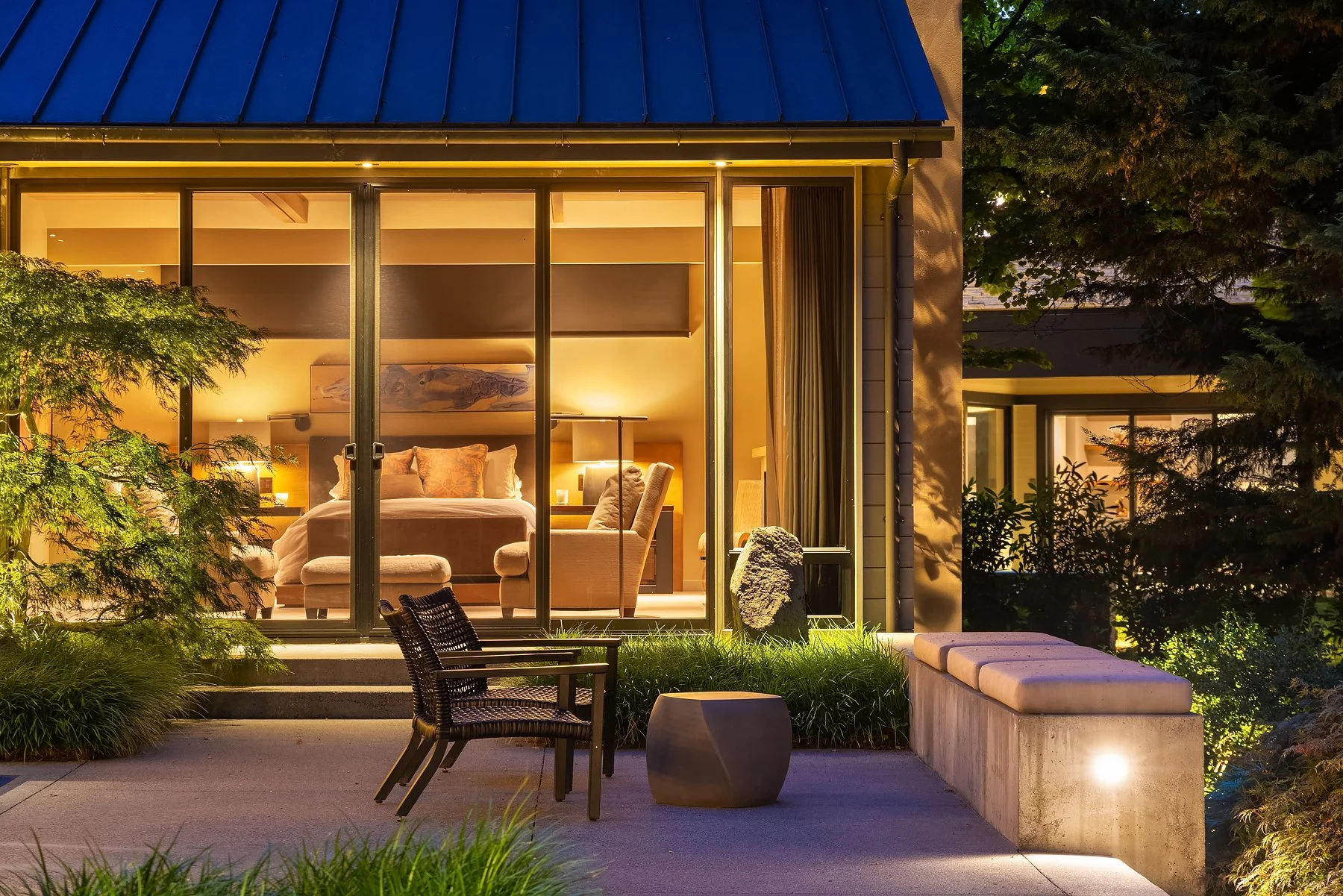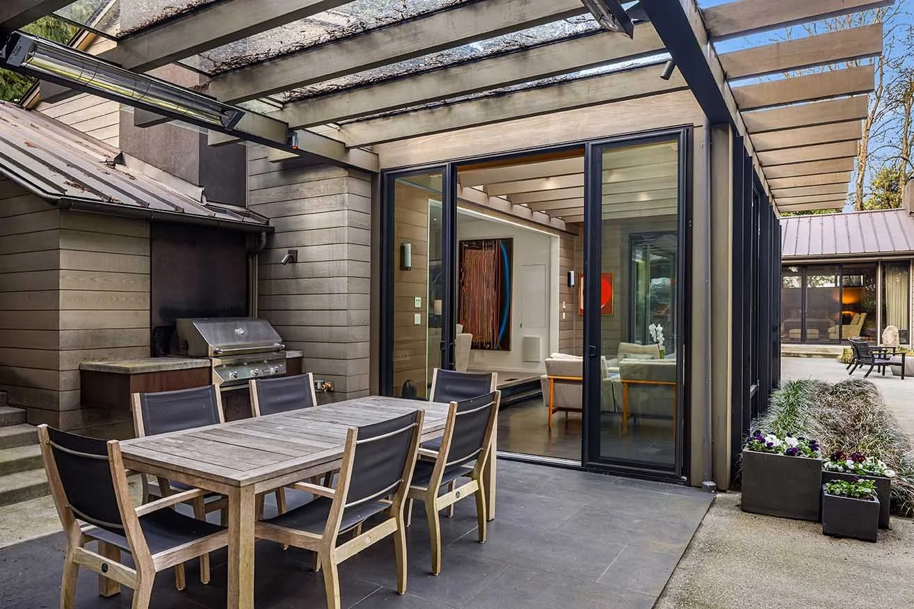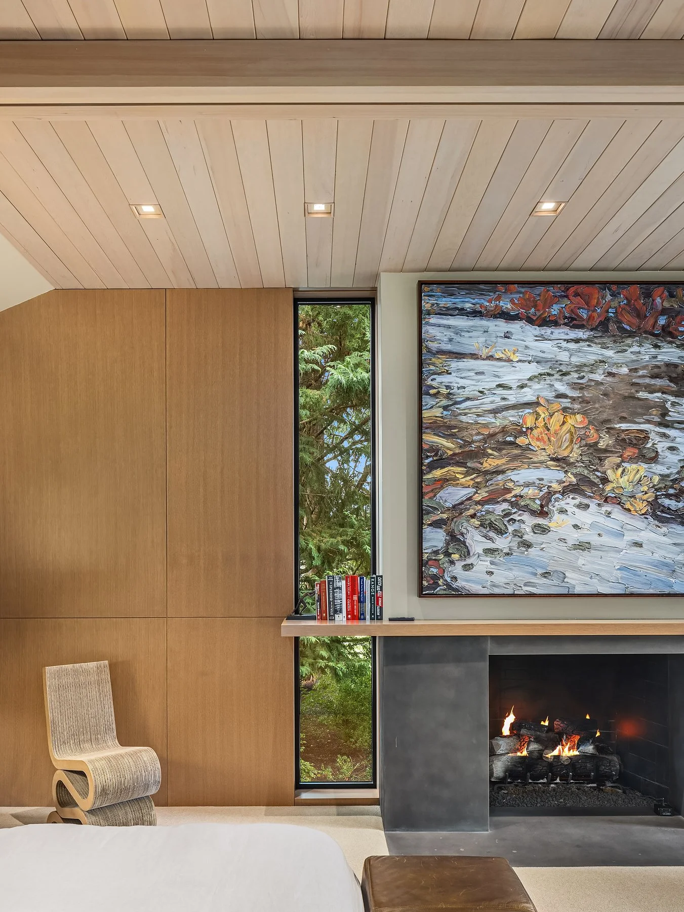 The private living spaces are all sanctuaries, with the primary suite offering a soothing bleached cedar ceiling, gas fireplace with flame sprayed nickel surround, and floor-to-ceiling doors that provide access to the grounds. The beautifully appointed spa-like bathroom offers ultimate relaxation. Additional accommodations include a flexible office/bedroom and a guest suite above the garage with its own kitchen and view balcony, ensuring privacy and comfort.