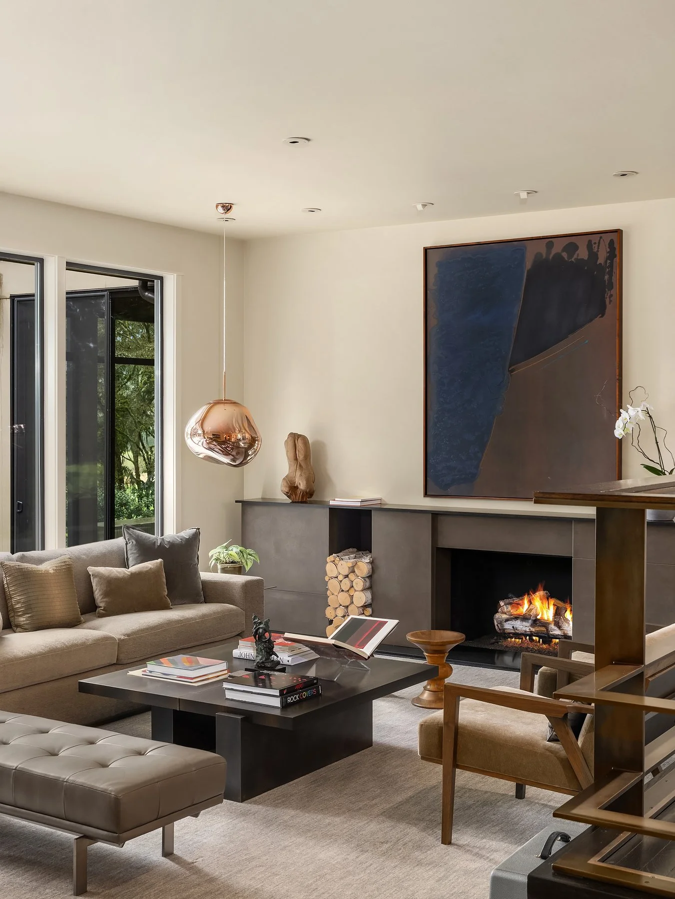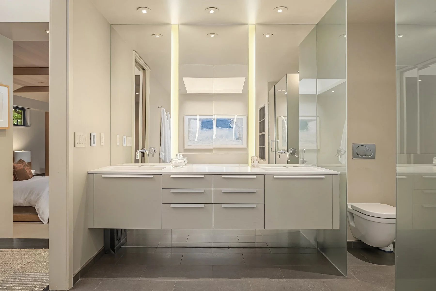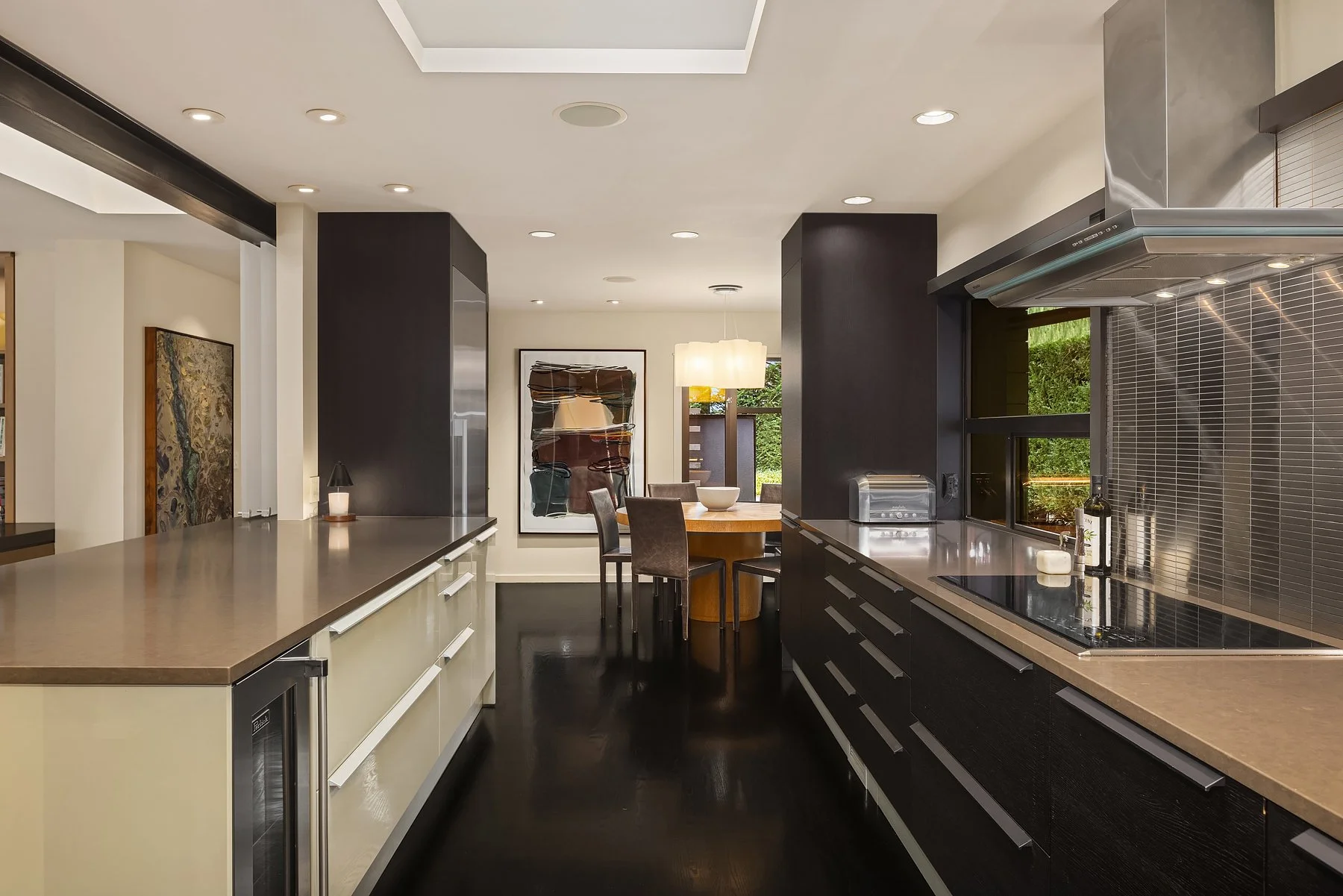 The private living spaces are all sanctuaries, with the primary suite offering a soothing bleached cedar ceiling, gas fireplace with flame sprayed nickel surround, and floor-to-ceiling doors that provide access to the grounds. The beautifully appointed spa-like bathroom offers ultimate relaxation. Additional accommodations include a flexible office/bedroom and a guest suite above the garage with its own kitchen and view balcony, ensuring privacy and comfort.