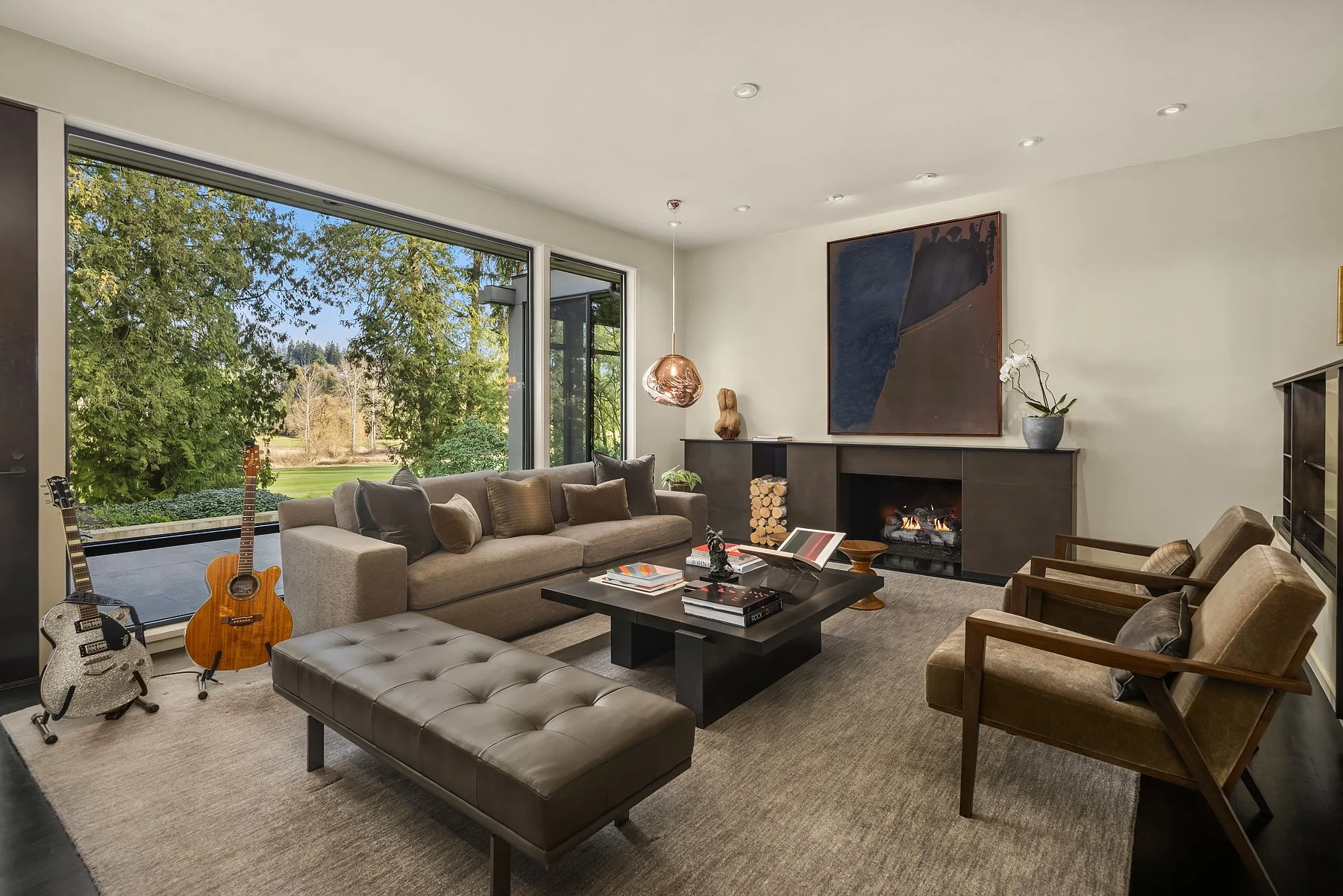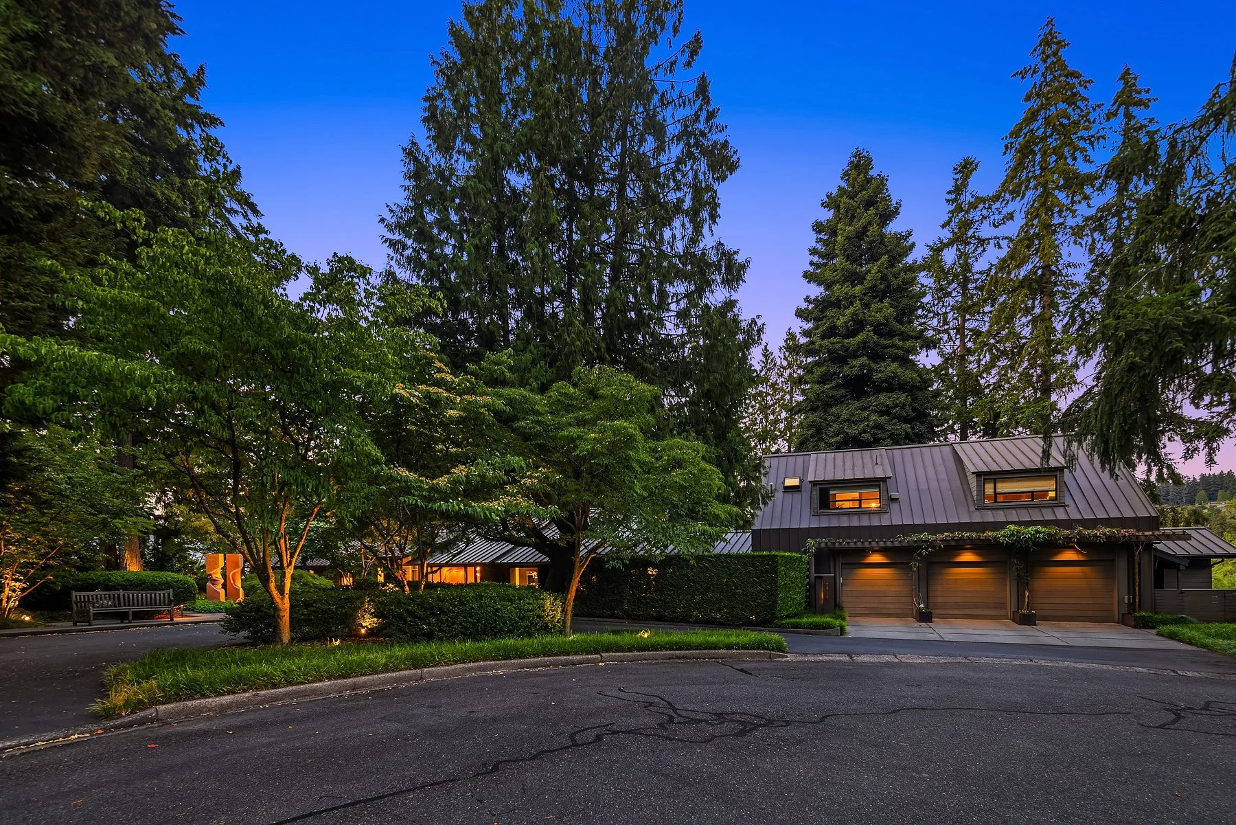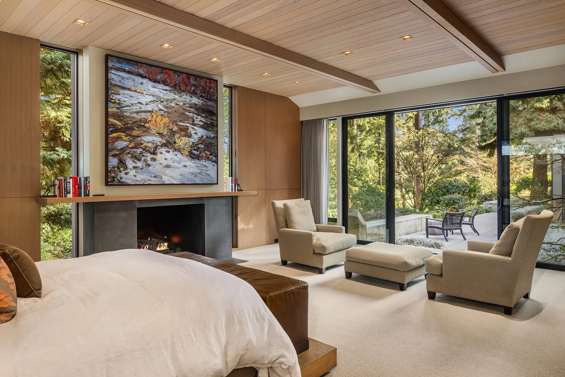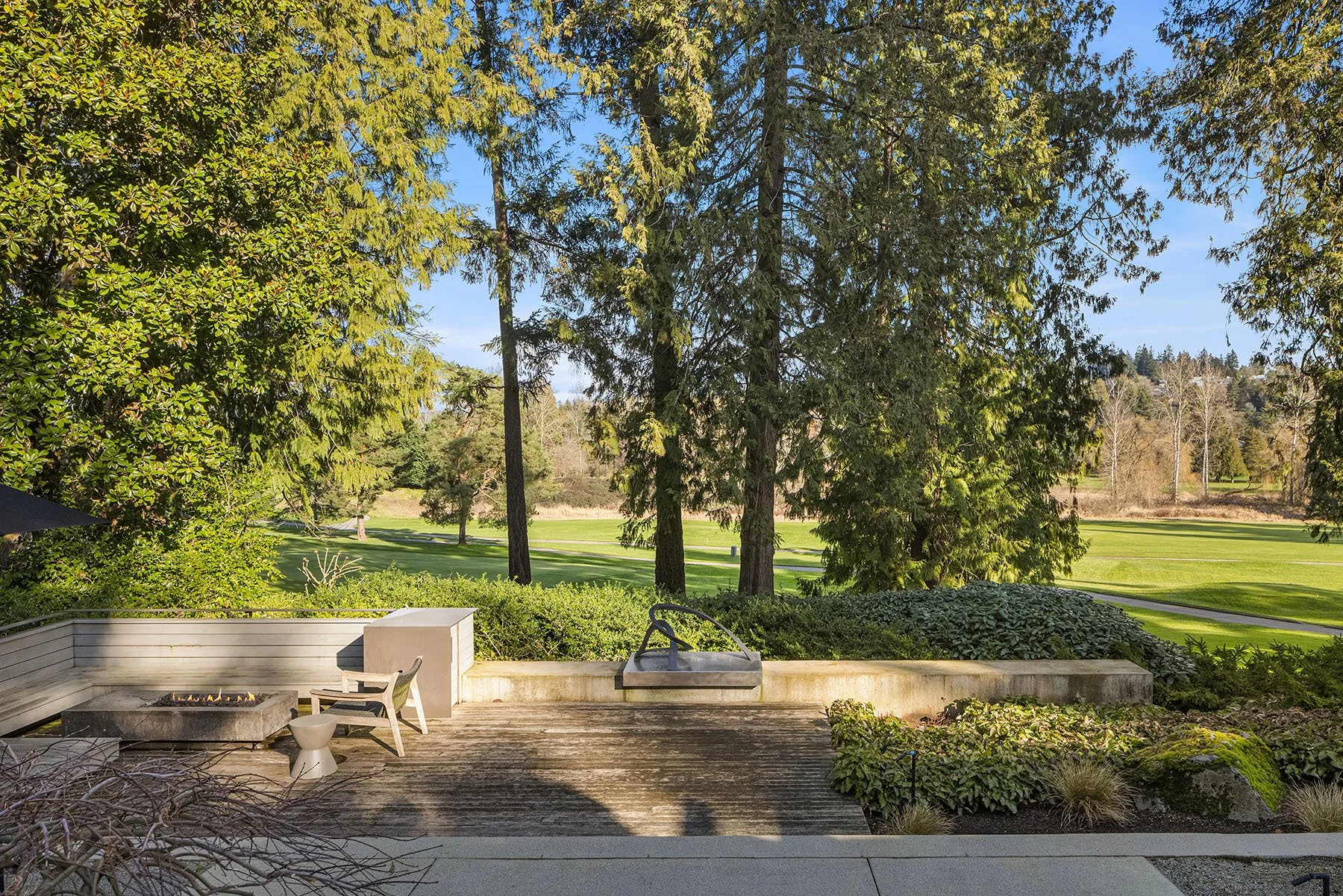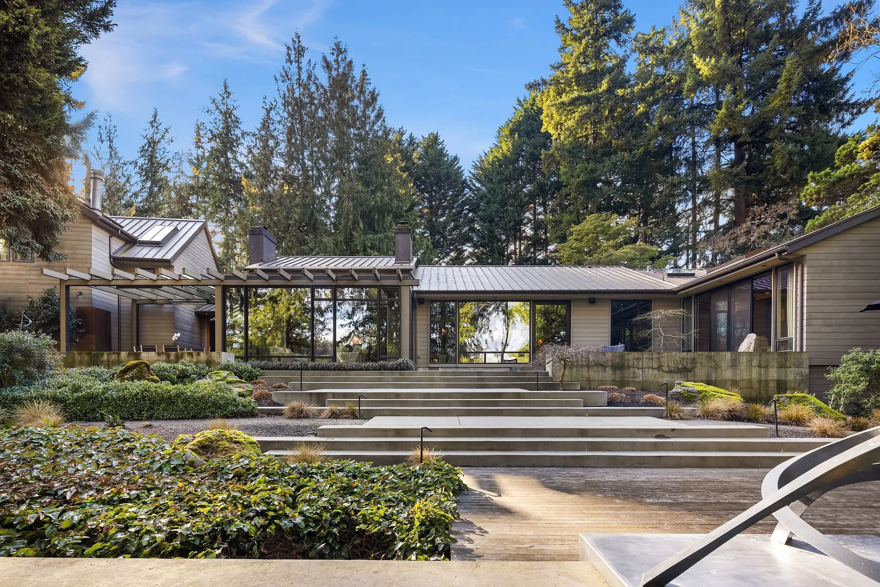Discover premier living on Medina’s beautiful Overlake Golf and Country Club. This architecturally significant PNW home enjoys a unique setting, tucked away at the end of a cul-de-sac, and offers tranquility, privacy and luxury— only minutes from downtown Bellevue and Seattle. The home greets you upon entering with expansive fairway views, and unfolds almost entirely on a single level, with rooms branching off from a central hallway with a seamless flow. The living room is adorned with floor-to-ceiling windows that capture the stunning landscape, complemented by a cozy fireplace. The elegance extends to the formal dining room and a sleek kitchen equipped with top-of-the-line appliances. A sumptuous family room is adorned with a fireplace surrounded by concrete, blackened steel and rift sawn oak cabinetry. A sunroom of cedar and glass opens up to the private, park-like setting, perfect for seamless indoor-outdoor entertainment.