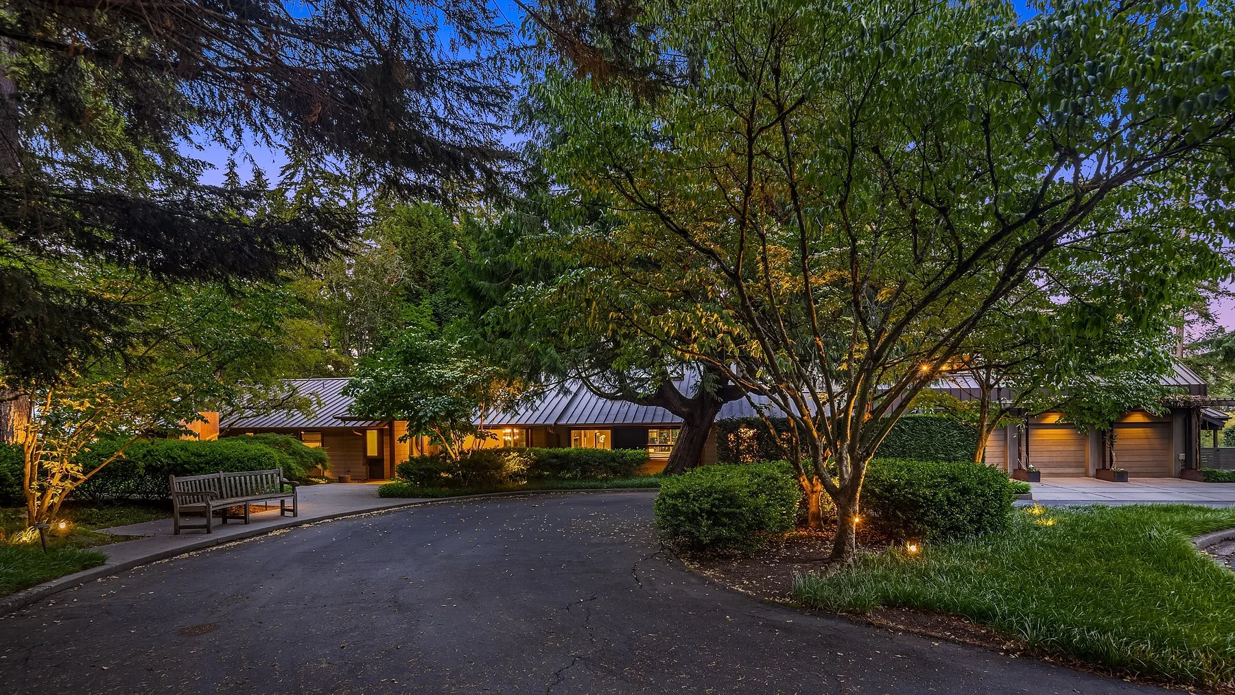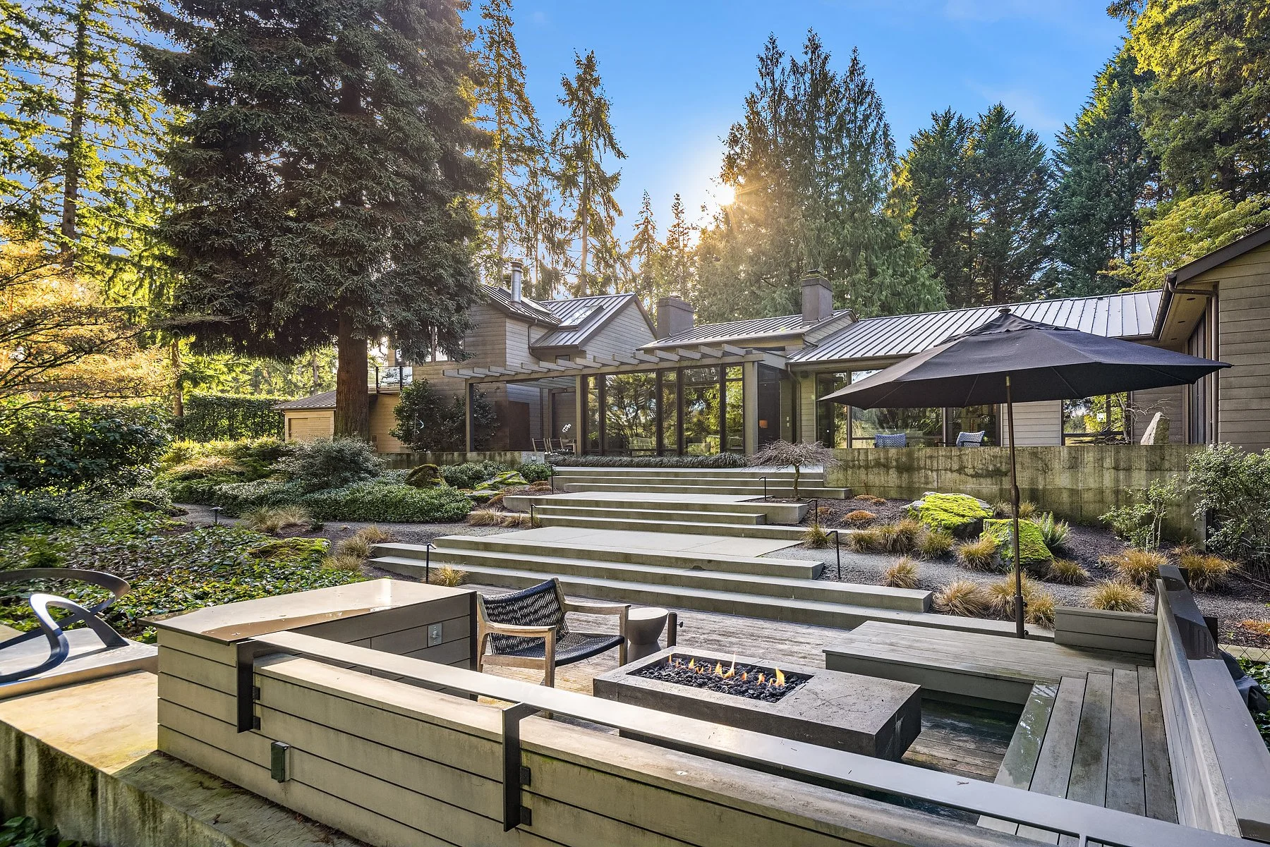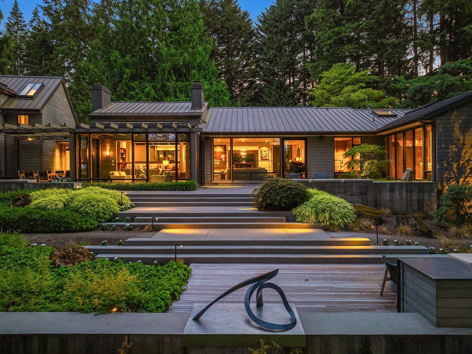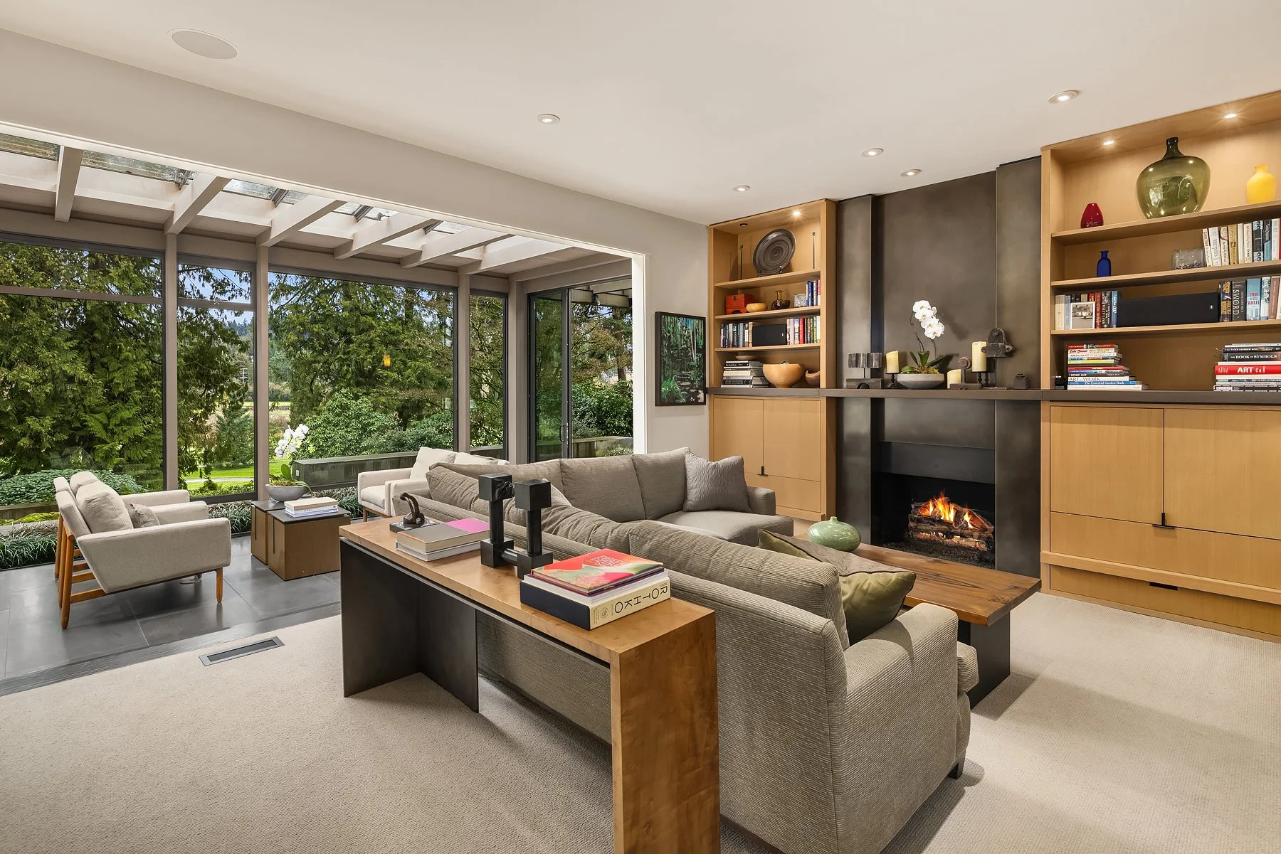 Discover premier living on Medina’s beautiful Overlake Golf and Country Club. This architecturally significant PNW home enjoys a unique setting, tucked away at the end of a cul-de-sac, and offers tranquility, privacy and luxury— only minutes from downtown Bellevue and Seattle. The home greets you upon entering with expansive fairway views, and unfolds almost entirely on a single level, with rooms branching off from a central hallway with a seamless flow. The living room is adorned with floor-to-ceiling windows that capture the stunning landscape, complemented by a cozy fireplace. The elegance extends to the formal dining room and a sleek kitchen equipped with top-of-the-line appliances. A sumptuous family room is adorned with a fireplace surrounded by concrete, blackened steel and rift sawn oak cabinetry. A sunroom of cedar and glass opens up to the private, park-like setting, perfect for seamless indoor-outdoor entertainment.