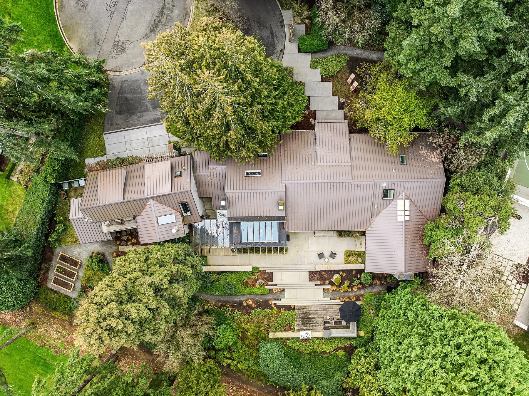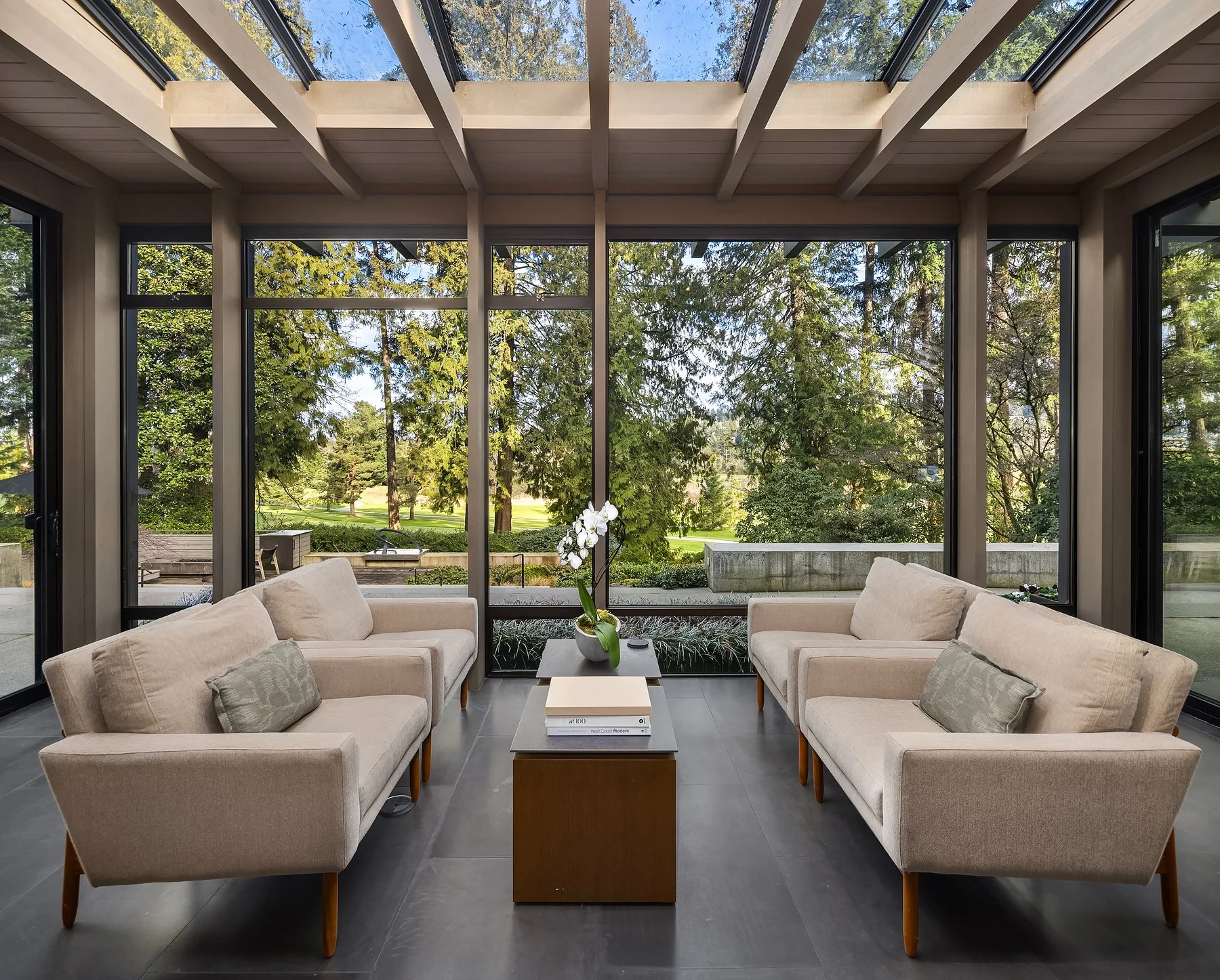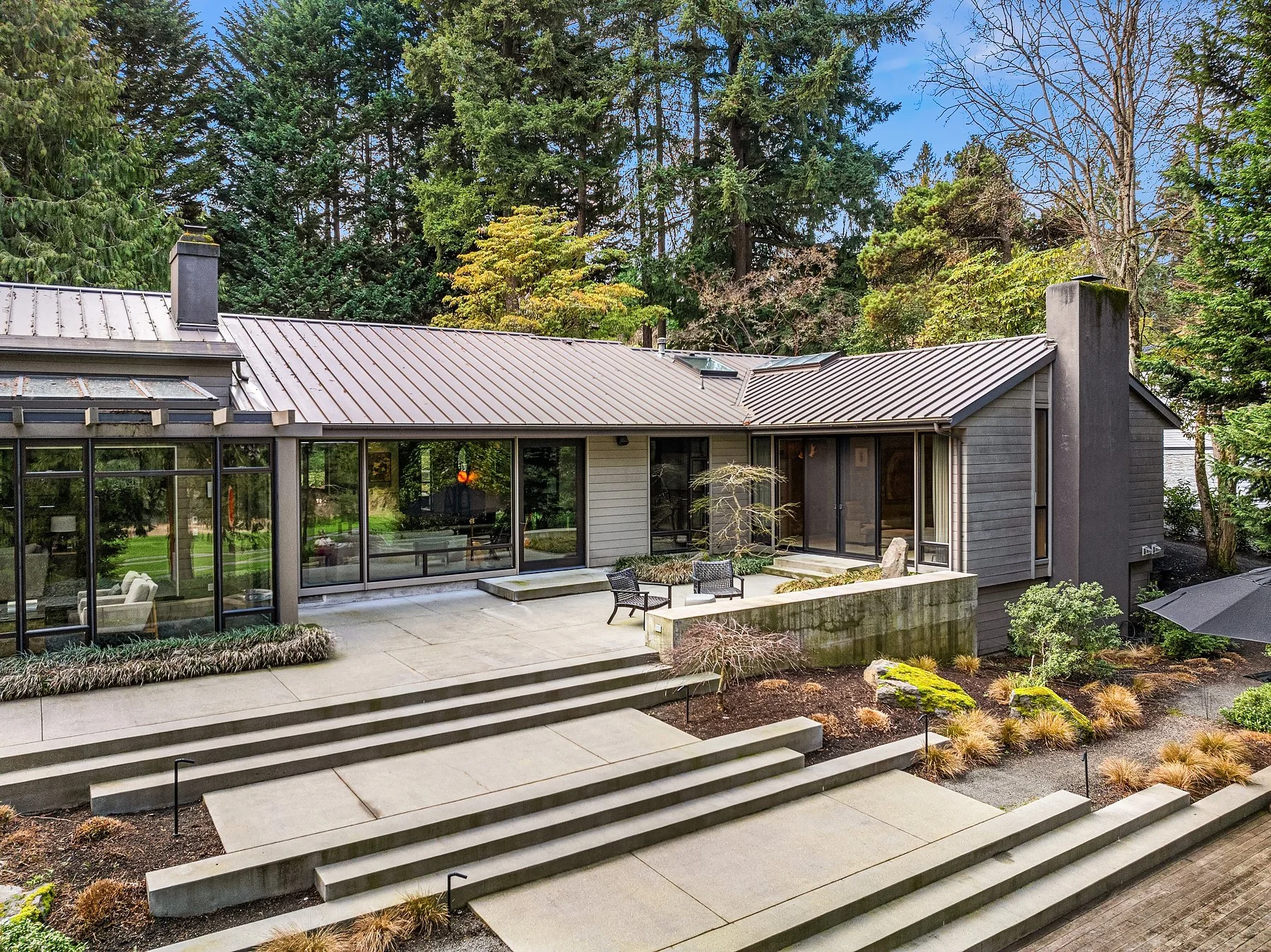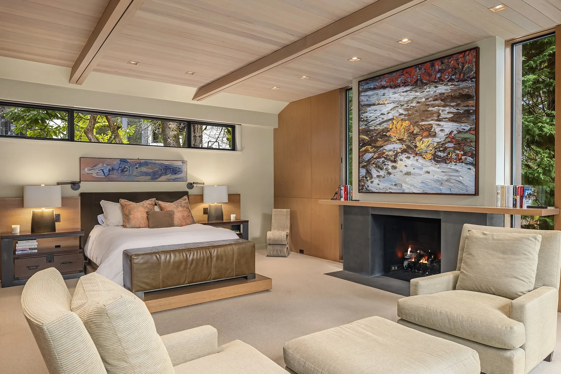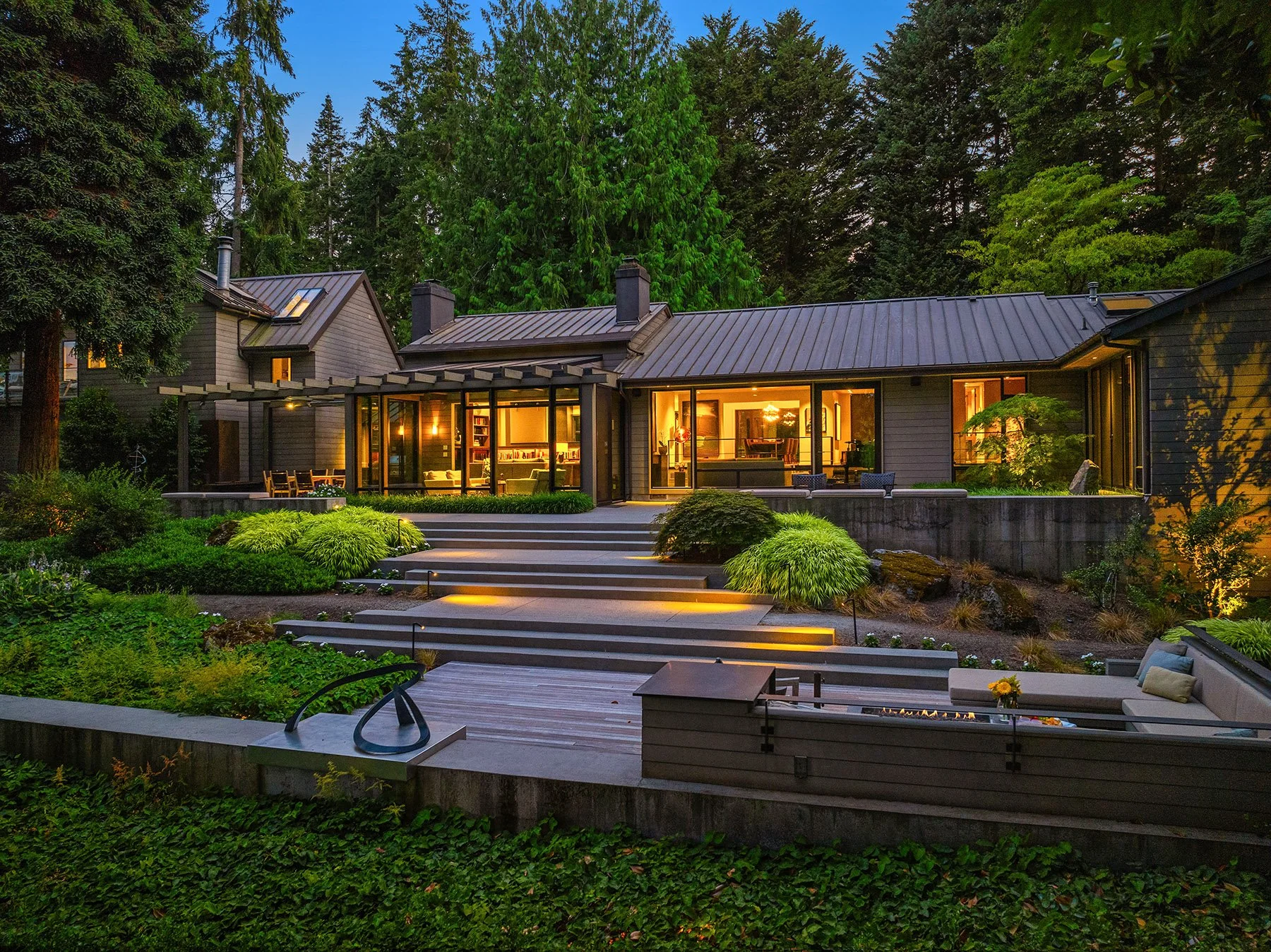 Discover premier living on Medina’s beautiful Overlake Golf and Country Club. This architecturally significant PNW home enjoys a unique setting, tucked away at the end of a cul-de-sac, and offers tranquility, privacy and luxury— only minutes from downtown Bellevue and Seattle. The home greets you upon entering with expansive fairway views, and unfolds almost entirely on a single level, with rooms branching off from a central hallway with a seamless flow. The living room is adorned with floor-to-ceiling windows that capture the stunning landscape, complemented by a cozy fireplace. The elegance extends to the formal dining room and a sleek kitchen equipped with top-of-the-line appliances. A sumptuous family room is adorned with a fireplace surrounded by concrete, blackened steel and rift sawn oak cabinetry. A sunroom of cedar and glass opens up to the private, park-like setting, perfect for seamless indoor-outdoor entertainment.