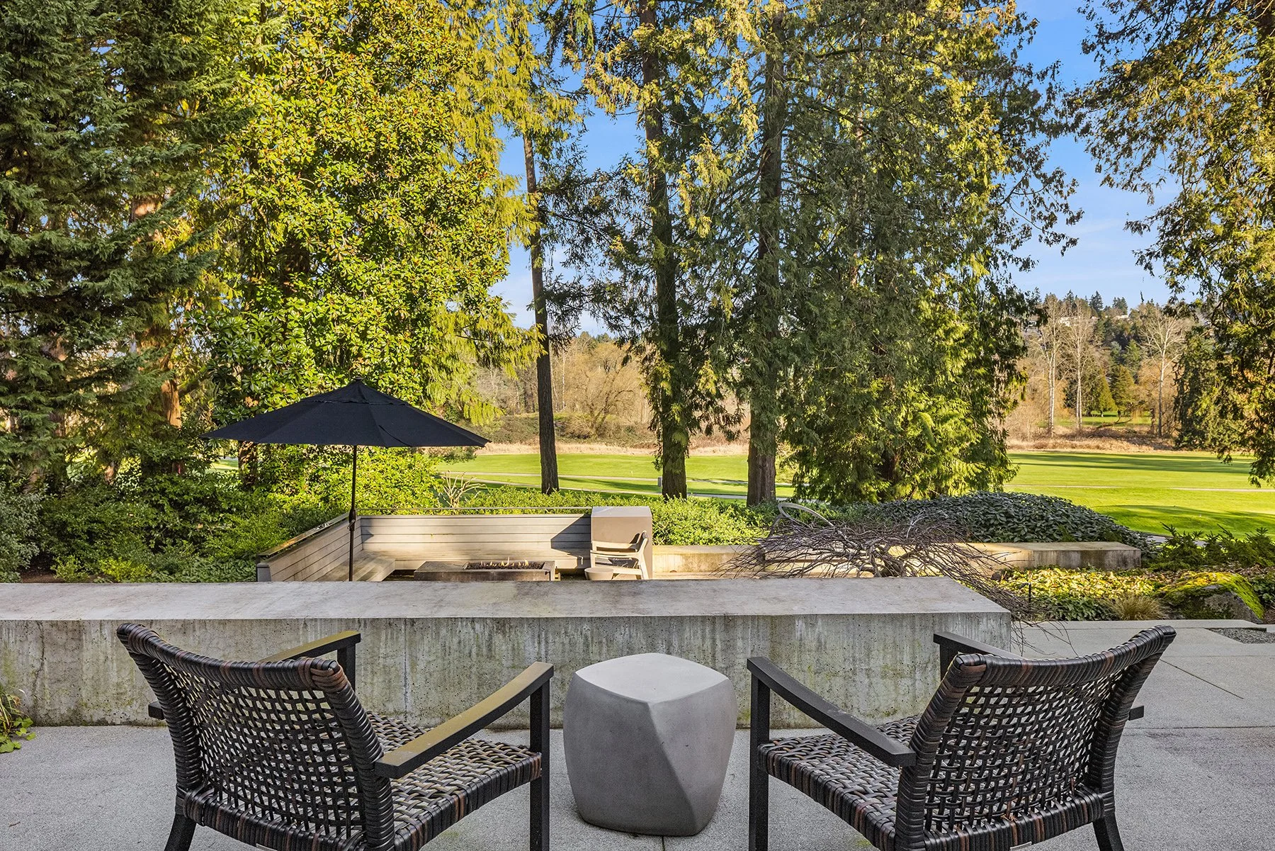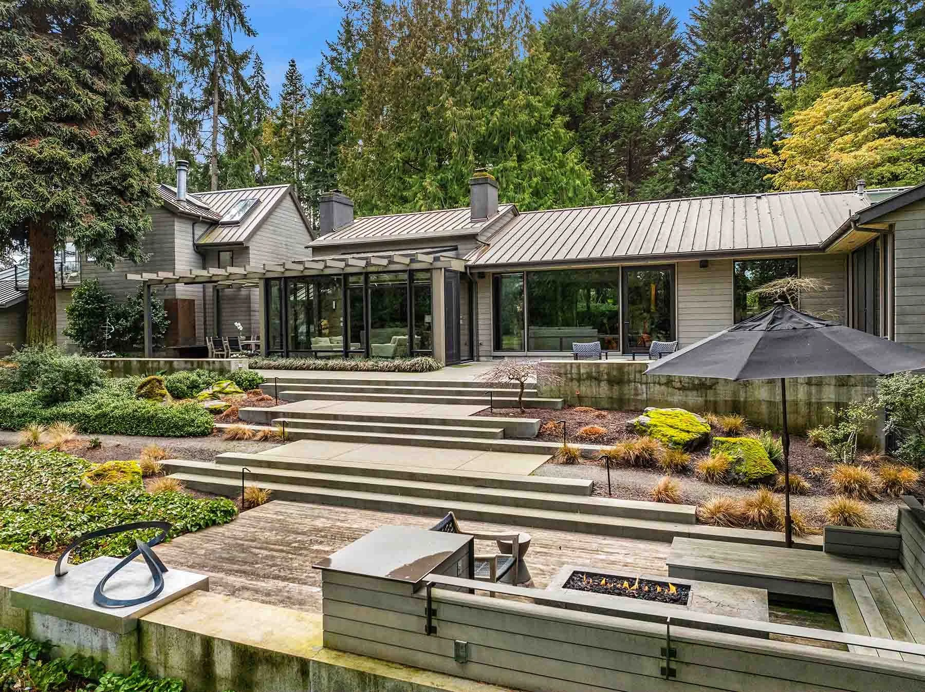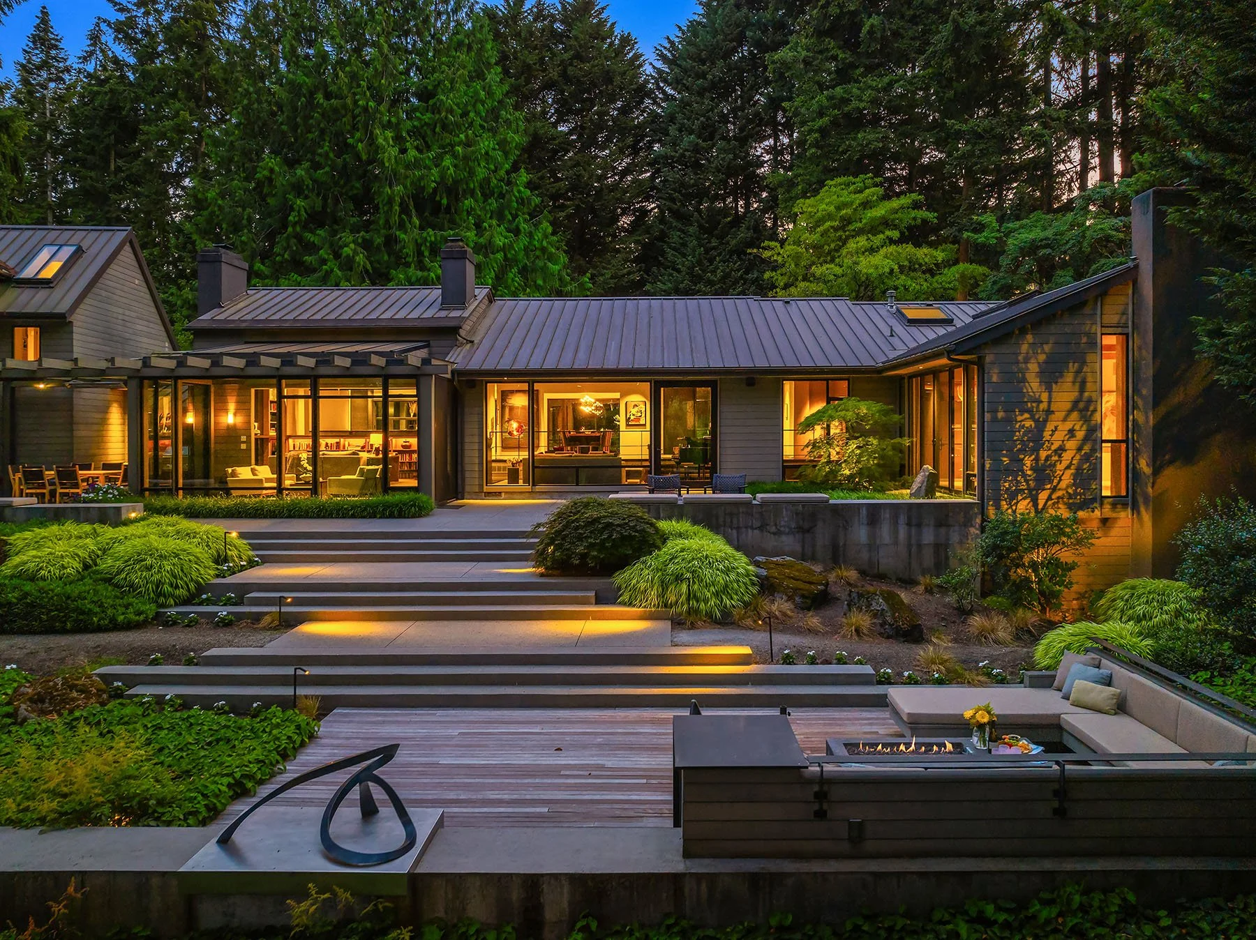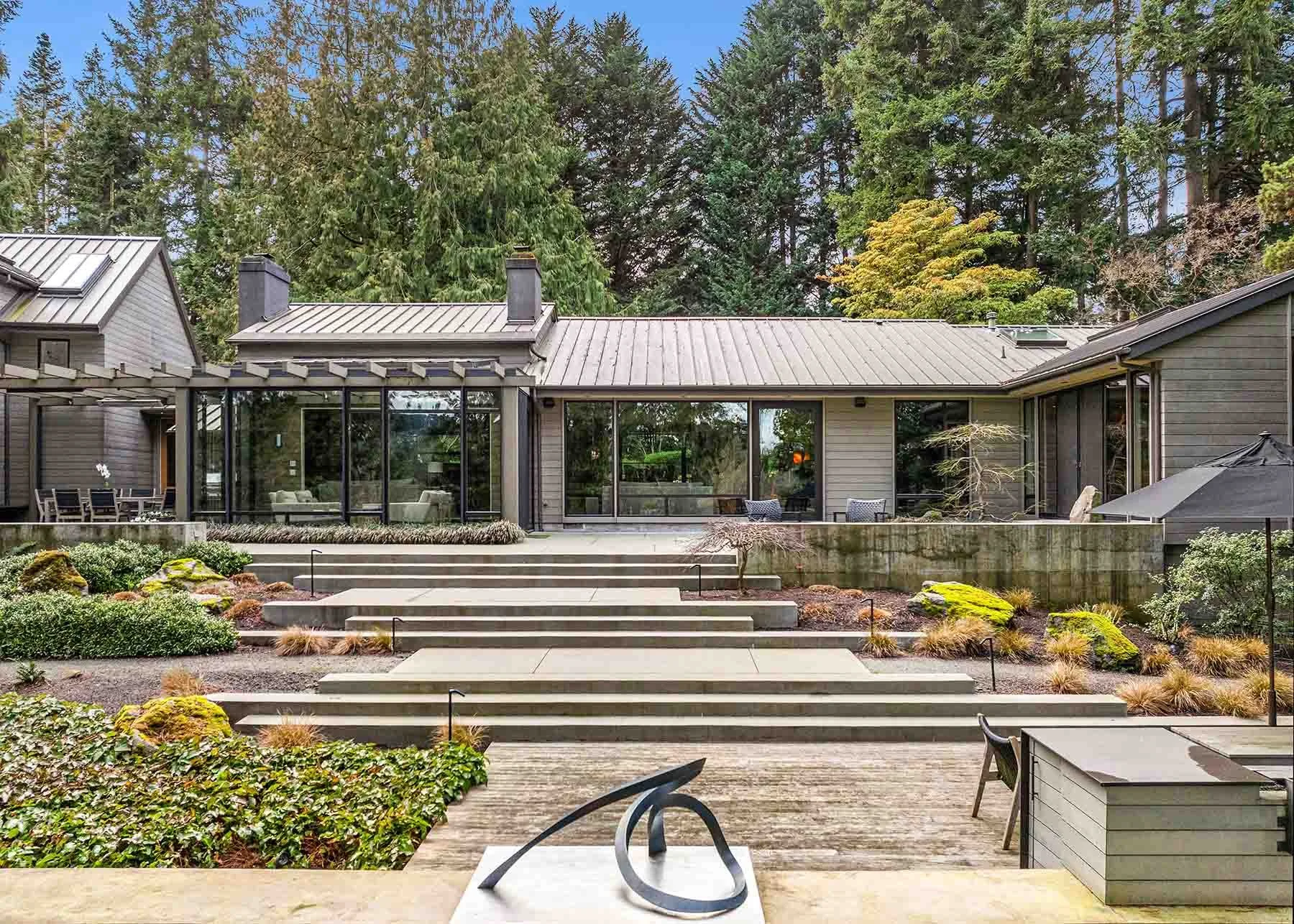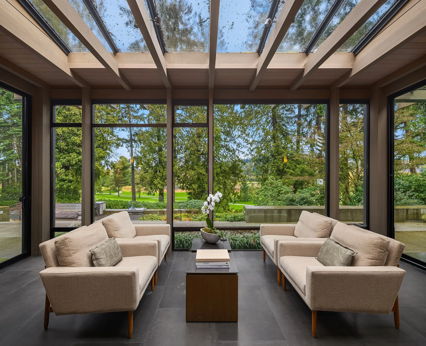 Discover premier living on Medina’s beautiful Overlake Golf and Country Club. This architecturally significant PNW home enjoys a unique setting, tucked away at the end of a cul-de-sac, and offers tranquility, privacy and luxury— only minutes from downtown Bellevue and Seattle. The home greets you upon entering with expansive fairway views, and unfolds almost entirely on a single level, with rooms branching off from a central hallway with a seamless flow. The living room is adorned with floor-to-ceiling windows that capture the stunning landscape, complemented by a cozy fireplace. The elegance extends to the formal dining room and a sleek kitchen equipped with top-of-the-line appliances. A sumptuous family room is adorned with a fireplace surrounded by concrete, blackened steel and rift sawn oak cabinetry. A sunroom of cedar and glass opens up to the private, park-like setting, perfect for seamless indoor-outdoor entertainment.