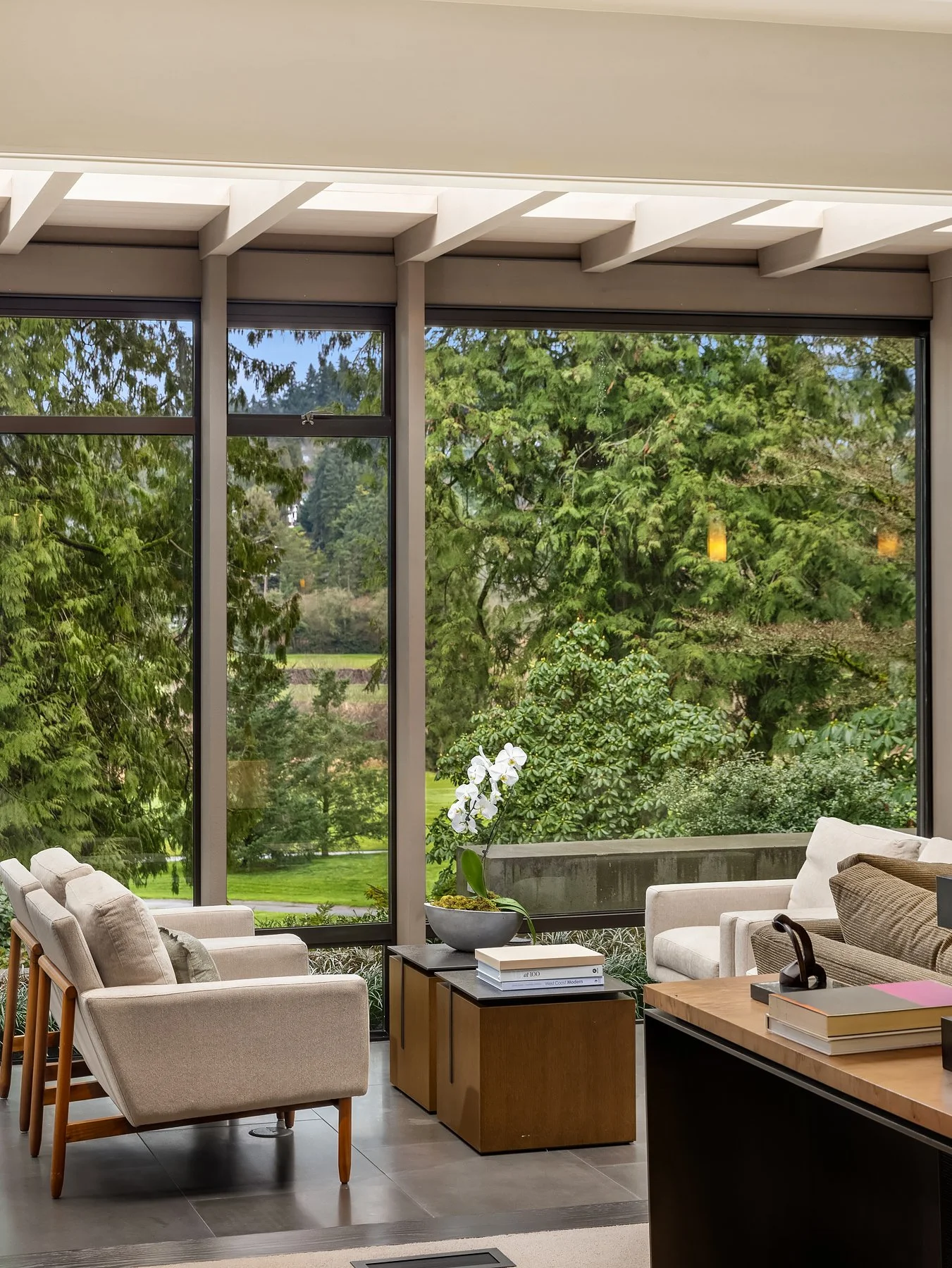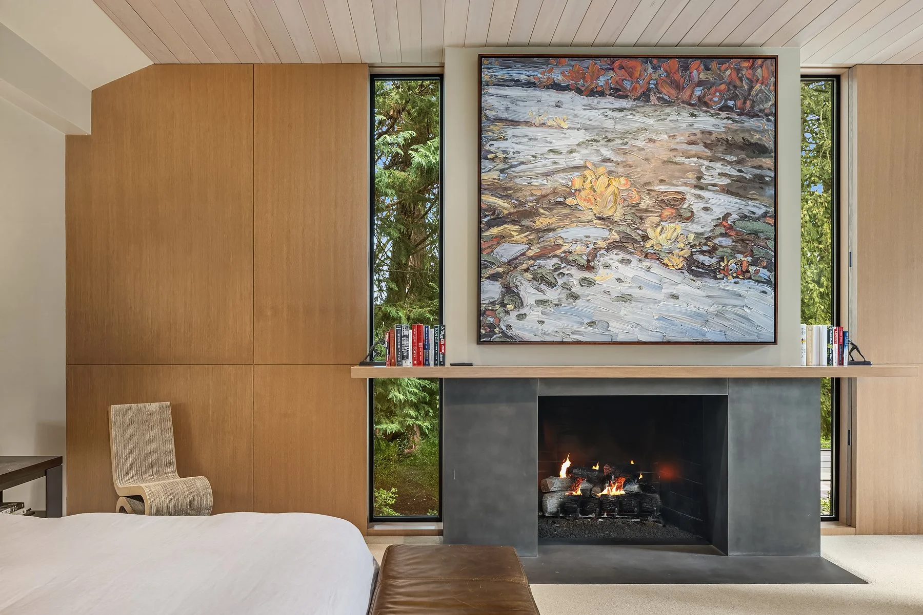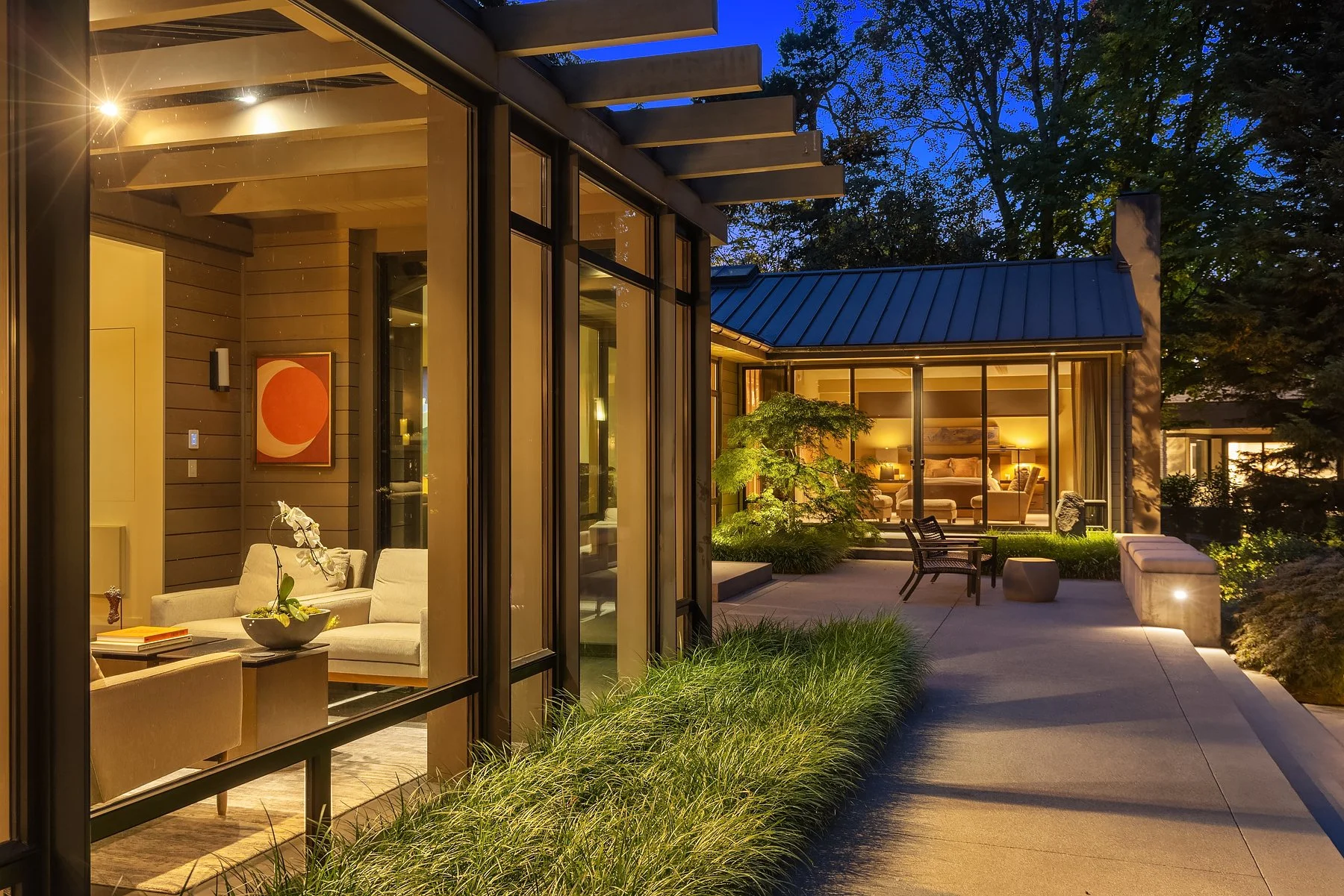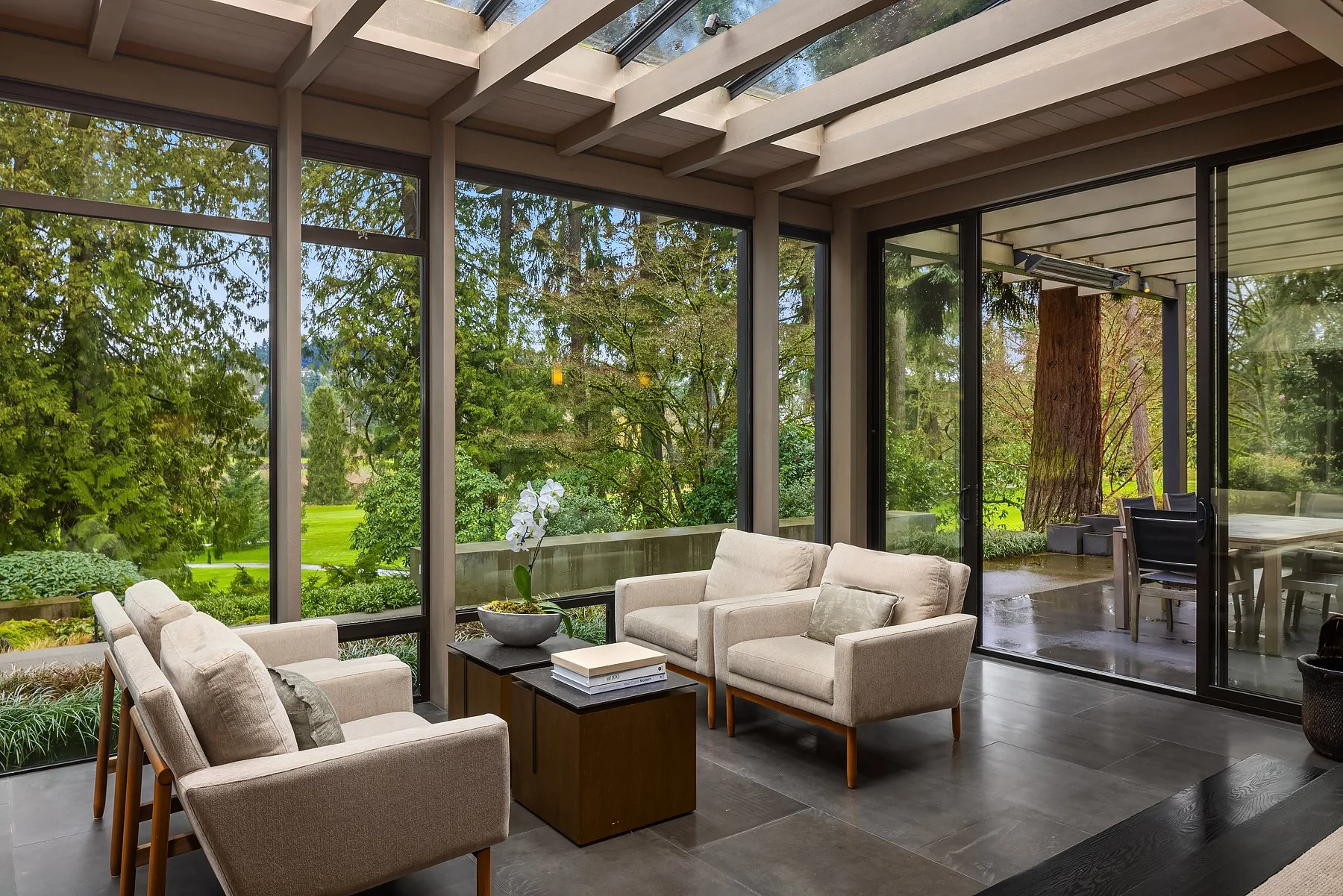 Discover premier living on Medina’s beautiful Overlake Golf and Country Club. This architecturally significant PNW home enjoys a unique setting, tucked away at the end of a cul-de-sac, and offers tranquility, privacy and luxury— only minutes from downtown Bellevue and Seattle. The home greets you upon entering with expansive fairway views, and unfolds almost entirely on a single level, with rooms branching off from a central hallway with a seamless flow. The living room is adorned with floor-to-ceiling windows that capture the stunning landscape, complemented by a cozy fireplace. The elegance extends to the formal dining room and a sleek kitchen equipped with top-of-the-line appliances. A sumptuous family room is adorned with a fireplace surrounded by concrete, blackened steel and rift sawn oak cabinetry. A sunroom of cedar and glass opens up to the private, park-like setting, perfect for seamless indoor-outdoor entertainment.