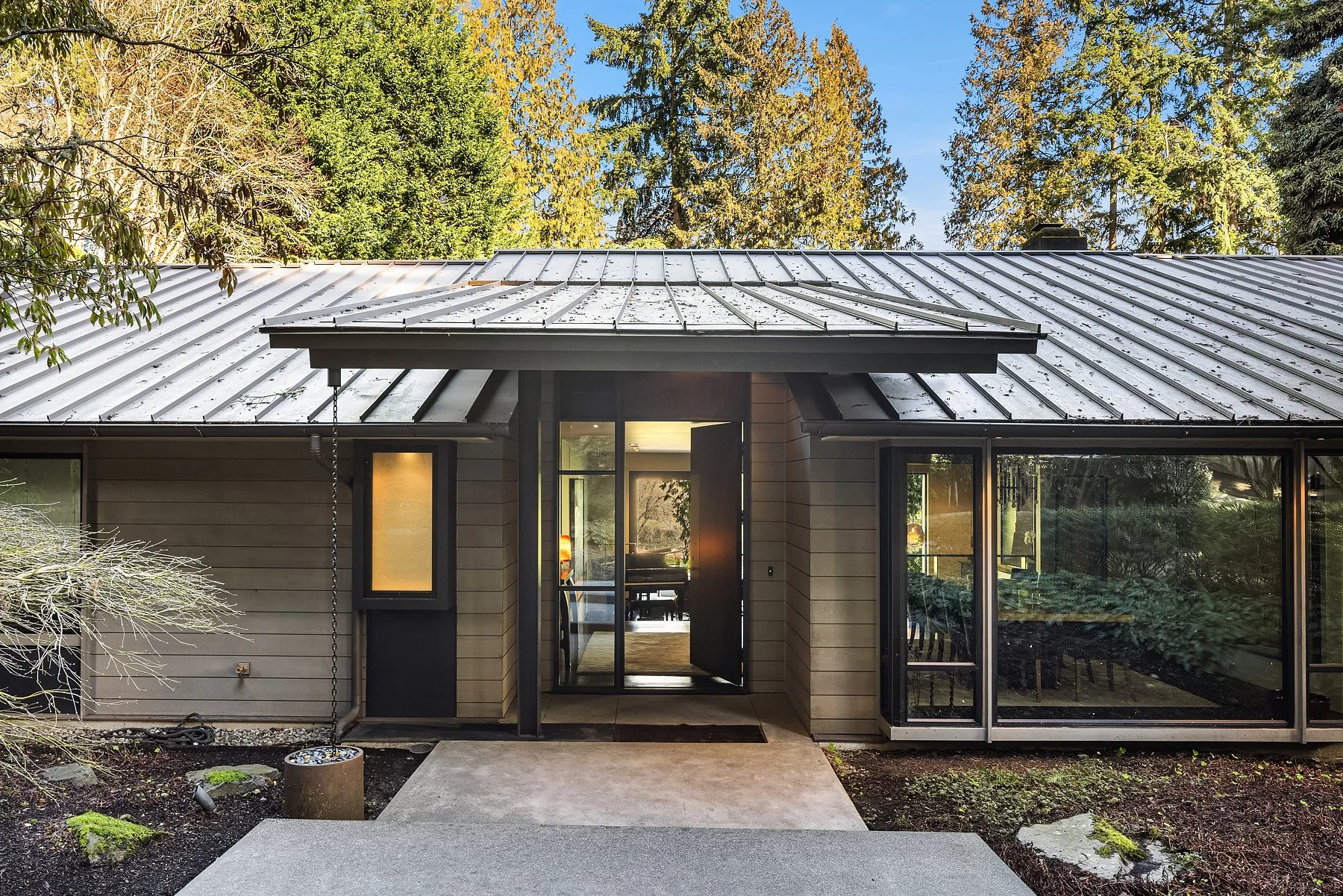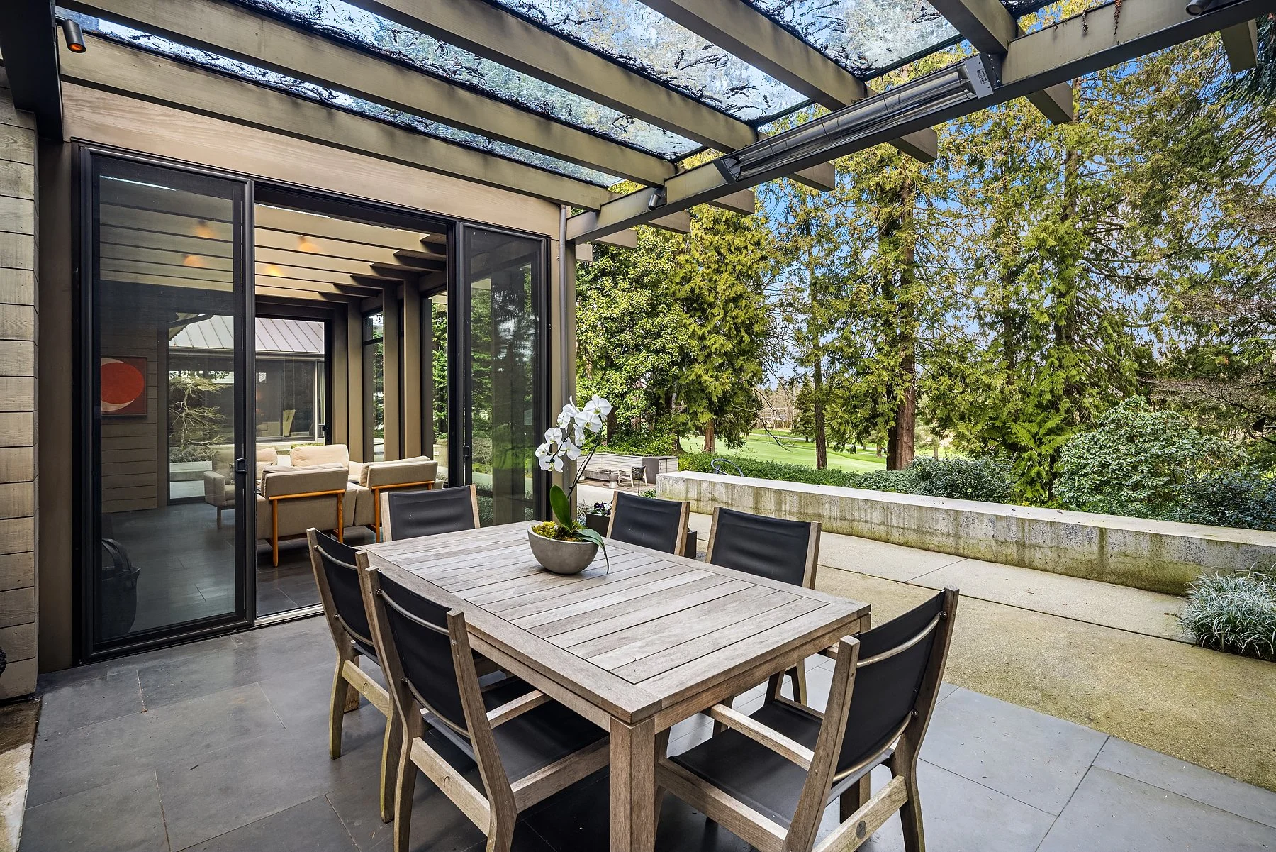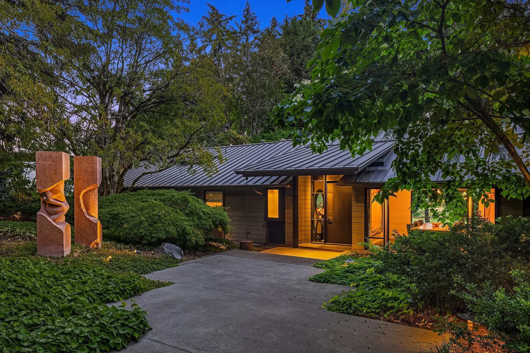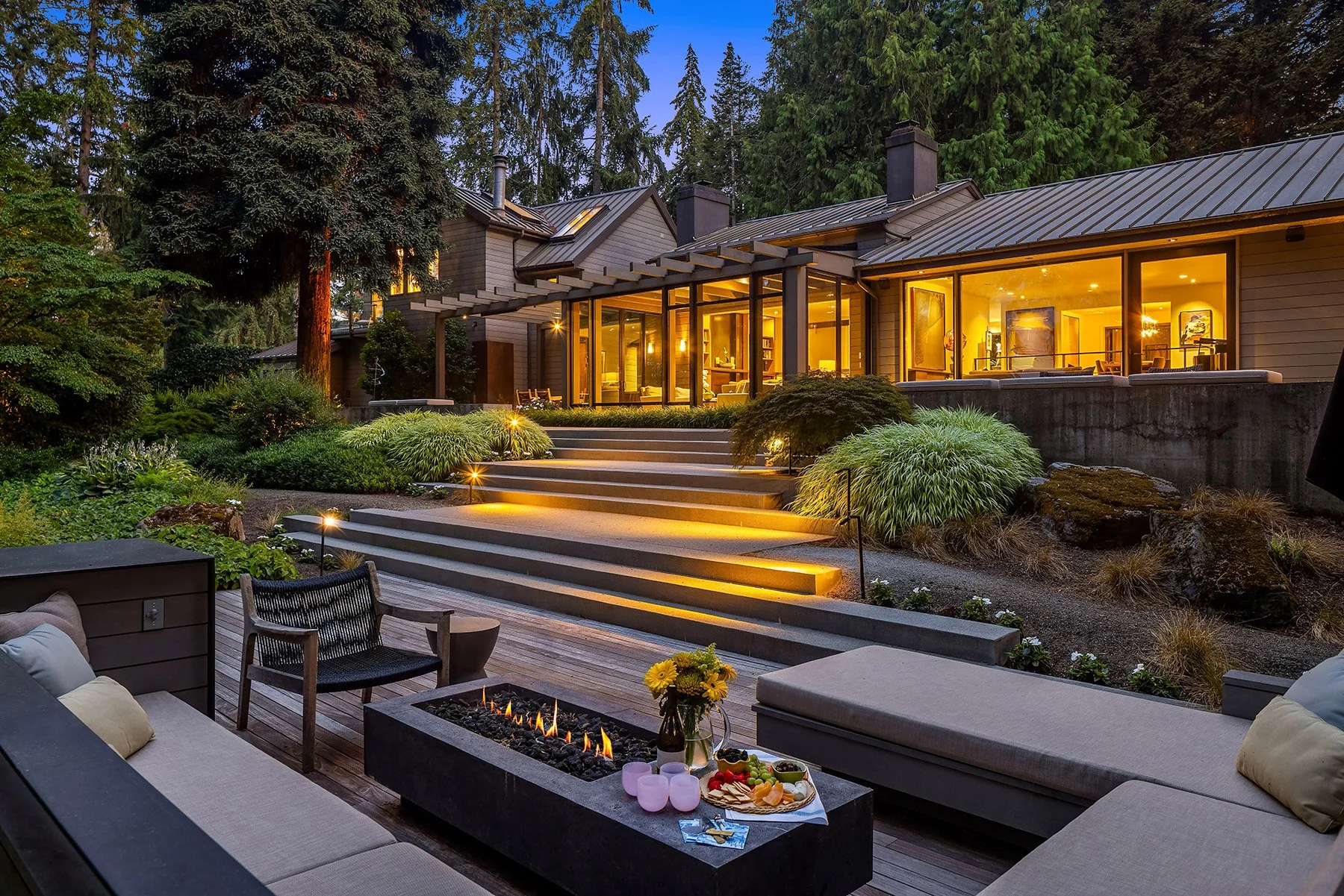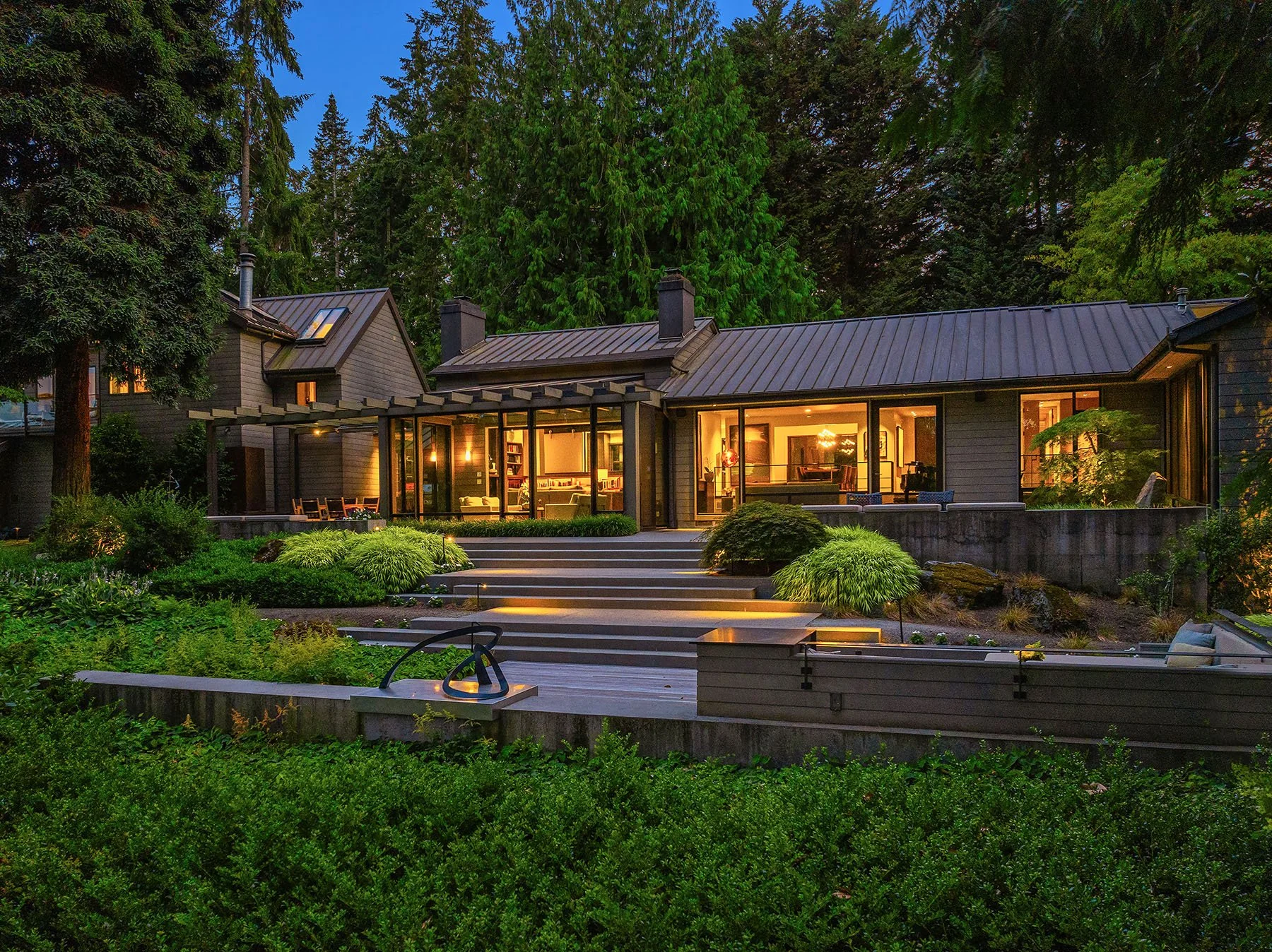 Discover premier living on Medina’s beautiful Overlake Golf and Country Club. This architecturally significant PNW home enjoys a unique setting, tucked away at the end of a cul-de-sac, and offers tranquility, privacy and luxury— only minutes from downtown Bellevue and Seattle. The home greets you upon entering with expansive fairway views, and unfolds almost entirely on a single level, with rooms branching off from a central hallway with a seamless flow. The living room is adorned with floor-to-ceiling windows that capture the stunning landscape, complemented by a cozy fireplace. The elegance extends to the formal dining room and a sleek kitchen equipped with top-of-the-line appliances. A sumptuous family room is adorned with a fireplace surrounded by concrete, blackened steel and rift sawn oak cabinetry. A sunroom of cedar and glass opens up to the private, park-like setting, perfect for seamless indoor-outdoor entertainment.