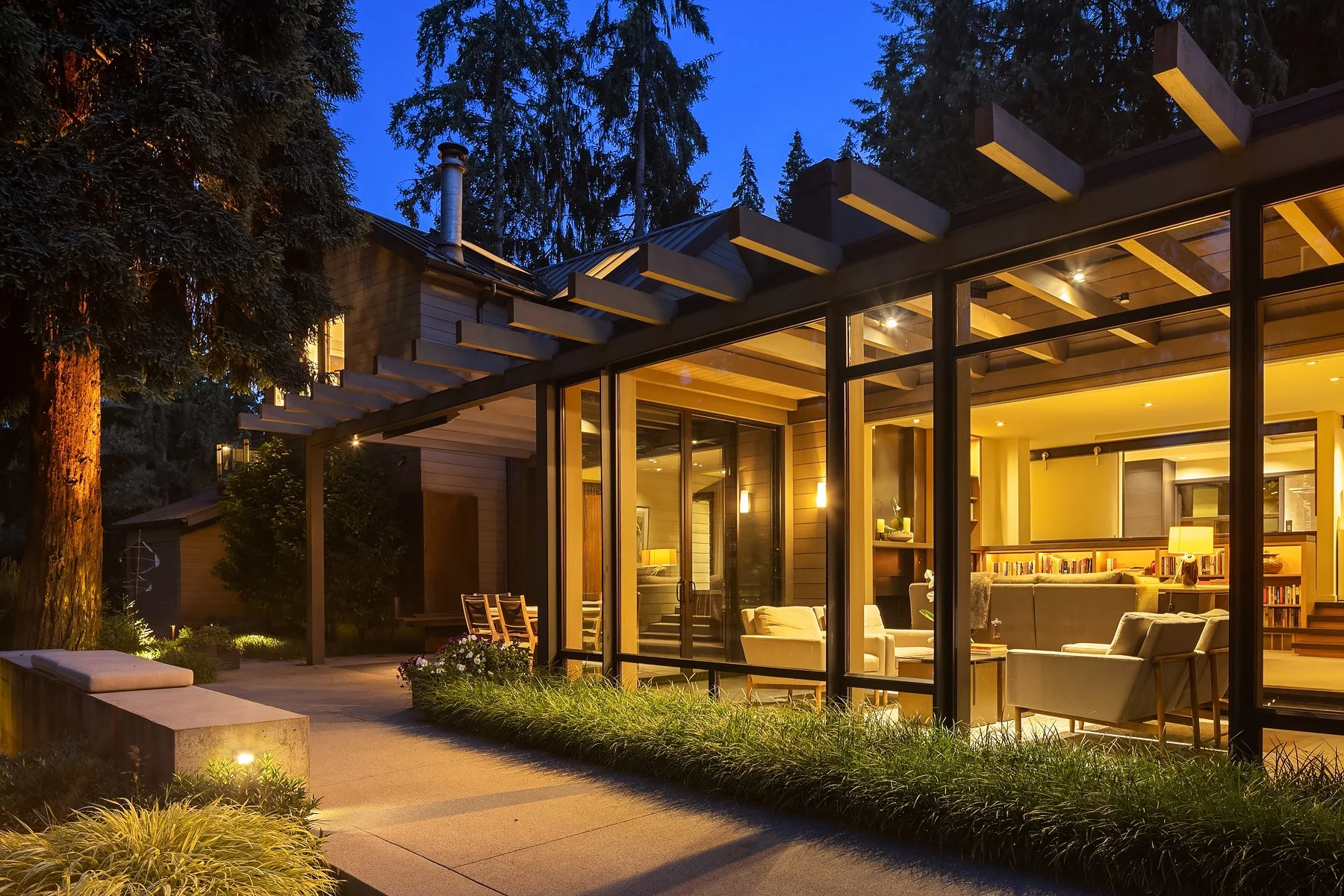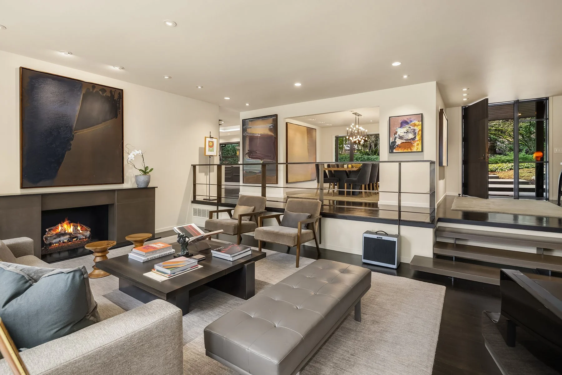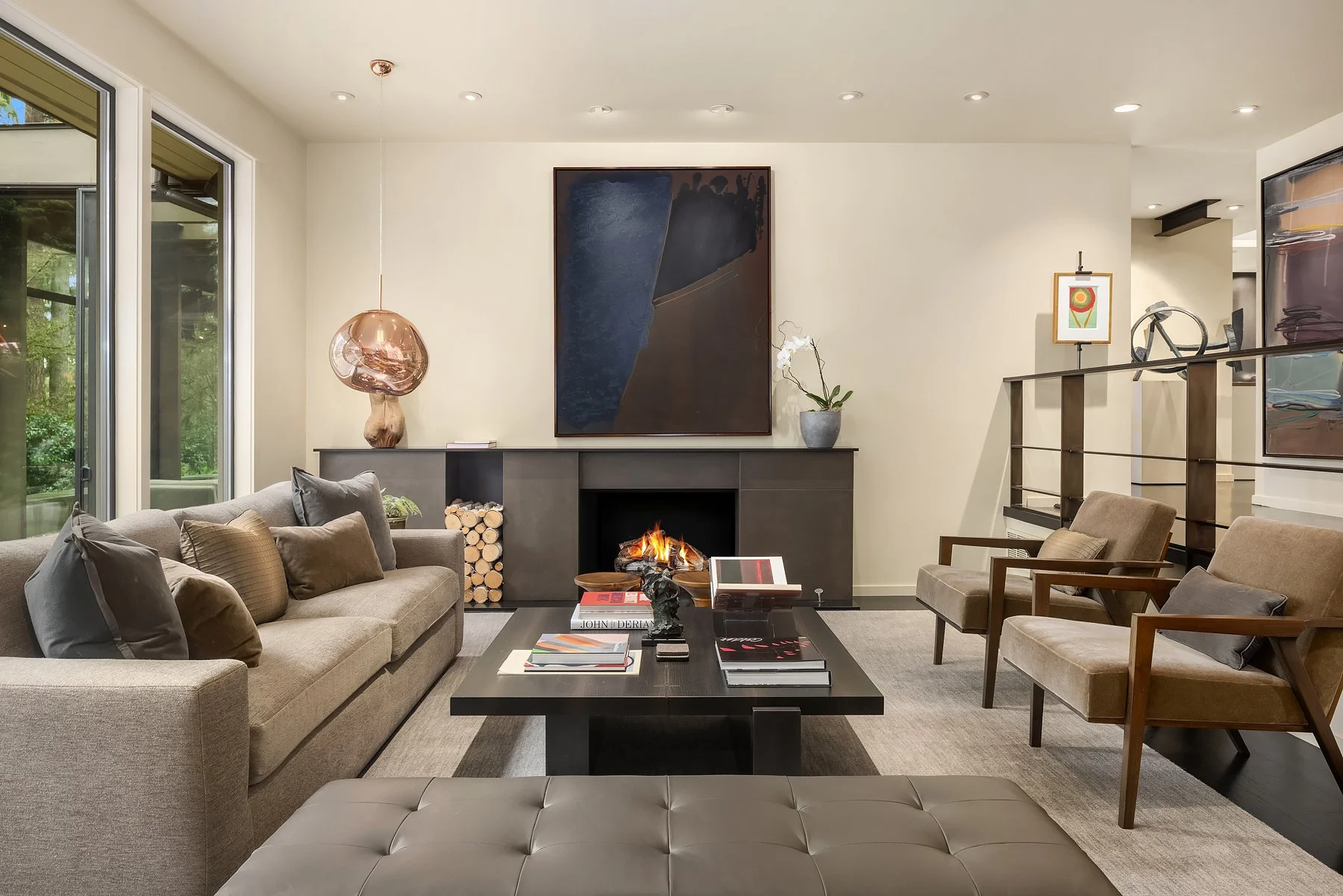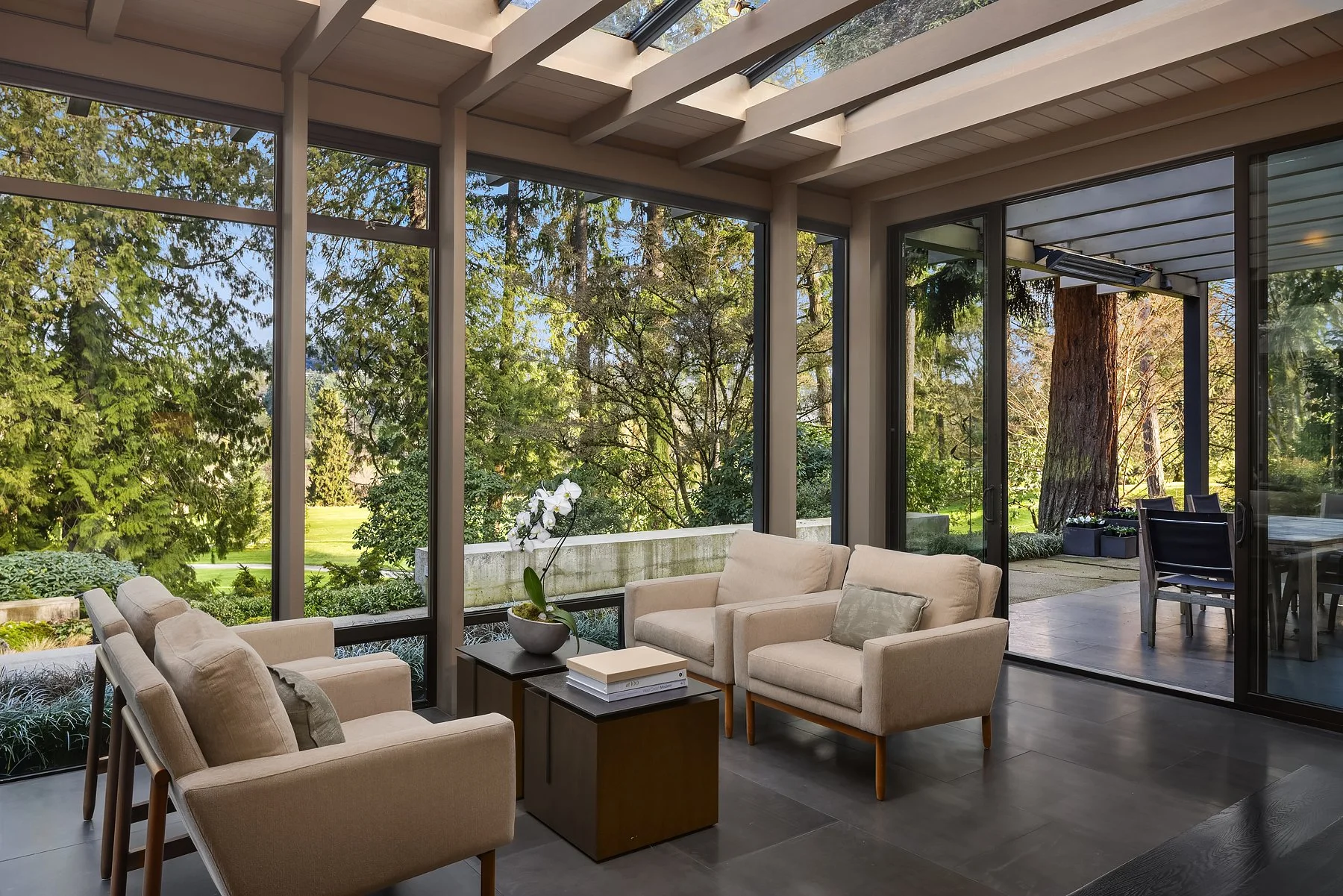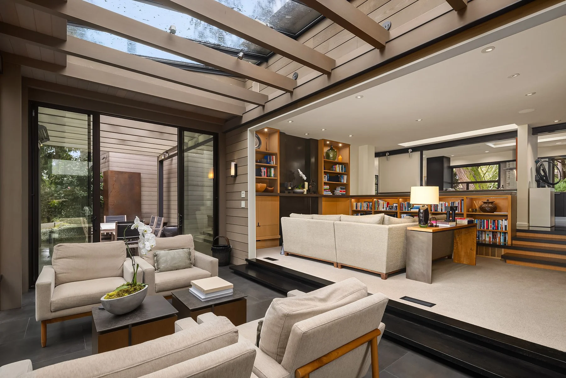 Discover premier living on Medina’s beautiful Overlake Golf and Country Club. This architecturally significant PNW home enjoys a unique setting, tucked away at the end of a cul-de-sac, and offers tranquility, privacy and luxury— only minutes from downtown Bellevue and Seattle. The home greets you upon entering with expansive fairway views, and unfolds almost entirely on a single level, with rooms branching off from a central hallway with a seamless flow. The living room is adorned with floor-to-ceiling windows that capture the stunning landscape, complemented by a cozy fireplace. The elegance extends to the formal dining room and a sleek kitchen equipped with top-of-the-line appliances. A sumptuous family room is adorned with a fireplace surrounded by concrete, blackened steel and rift sawn oak cabinetry. A sunroom of cedar and glass opens up to the private, park-like setting, perfect for seamless indoor-outdoor entertainment.