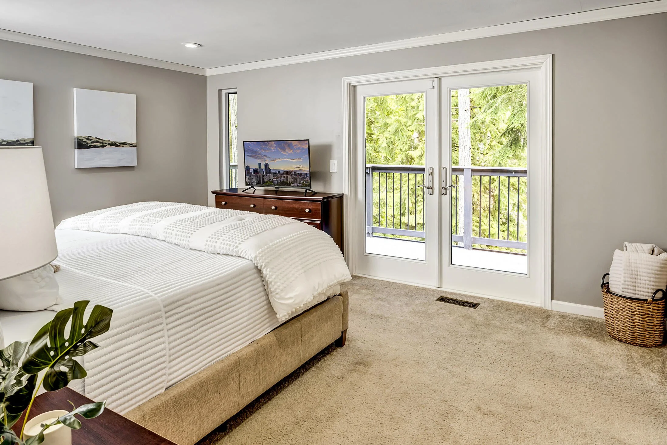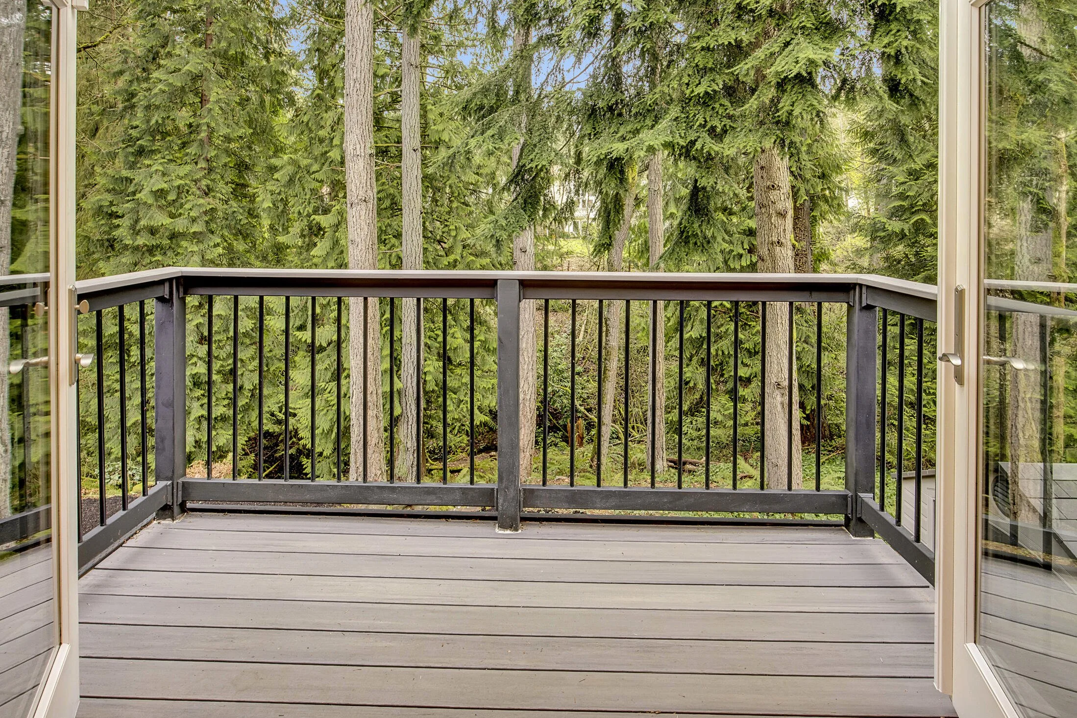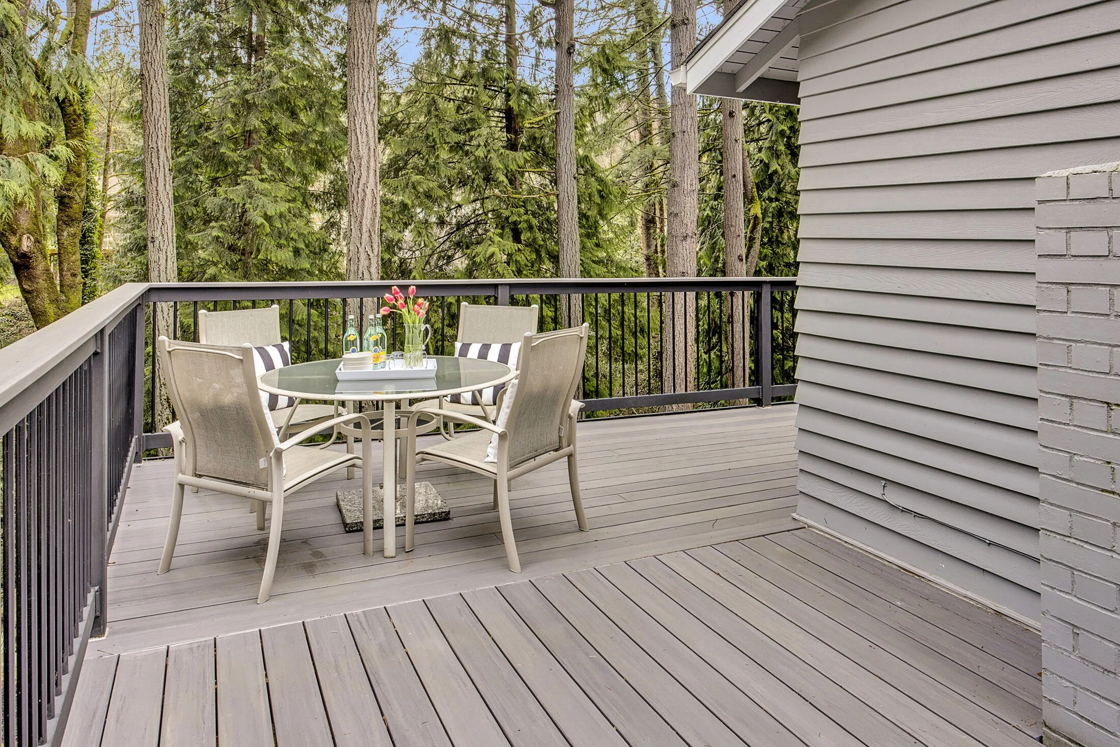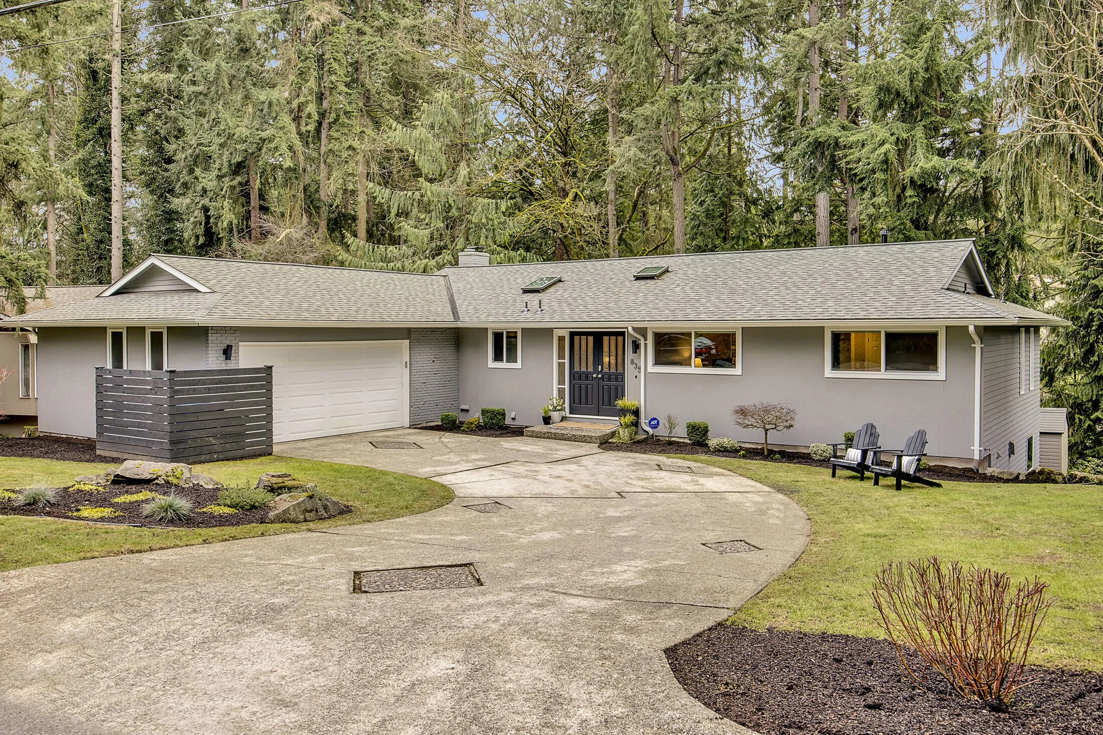 Welcome home to this gorgeous 5-bedroom daylight rambler in Bretton Wood. Escape your busy life and experience tranquil days surrounded by lush greenery. Where you'll find the perfect combination of convenience & charm. Open kitchen with light and bright living spaces, vaulted ceilings and a stacked stone fireplace. Granite slab counters, stainless steel appliances with induction stove and oven. Newly refinished bamboo floors add warmth to the room with a wall of french doors that open up to the spacious Trex deck. Main floor, primary bedroom offers en-suite bathroom with heated floors & private balcony. Lower level with a media room, rec room, two more bedrooms and laundry. You'll love the attached 2 car garage and exploring the trail down to the backyard creek. Live in the heart of Bellevue. Steps to Bennett Elementary, Microsoft, 520 and parks