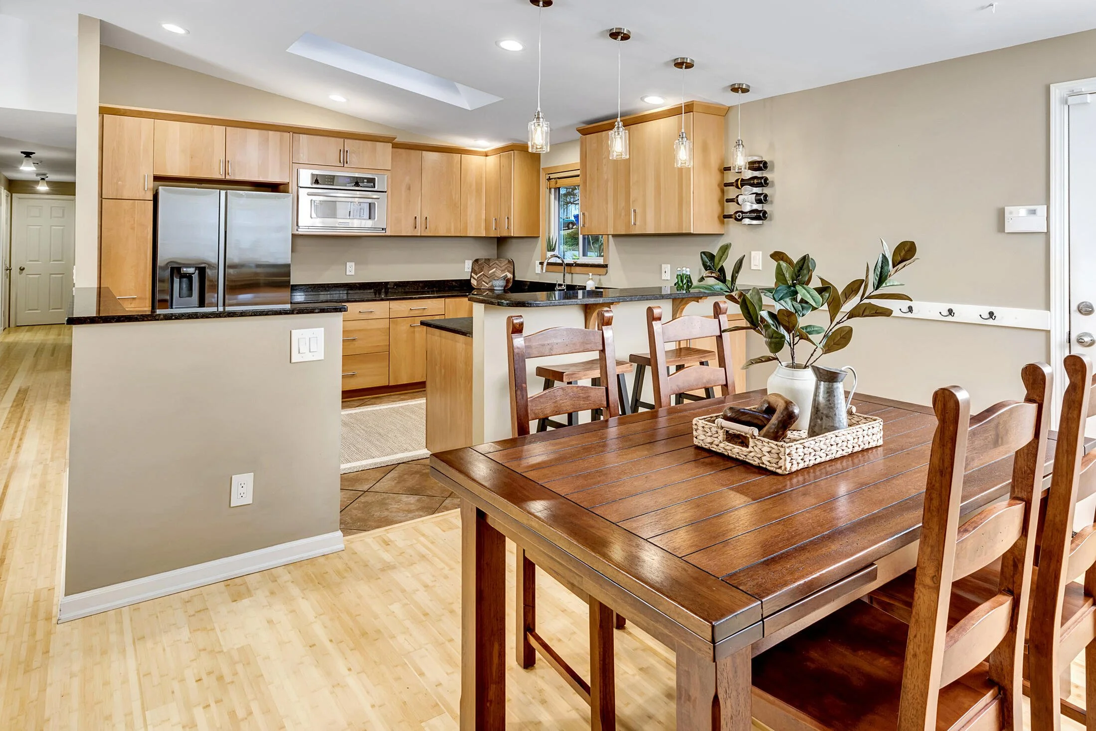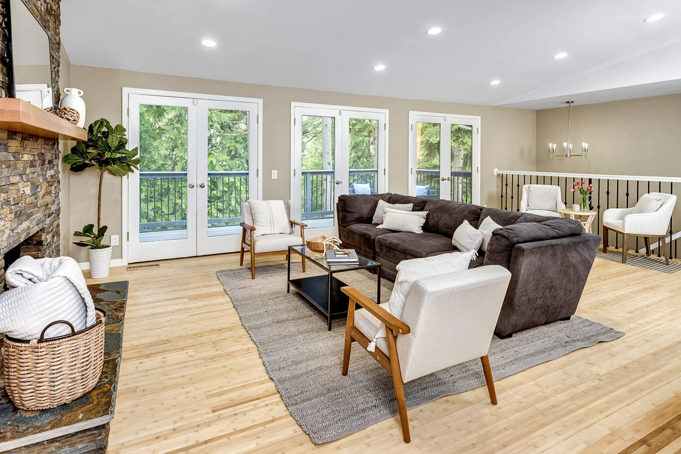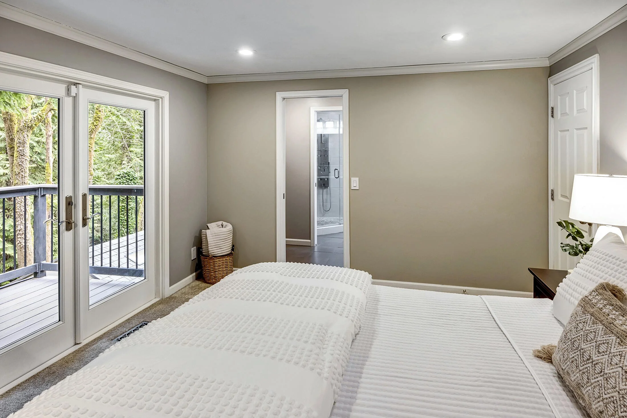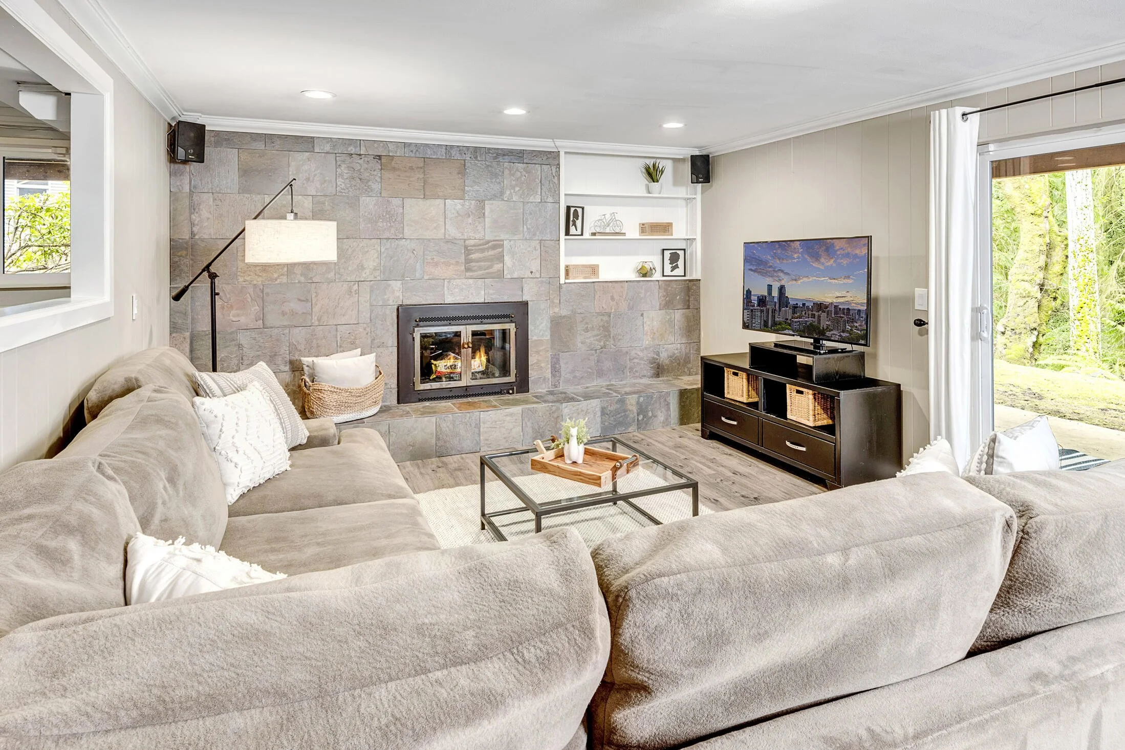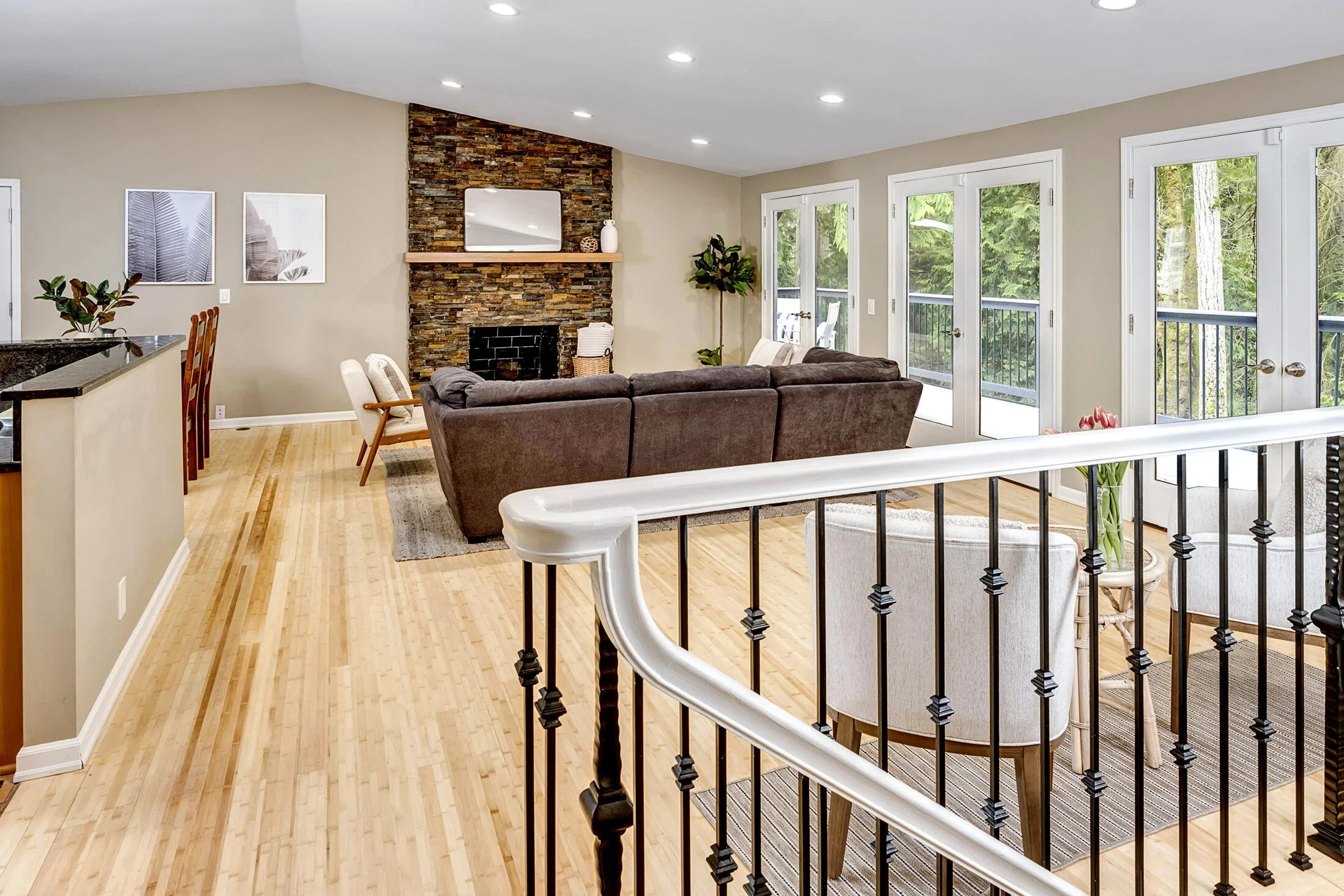 Welcome home to this gorgeous 5-bedroom daylight rambler in Bretton Wood. Escape your busy life and experience tranquil days surrounded by lush greenery. Where you'll find the perfect combination of convenience & charm. Open kitchen with light and bright living spaces, vaulted ceilings and a stacked stone fireplace. Granite slab counters, stainless steel appliances with induction stove and oven. Newly refinished bamboo floors add warmth to the room with a wall of french doors that open up to the spacious Trex deck. Main floor, primary bedroom offers en-suite bathroom with heated floors & private balcony. Lower level with a media room, rec room, two more bedrooms and laundry. You'll love the attached 2 car garage and exploring the trail down to the backyard creek. Live in the heart of Bellevue. Steps to Bennett Elementary, Microsoft, 520 and parks