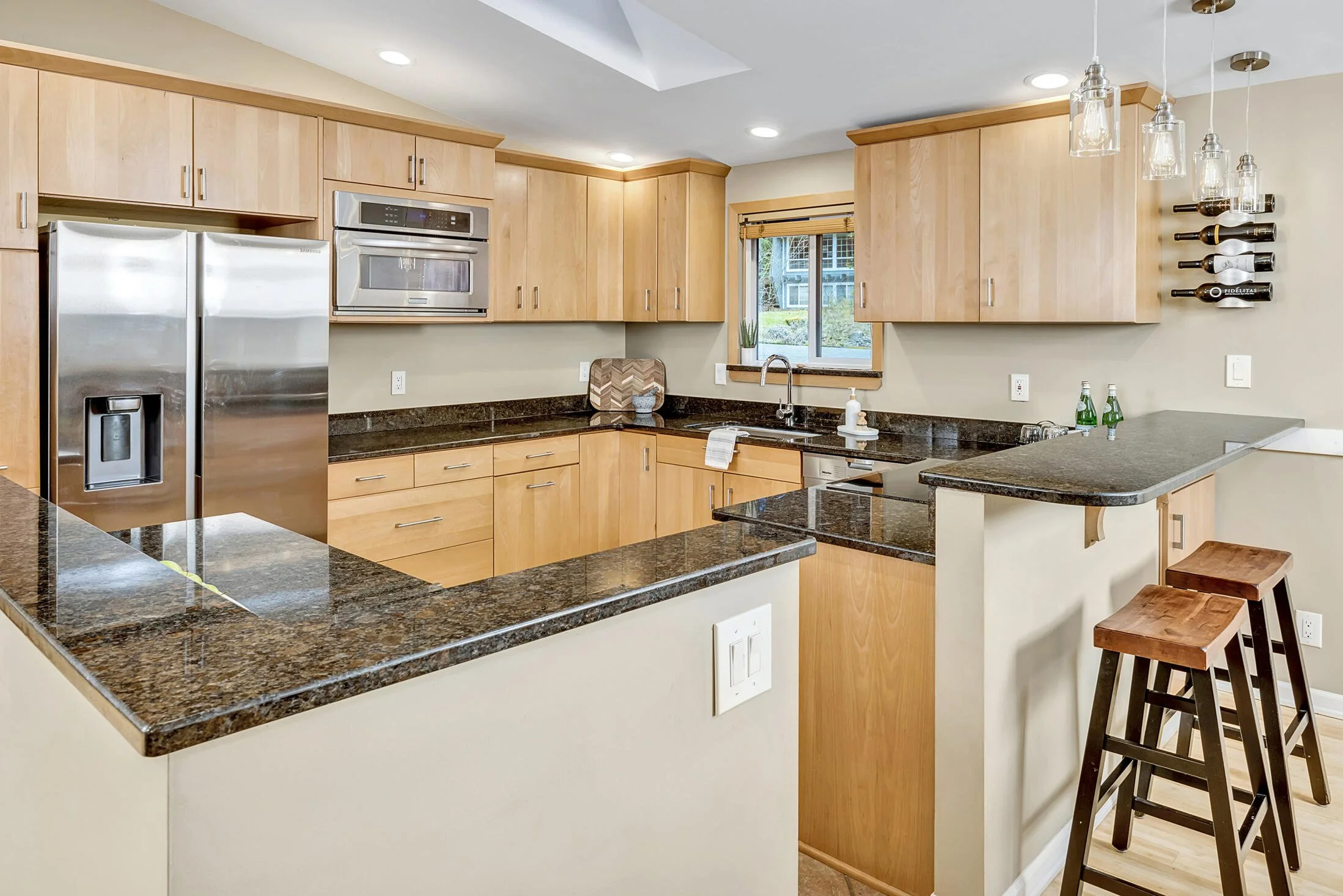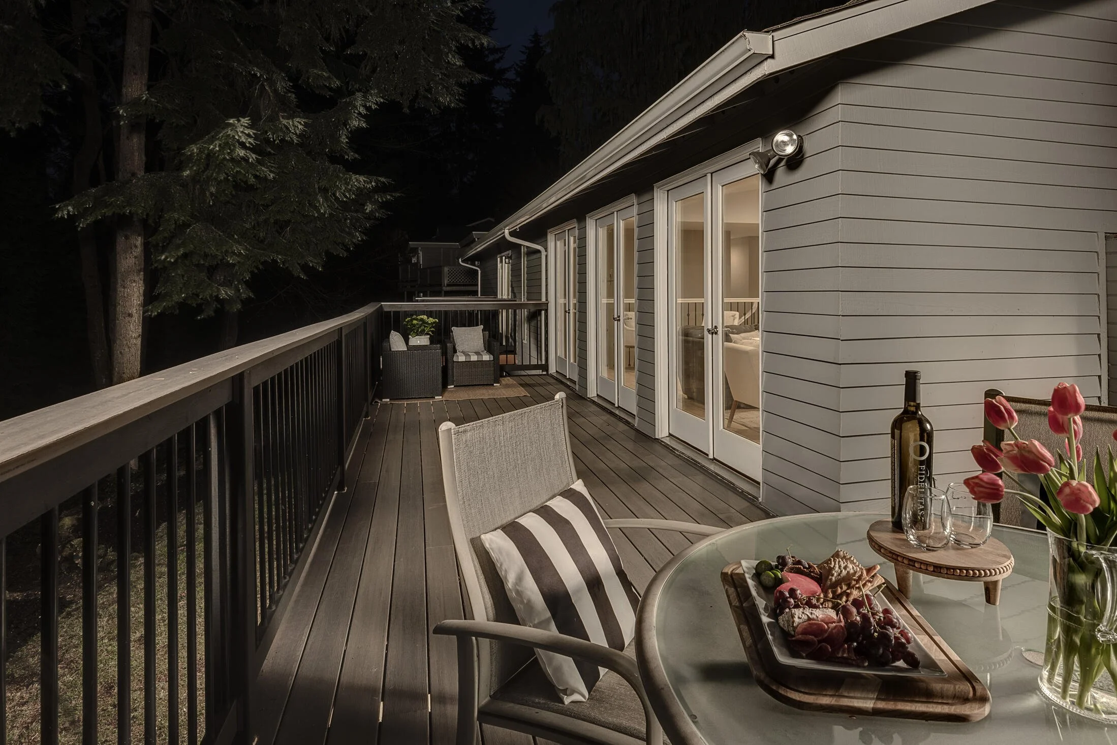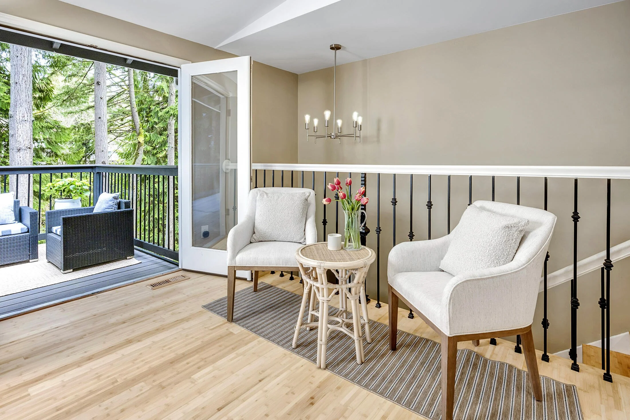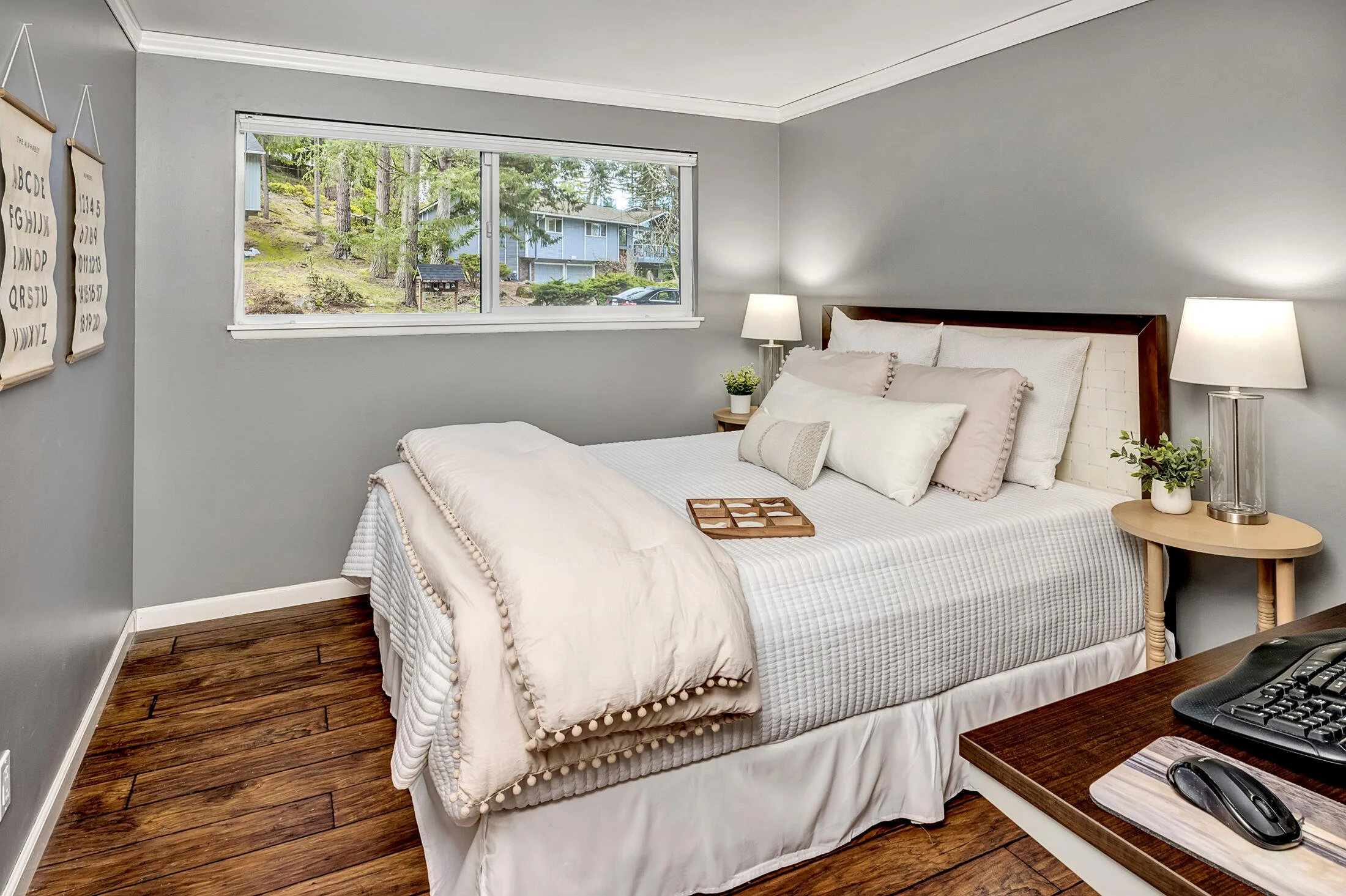 Welcome home to this gorgeous 5-bedroom daylight rambler in Bretton Wood. Escape your busy life and experience tranquil days surrounded by lush greenery. Where you'll find the perfect combination of convenience & charm. Open kitchen with light and bright living spaces, vaulted ceilings and a stacked stone fireplace. Granite slab counters, stainless steel appliances with induction stove and oven. Newly refinished bamboo floors add warmth to the room with a wall of french doors that open up to the spacious Trex deck. Main floor, primary bedroom offers en-suite bathroom with heated floors & private balcony. Lower level with a media room, rec room, two more bedrooms and laundry. You'll love the attached 2 car garage and exploring the trail down to the backyard creek. Live in the heart of Bellevue. Steps to Bennett Elementary, Microsoft, 520 and parks