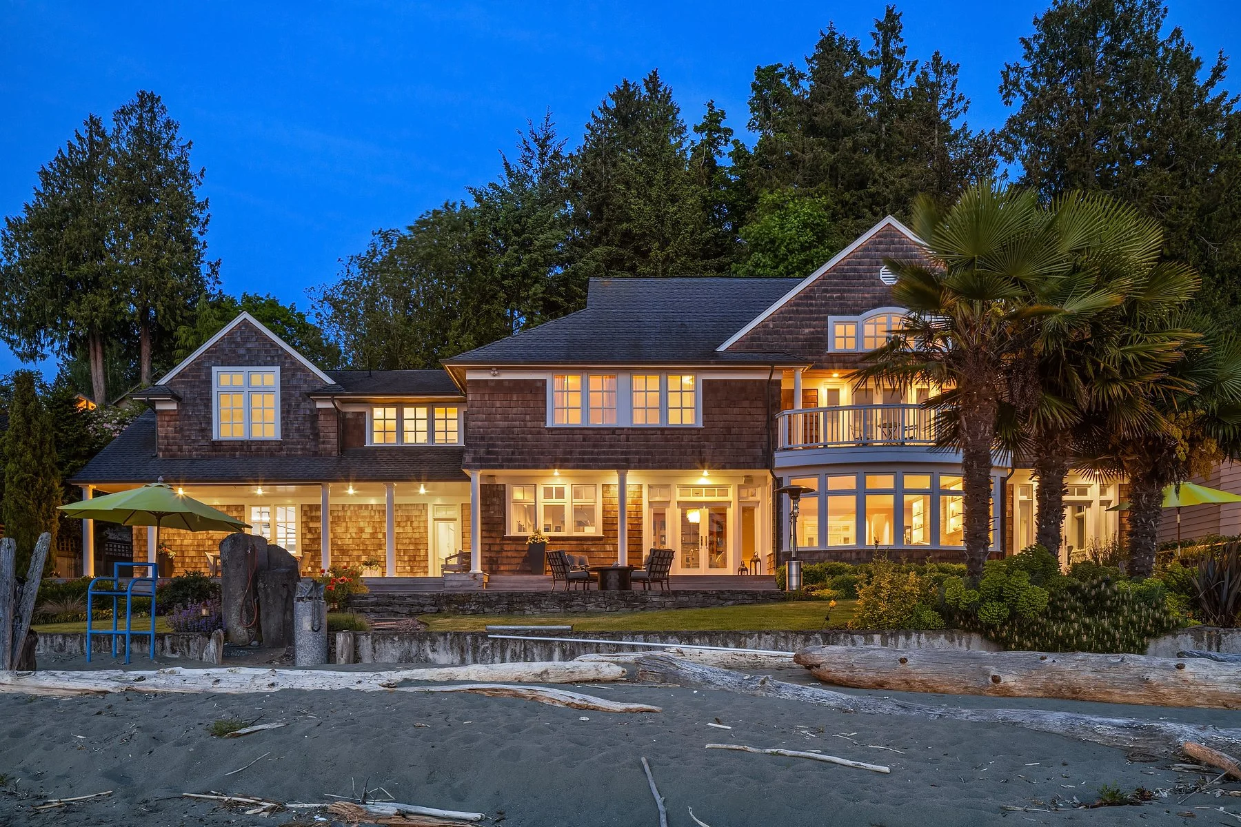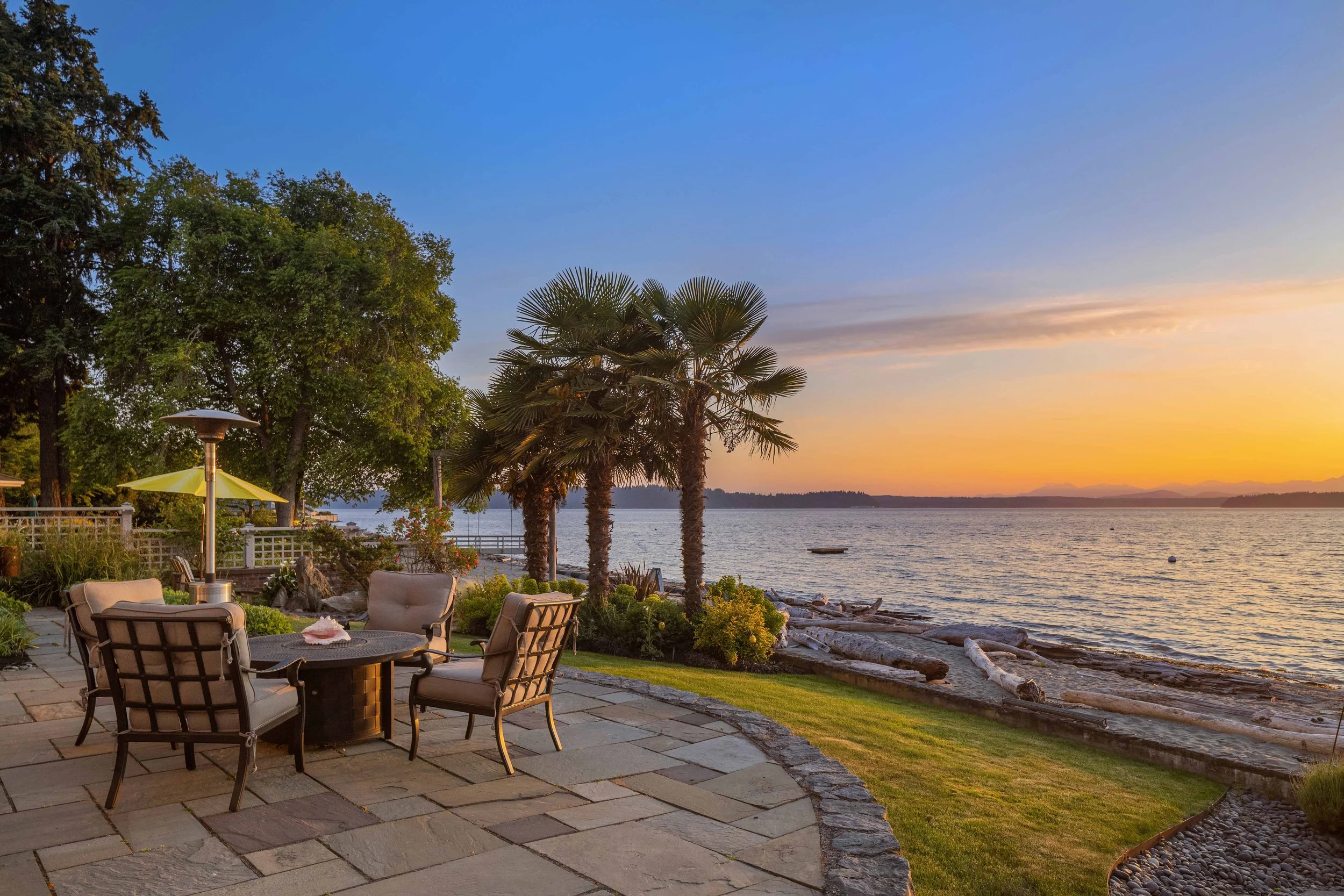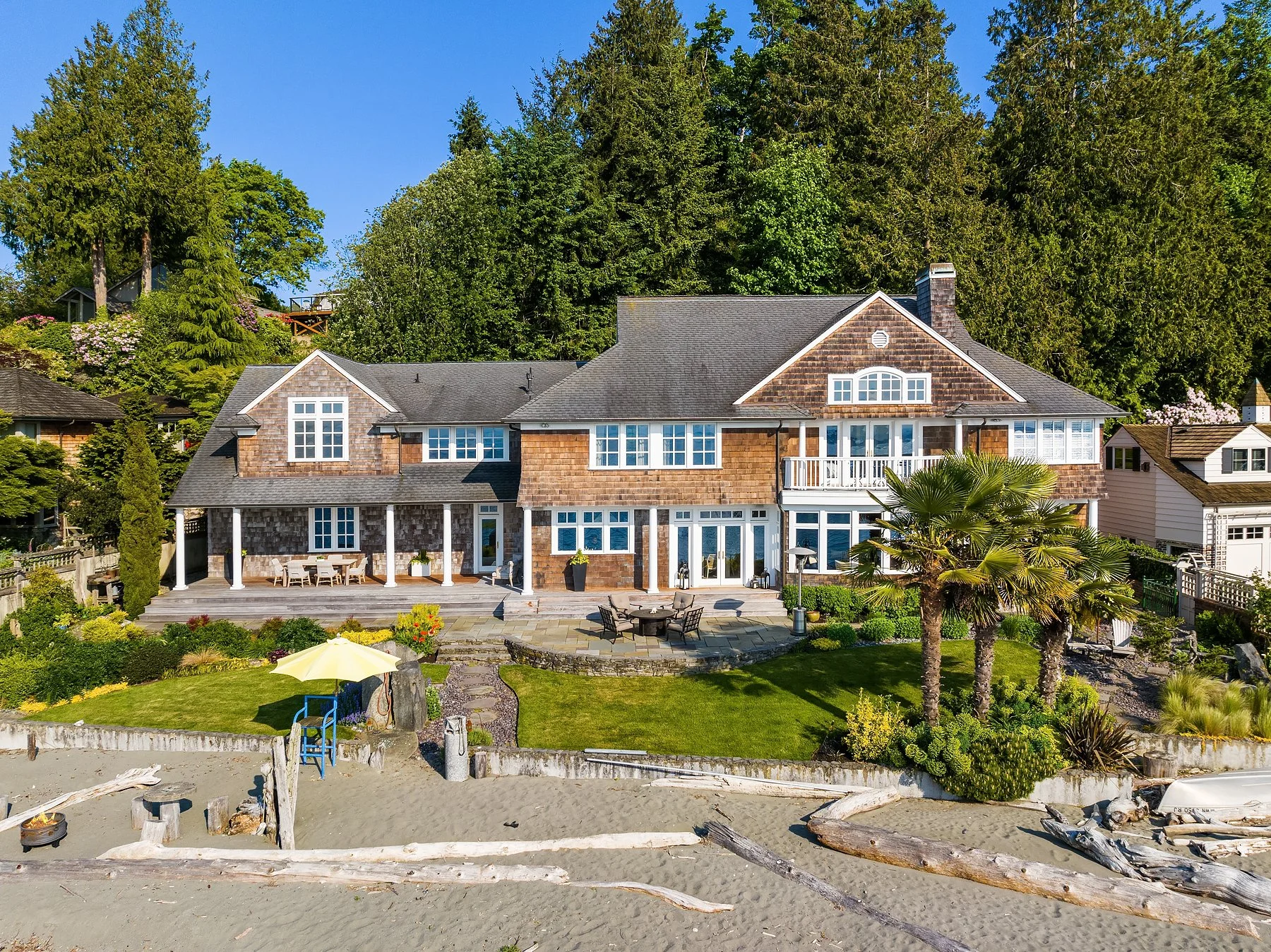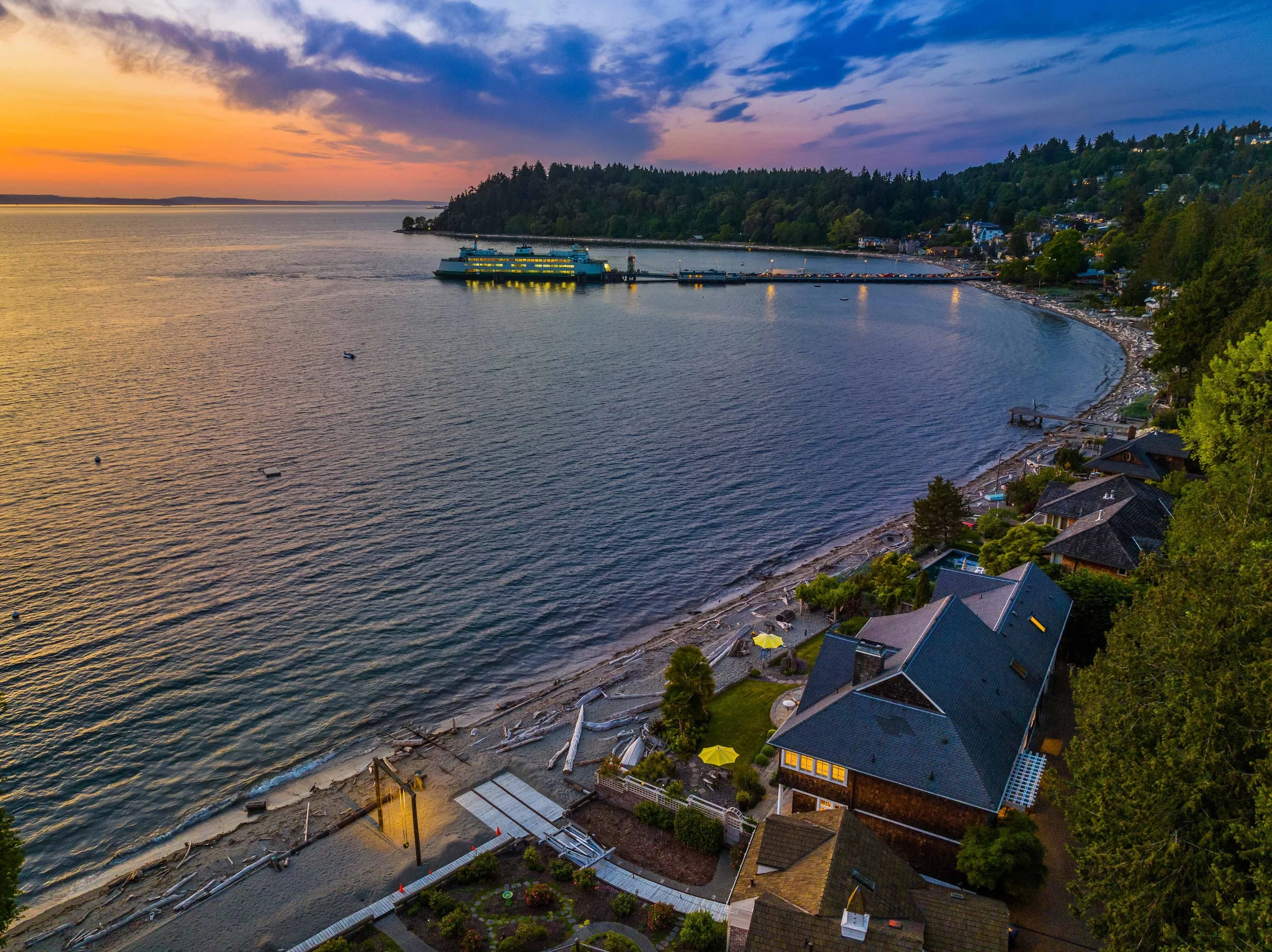 Outside, a covered veranda creates an ideal vantage point to take in marine wildlife, watch ferries go by, and colorful sunsets over the Olympics. As the last home on the lane, privacy is assured, and the property includes two buoys and a raft. The outdoor area offers a spacious deck, outdoor fireplace, well-manicured lawn, and multiple al fresco dining options. Enjoy the stunning views of Vashon Island, Blake Island, Bainbridge Island, and the Olympics from your home or while strolling on the beach. Attached 2-car garage; alarm system; home theater; sauna; office. The perfect home for those seeking a serene beach lifestyle without compromising on comfort and luxury.