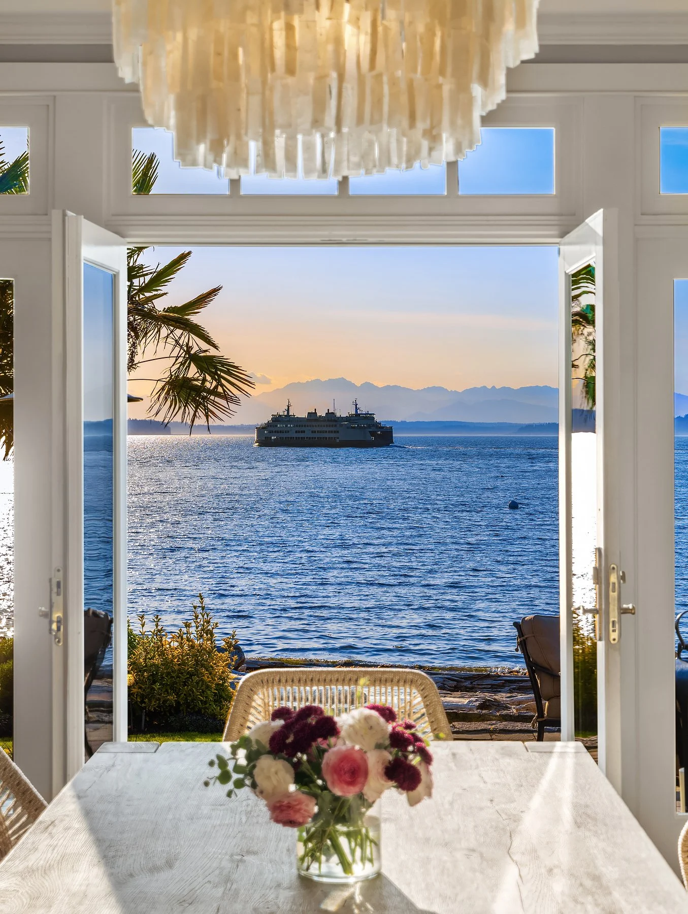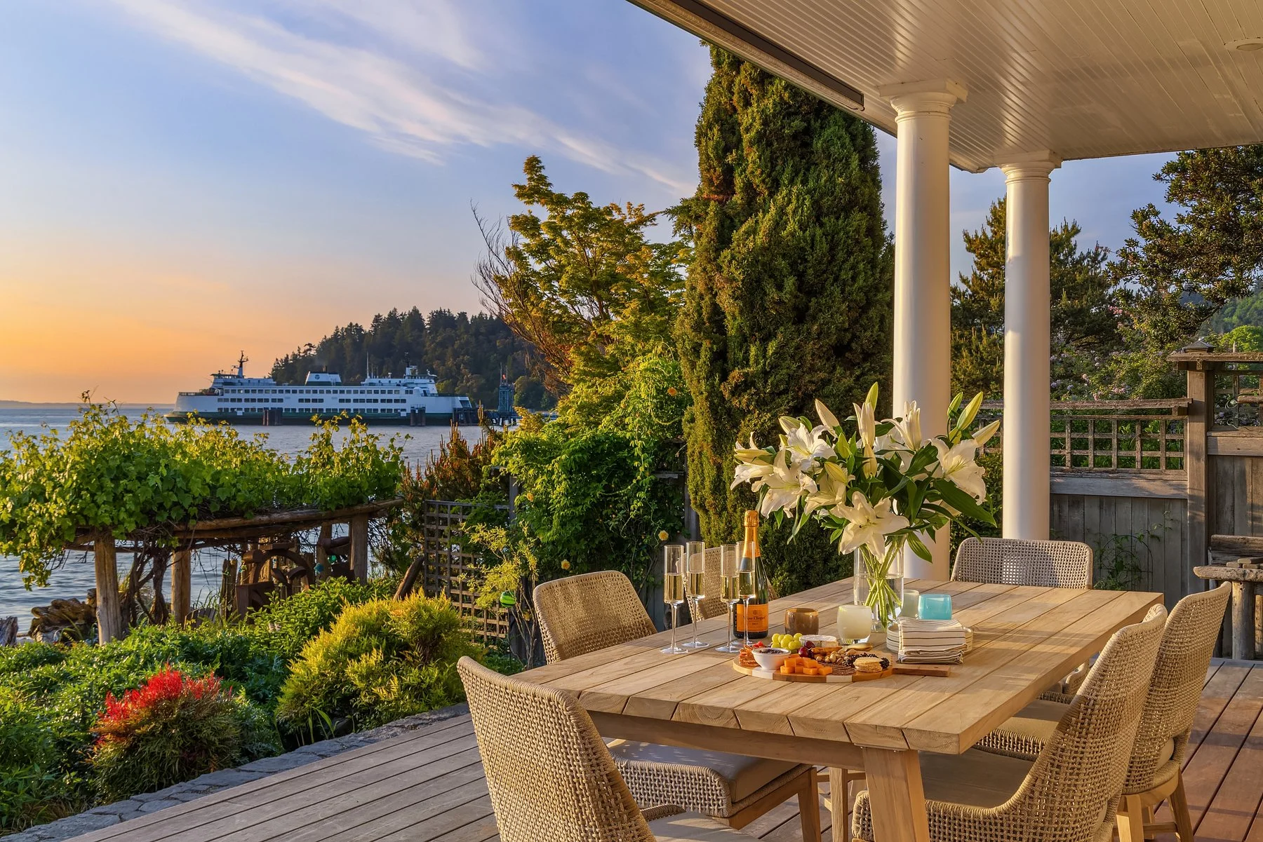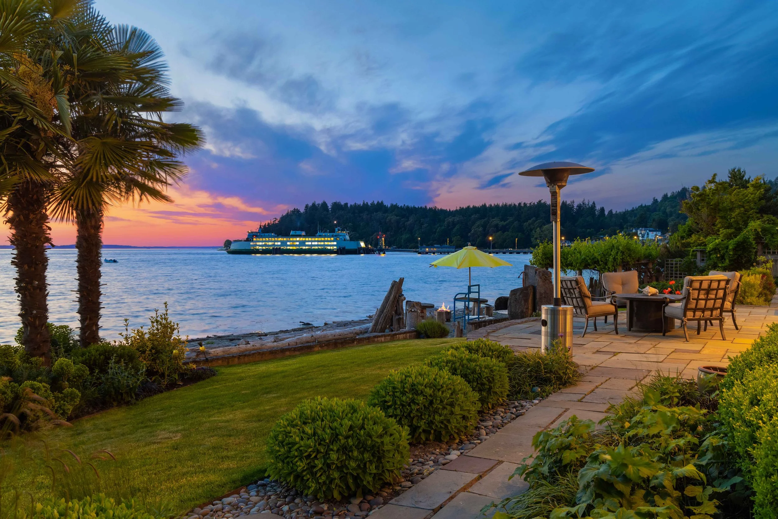 Outside, a covered veranda creates an ideal vantage point to take in marine wildlife, watch ferries go by, and colorful sunsets over the Olympics. As the last home on the lane, privacy is assured, and the property includes two buoys and a raft. The outdoor area offers a spacious deck, outdoor fireplace, well-manicured lawn, and multiple al fresco dining options. Enjoy the stunning views of Vashon Island, Blake Island, Bainbridge Island, and the Olympics from your home or while strolling on the beach. Attached 2-car garage; alarm system; home theater; sauna; office. The perfect home for those seeking a serene beach lifestyle without compromising on comfort and luxury.