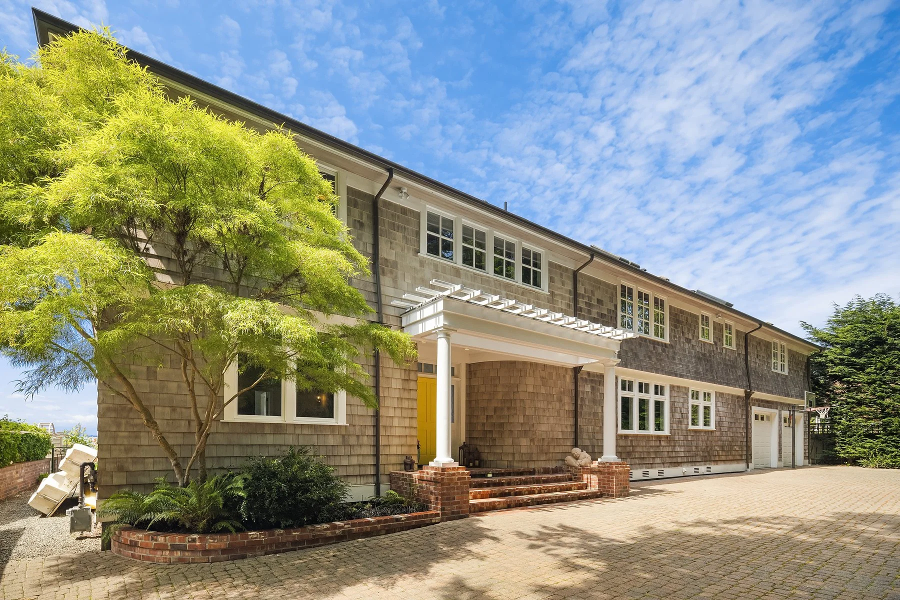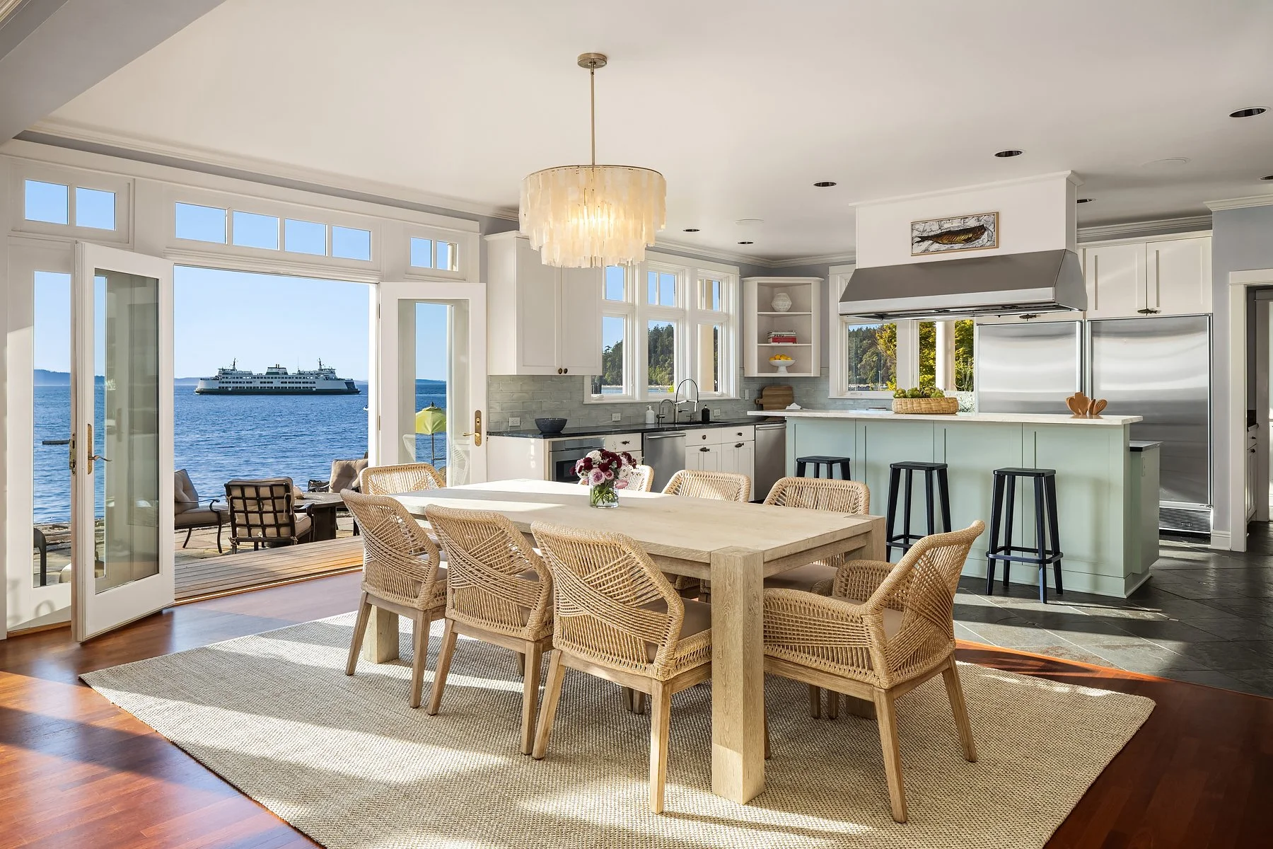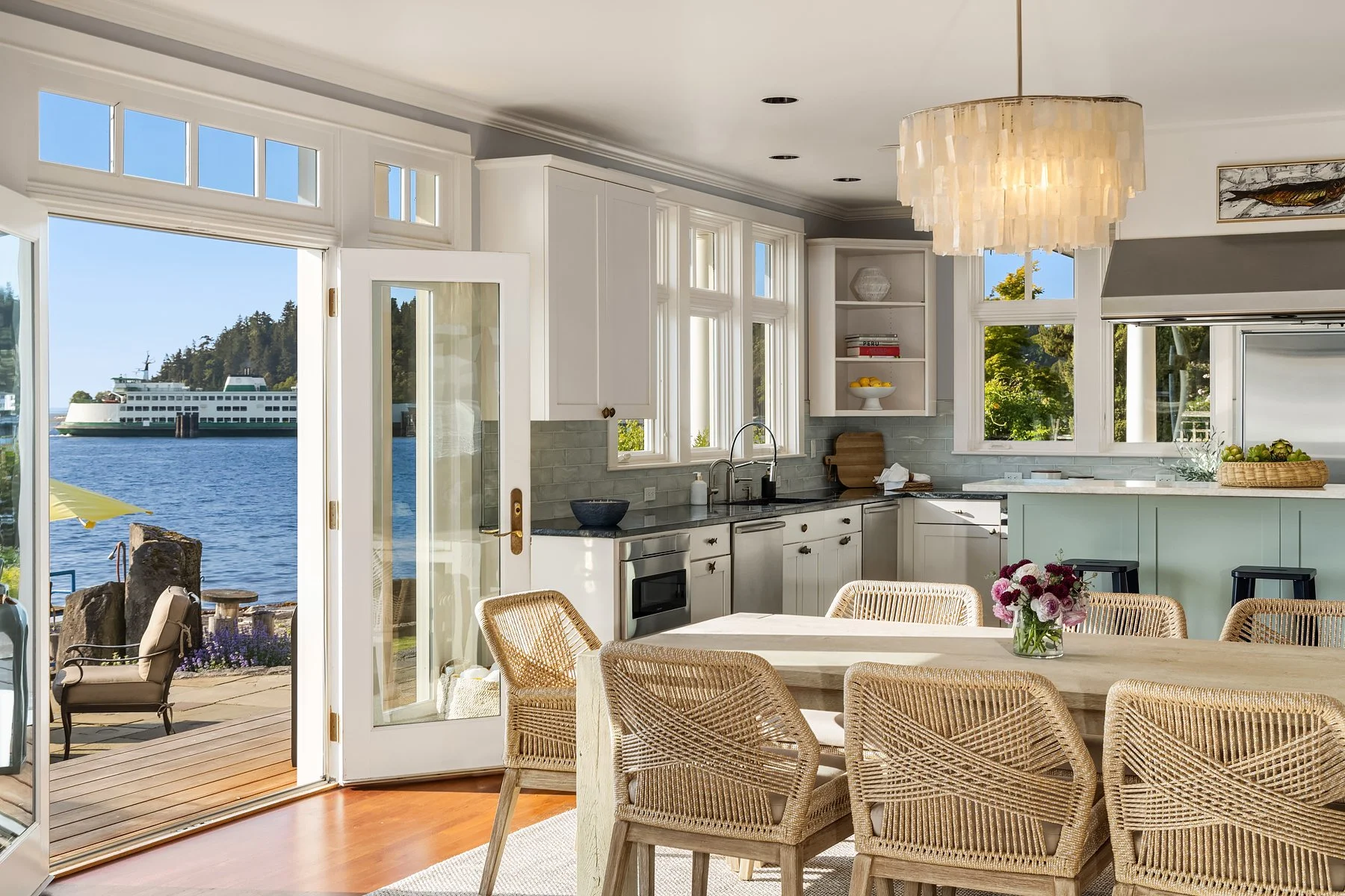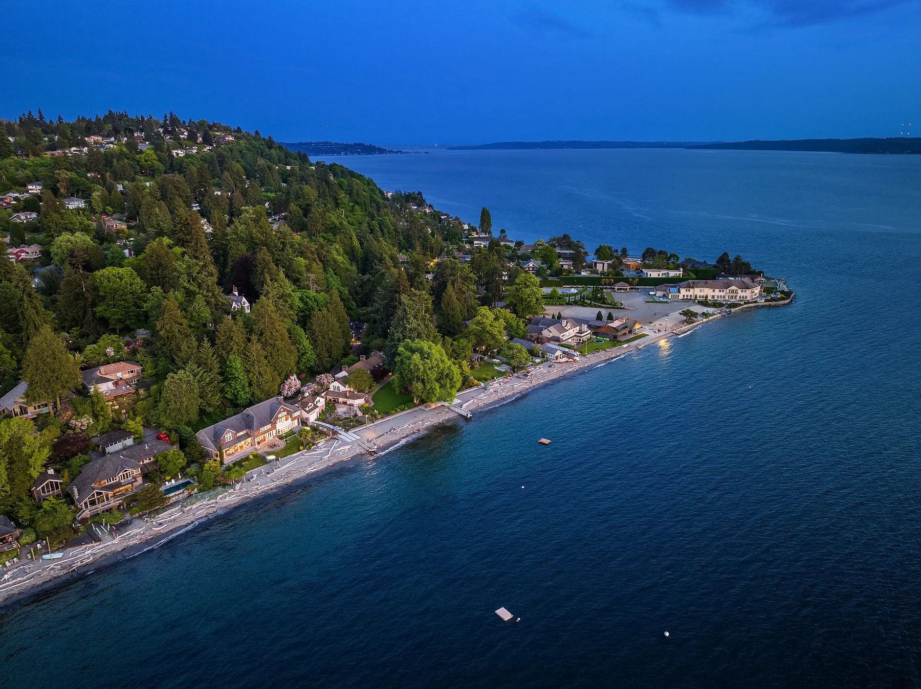Outside, a covered veranda creates an ideal vantage point to take in marine wildlife, watch ferries go by, and colorful sunsets over the Olympics. As the last home on the lane, privacy is assured, and the property includes two buoys and a raft. The outdoor area offers a spacious deck, outdoor fireplace, well-manicured lawn, and multiple al fresco dining options. Enjoy the stunning views of Vashon Island, Blake Island, Bainbridge Island, and the Olympics from your home or while strolling on the beach. Attached 2-car garage; alarm system; home theater; sauna; office. The perfect home for those seeking a serene beach lifestyle without compromising on comfort and luxury.