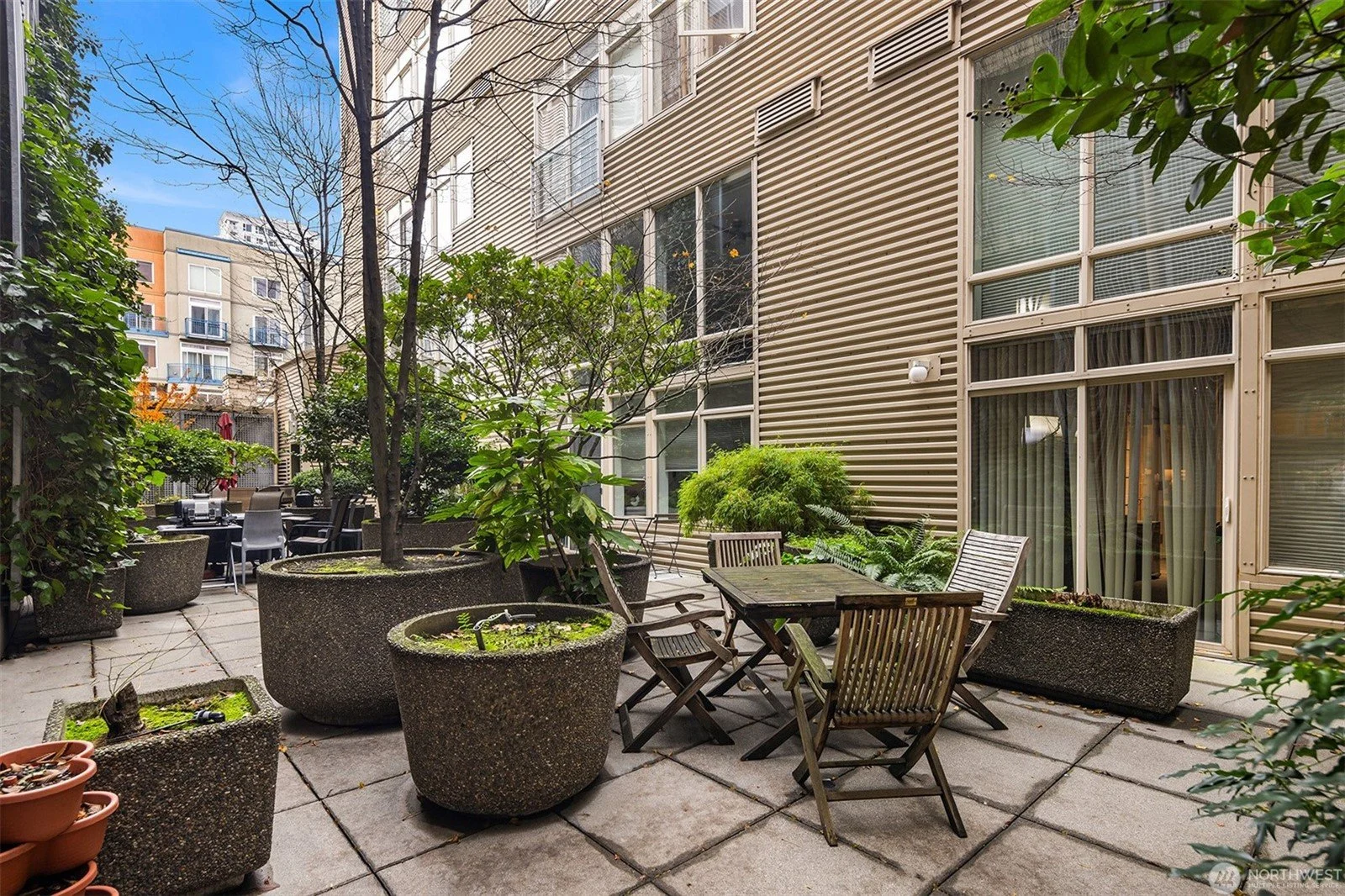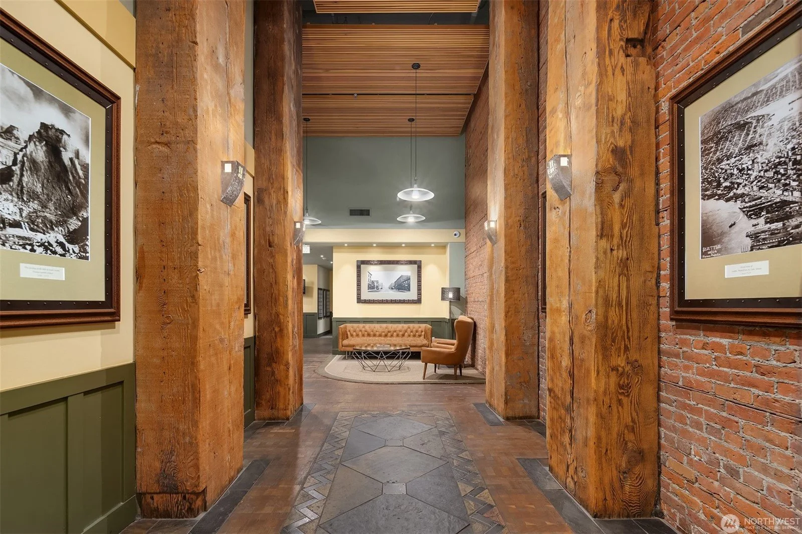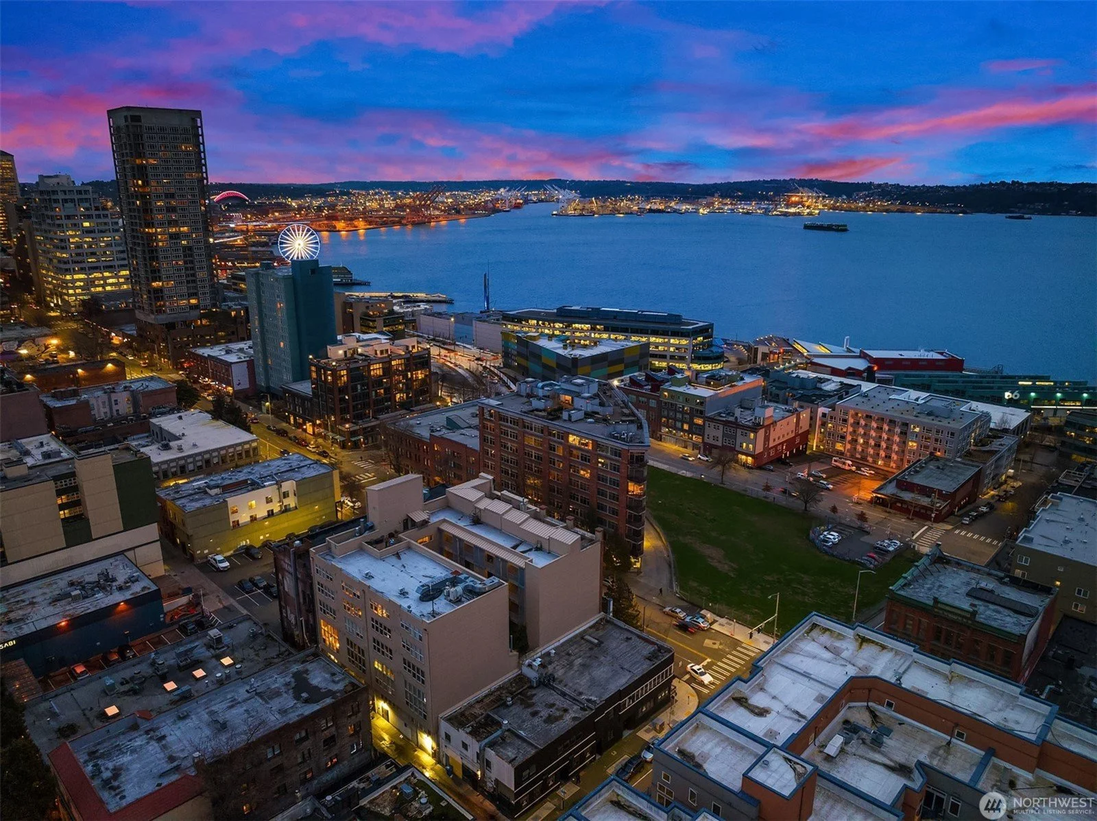 This thoughtfully designed Belltown condo combines modern convenience w/ urban charm.Steps from Pike Place Market, the Waterfront & other amenities.Featuring 2 bedrooms, each w/ walk-in closets & full bath, this refined rustic home boasts exposed brick & striking floor-to-ceiling windows spanning 2 levels.Dramatic windows flood the space w/ natural light, enhancing it's open feel while framing stunning views of Puget Sound.Highlights include a hideaway office, laundry room, courtyard, rooftop deck & sleek kitchen w/ pantry. The original 1908 exterior seamlessly integrates into the rebuilt interior, adding a chic historical touch. Short term rentals and pets allowed. No rental cap. Indoor parking space and storage.
