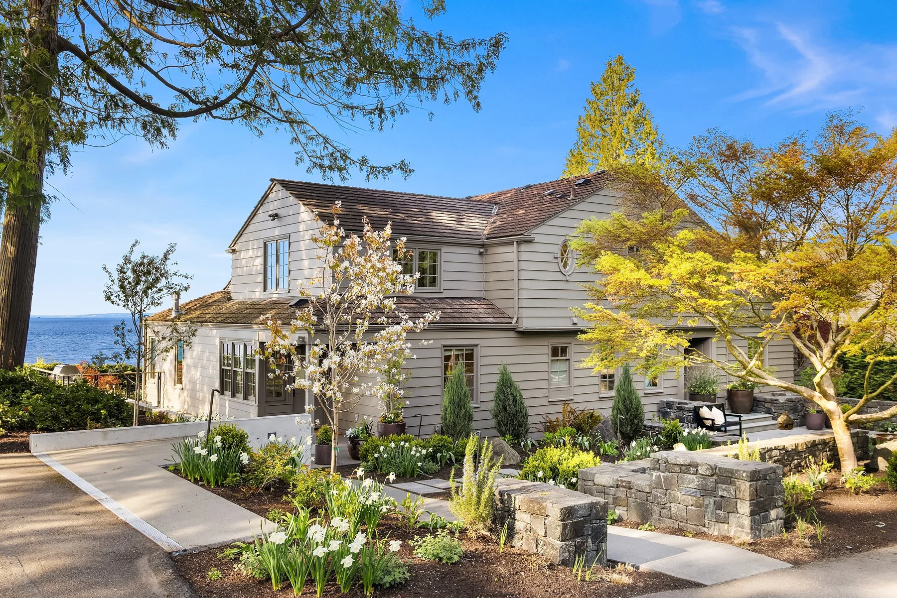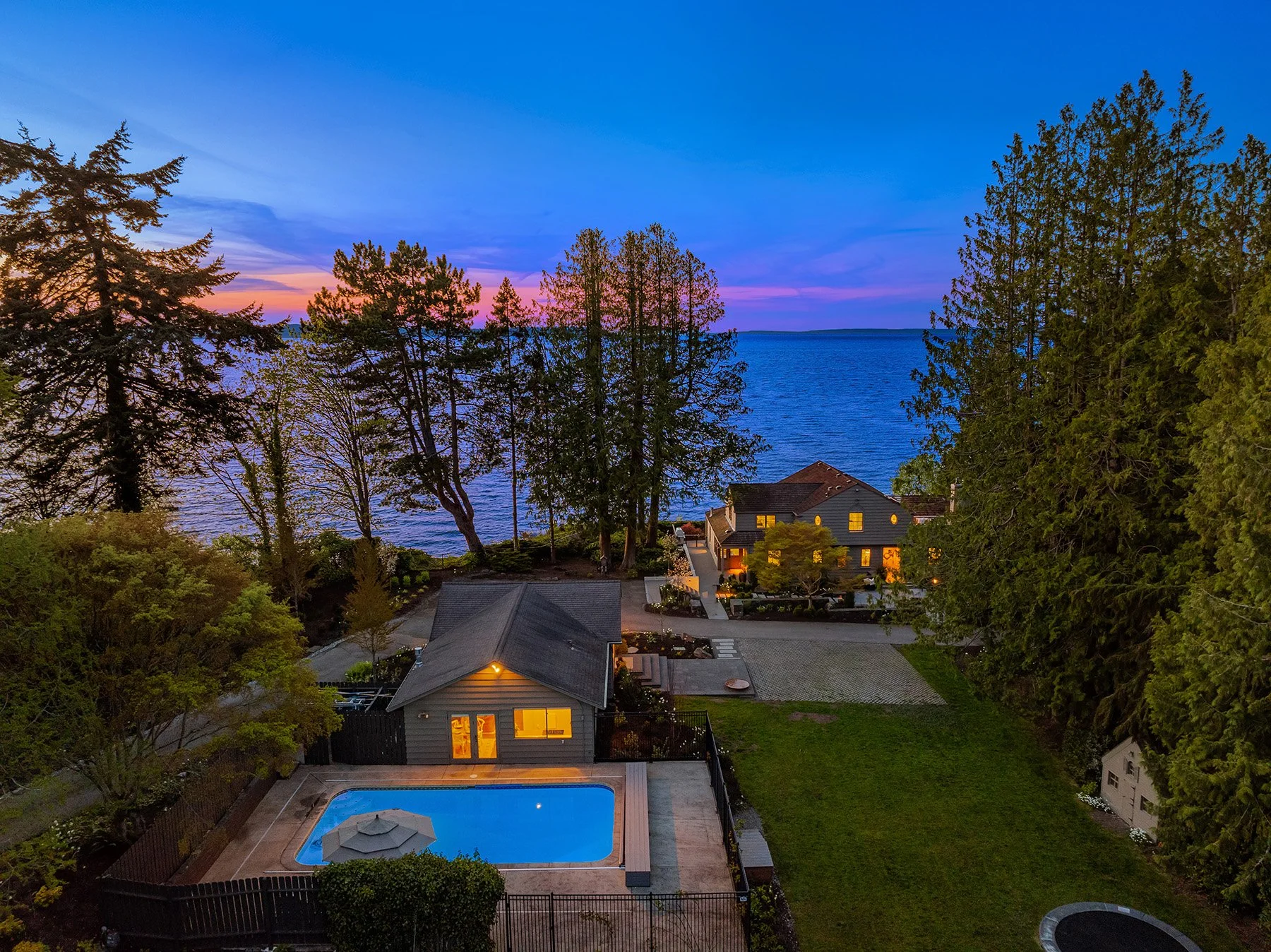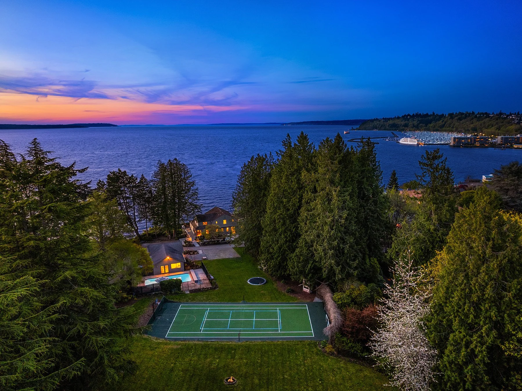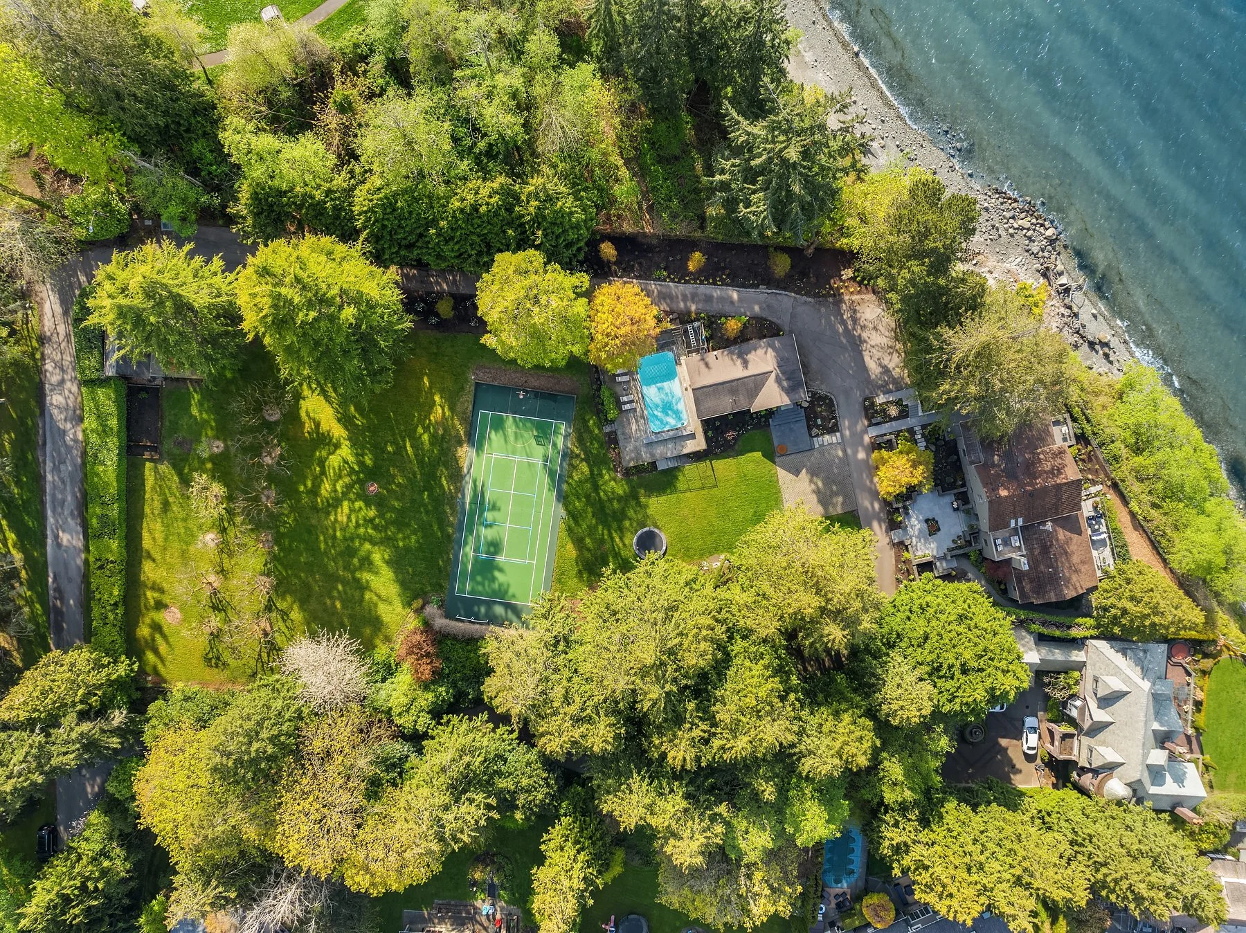 There are homes you live in, and homes that change how you live. This rare 1.96-acre estate in Magnolia is the latter. Gated and perched above Puget Sound, it offers panoramic views, soul-deep privacy, and daily moments of wonder: the constant unfolding of the weather and the sea, eagles circling at eye level, kids racing from the zipline to the trampoline, and sunsets that stop conversation. As you wind down the elegant driveway past the apple orchard, you're greeted by the main house, a guest cabana, and an array of resort-caliber amenities including a pool, sport court, and beautifully landscaped grounds. Inside, soaring ceilings and expansive windows flood the home with natural light, creating an open atmosphere. The bright kitchen features a Sub-Zero refrigerator, deep farmhouse sink, and charming tilework above the stove. The spacious gathering room—anchored by a tall fireplace and exposed beams—flows seamlessly onto a covered back patio, perfect for dining al fresco while taking in sweeping ocean and mountain views, and breathtaking sunsets. The primary suite offers a true retreat, with large windows framing serene vistas, a generous walk-in closet, and a spa-like bathroom with a soaking tub and dual-head shower. Upstairs, a quiet office overlooking Puget Sound and a cozy reading nook provide ideal spaces to work or unwind. Designed for both relaxation and play, this estate is rare gem that delivers the perfect balance of peaceful seclusion and easy access to everything Seattle has to offer.