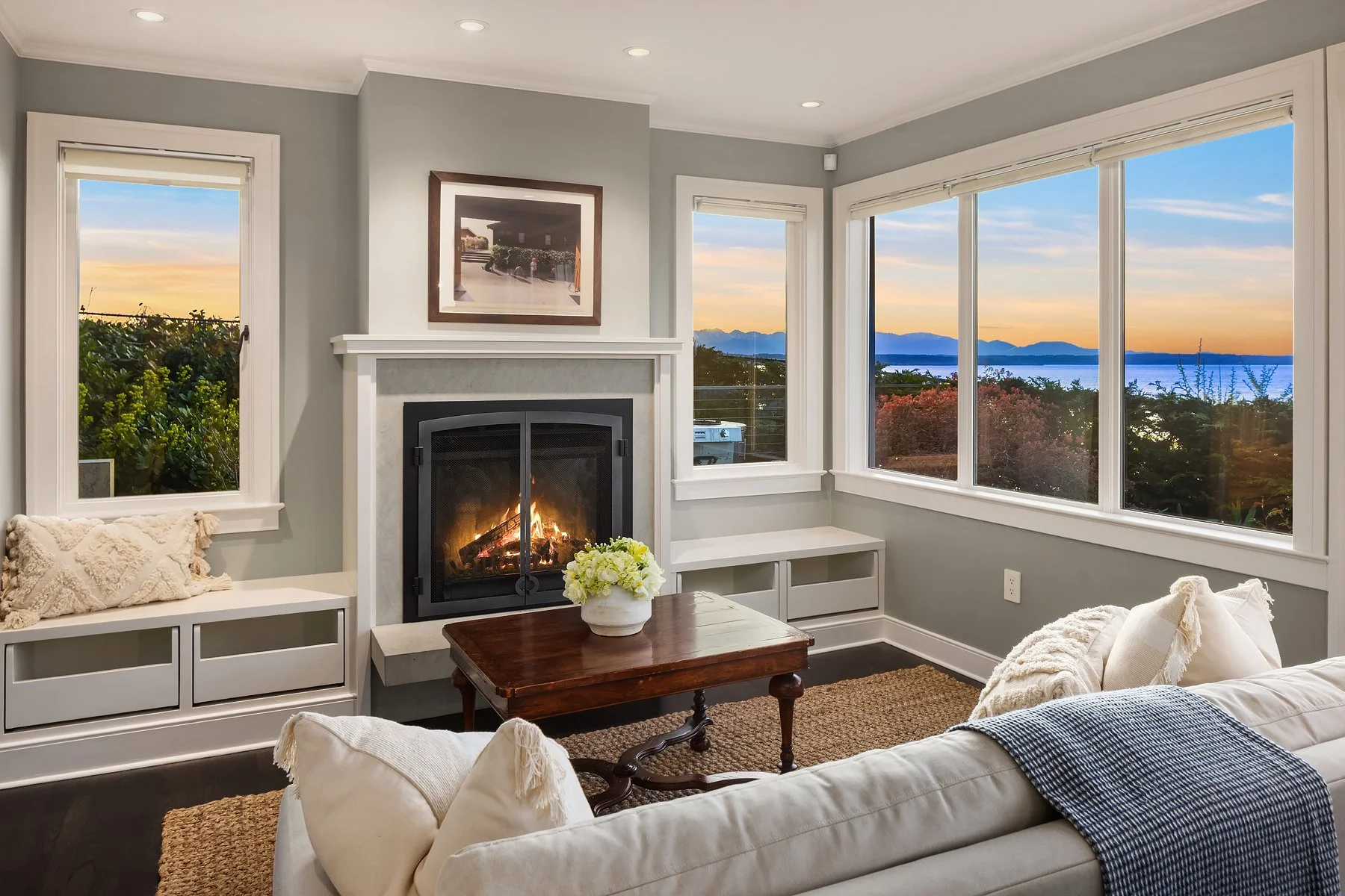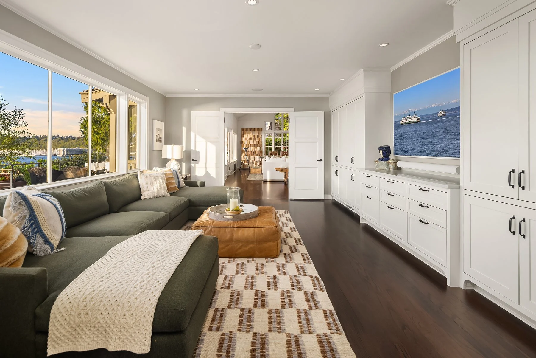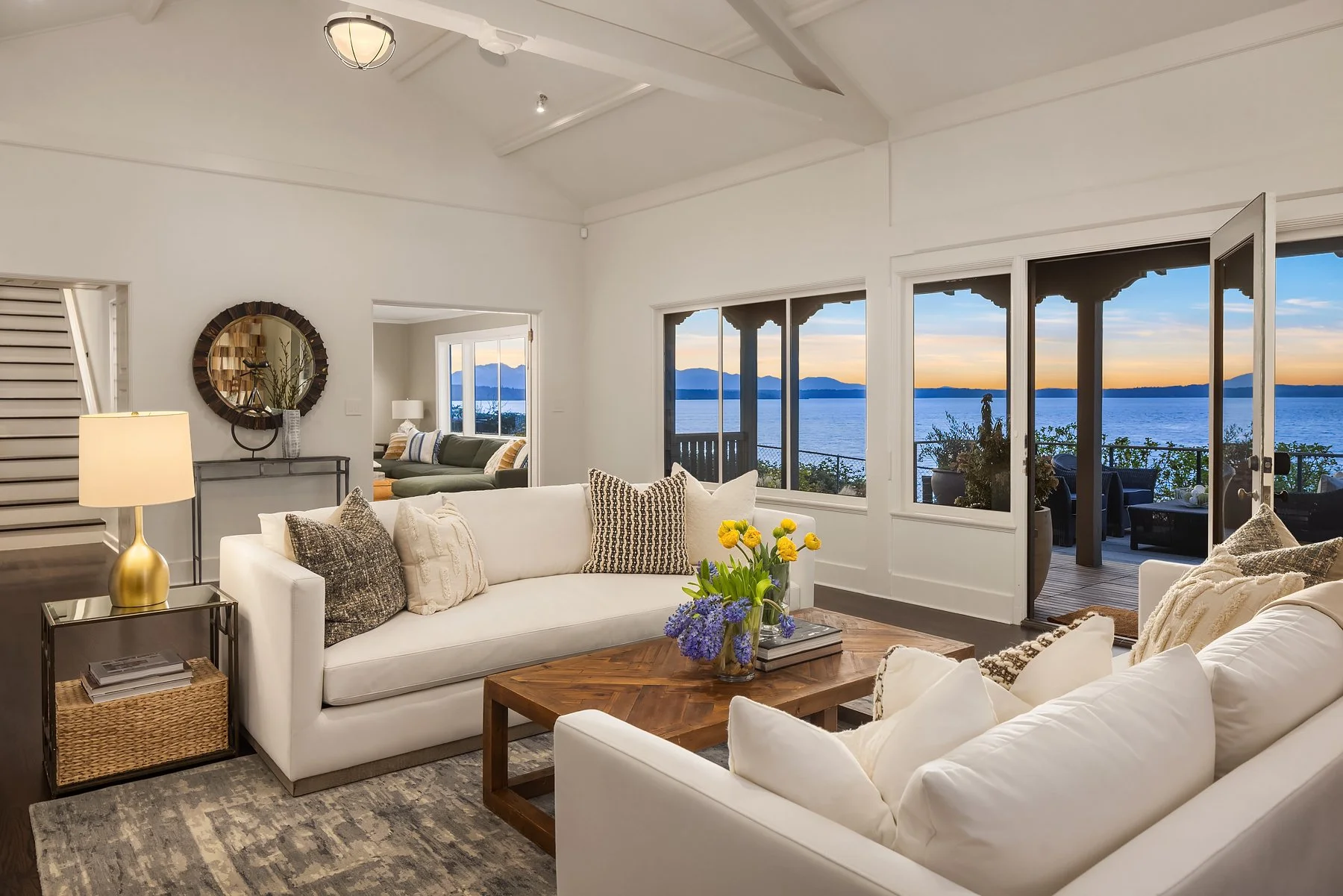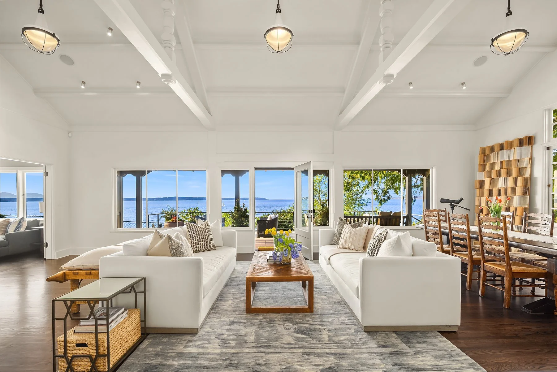 There are homes you live in, and homes that change how you live. This rare 1.96-acre estate in Magnolia is the latter. Gated and perched above Puget Sound, it offers panoramic views, soul-deep privacy, and daily moments of wonder: the constant unfolding of the weather and the sea, eagles circling at eye level, kids racing from the zipline to the trampoline, and sunsets that stop conversation. As you wind down the elegant driveway past the apple orchard, you're greeted by the main house, a guest cabana, and an array of resort-caliber amenities including a pool, sport court, and beautifully landscaped grounds. Inside, soaring ceilings and expansive windows flood the home with natural light, creating an open atmosphere. The bright kitchen features a Sub-Zero refrigerator, deep farmhouse sink, and charming tilework above the stove. The spacious gathering room—anchored by a tall fireplace and exposed beams—flows seamlessly onto a covered back patio, perfect for dining al fresco while taking in sweeping ocean and mountain views, and breathtaking sunsets. The primary suite offers a true retreat, with large windows framing serene vistas, a generous walk-in closet, and a spa-like bathroom with a soaking tub and dual-head shower. Upstairs, a quiet office overlooking Puget Sound and a cozy reading nook provide ideal spaces to work or unwind. Designed for both relaxation and play, this estate is rare gem that delivers the perfect balance of peaceful seclusion and easy access to everything Seattle has to offer.