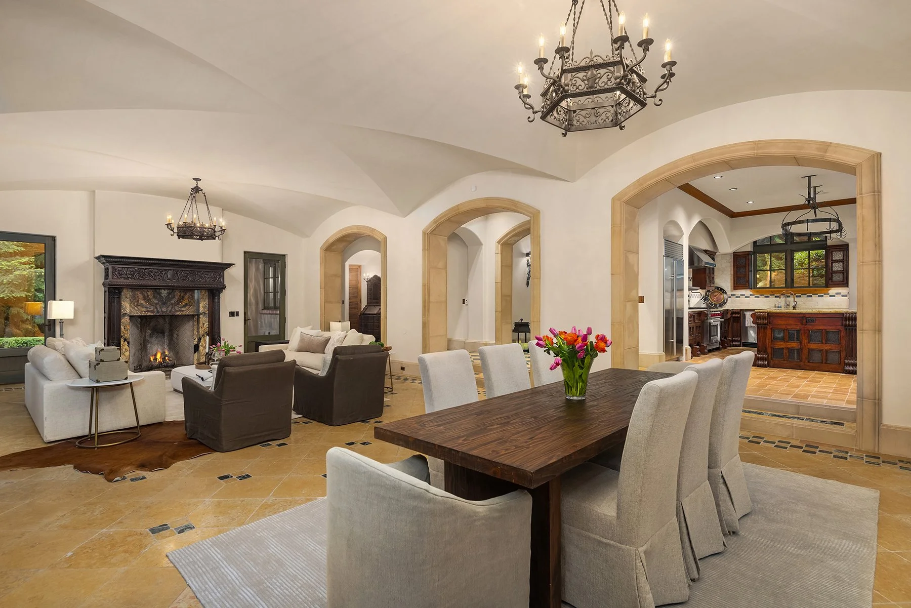 The primary suite spans its own wing with two sitting rooms, two spa-like bathrooms, a large dressing room and a private terrace. The chef’s kitchen pairs artisanal cabinetry with professional-grade appliances, balancing rustic materials with refined detailing.