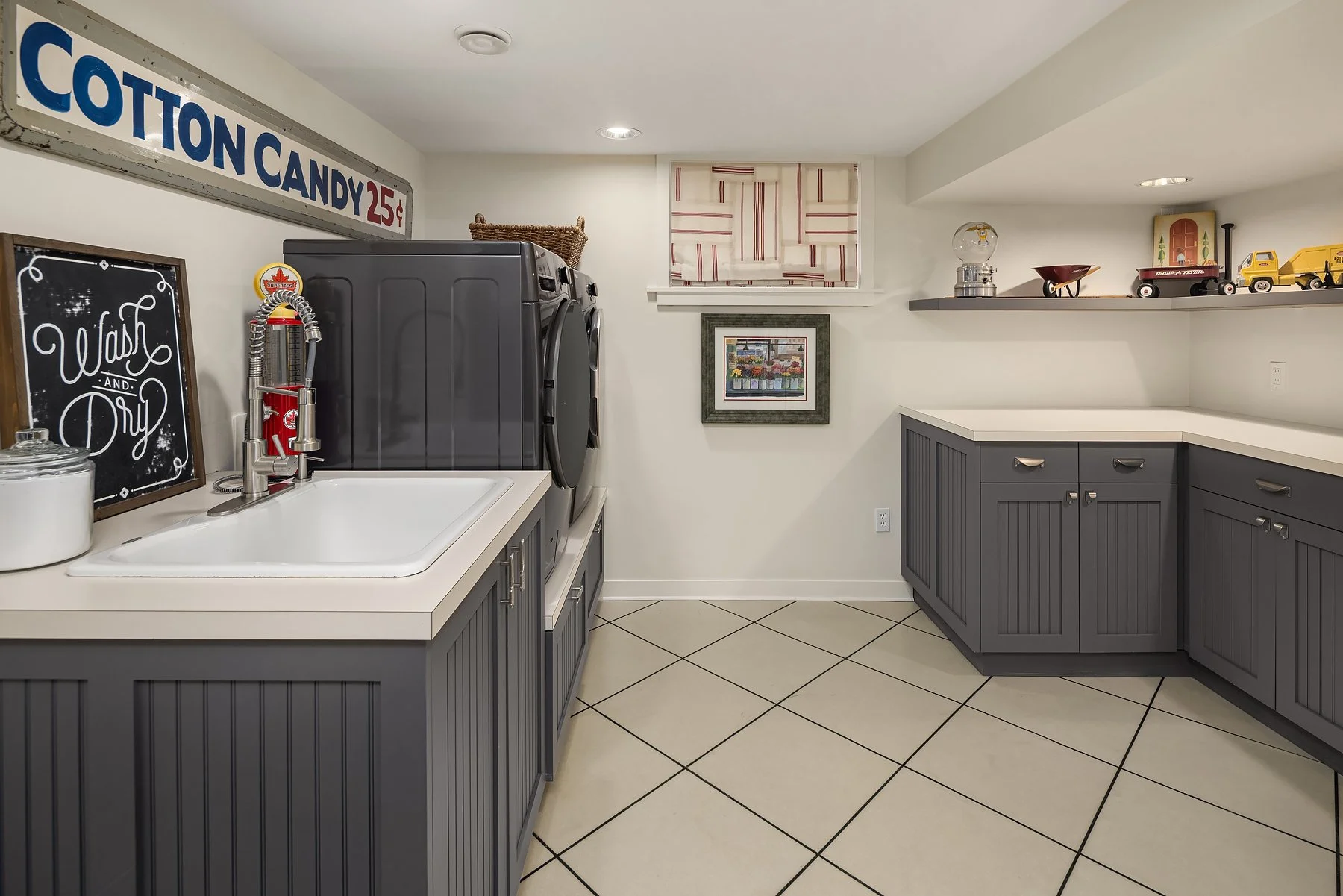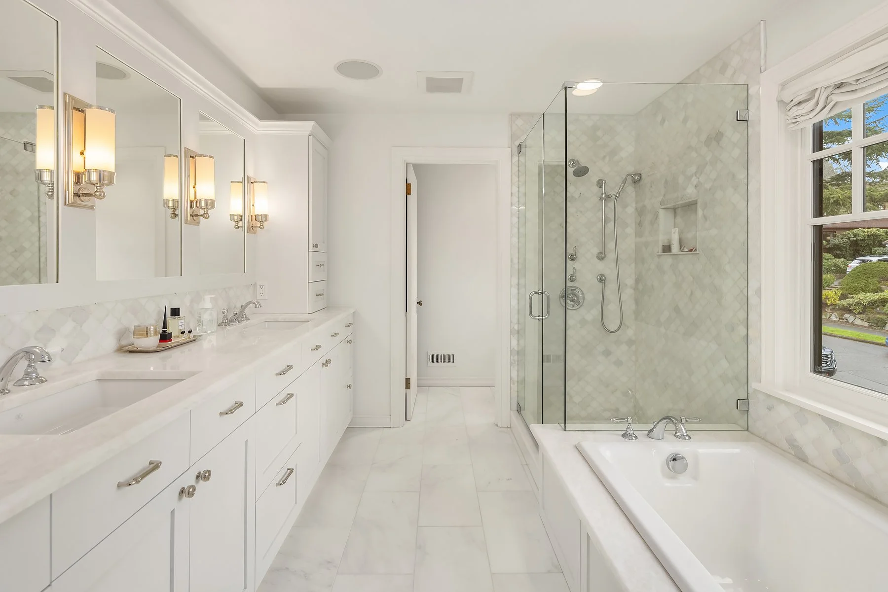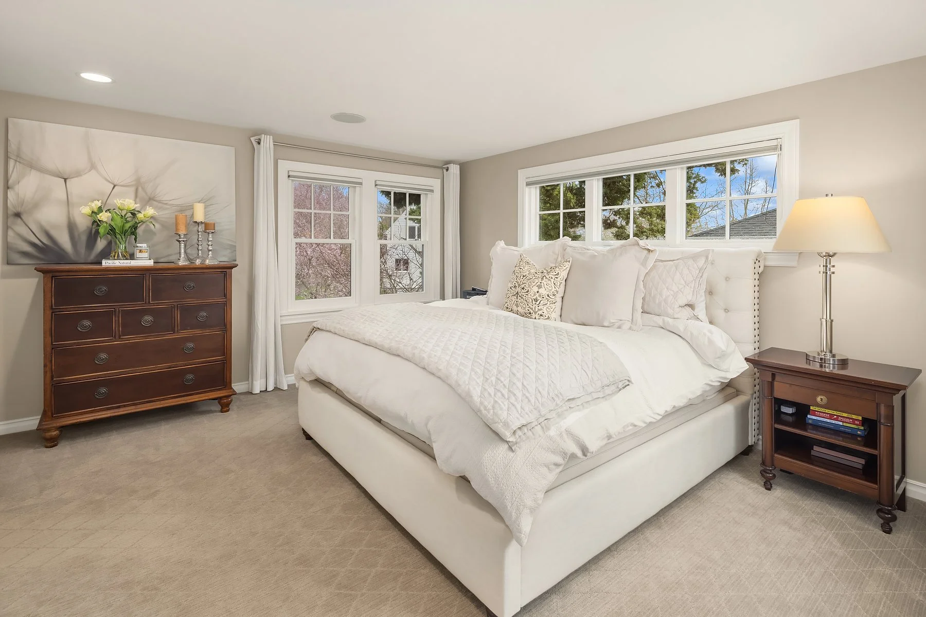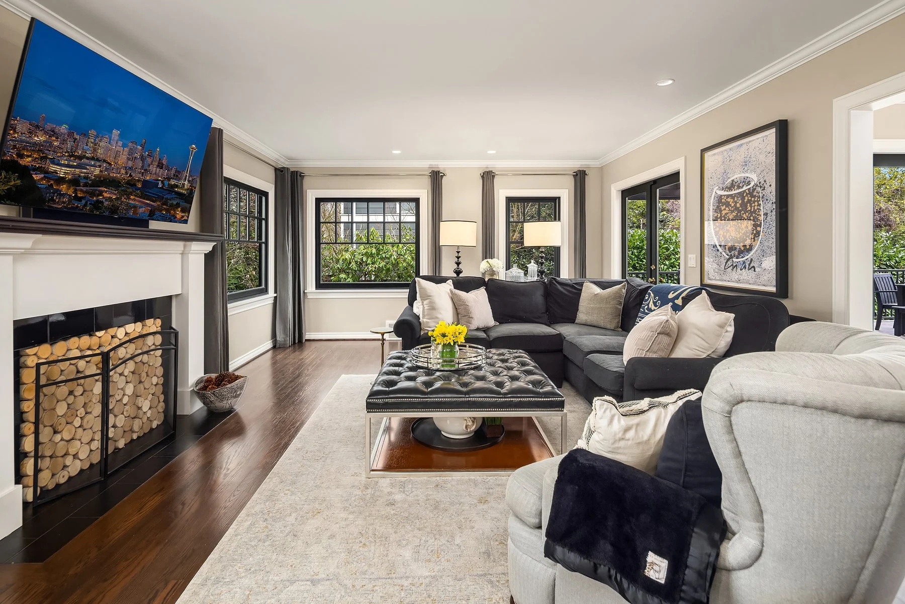 An idyllic primary suite includes a sitting room and glimpses of Lake Washington, while the newly updated spa-like bathroom indulges with stylish accents and heated floors. The versatile lower level offers a fully equipped laundry room, a project space, a recreation room, and/or a gym.