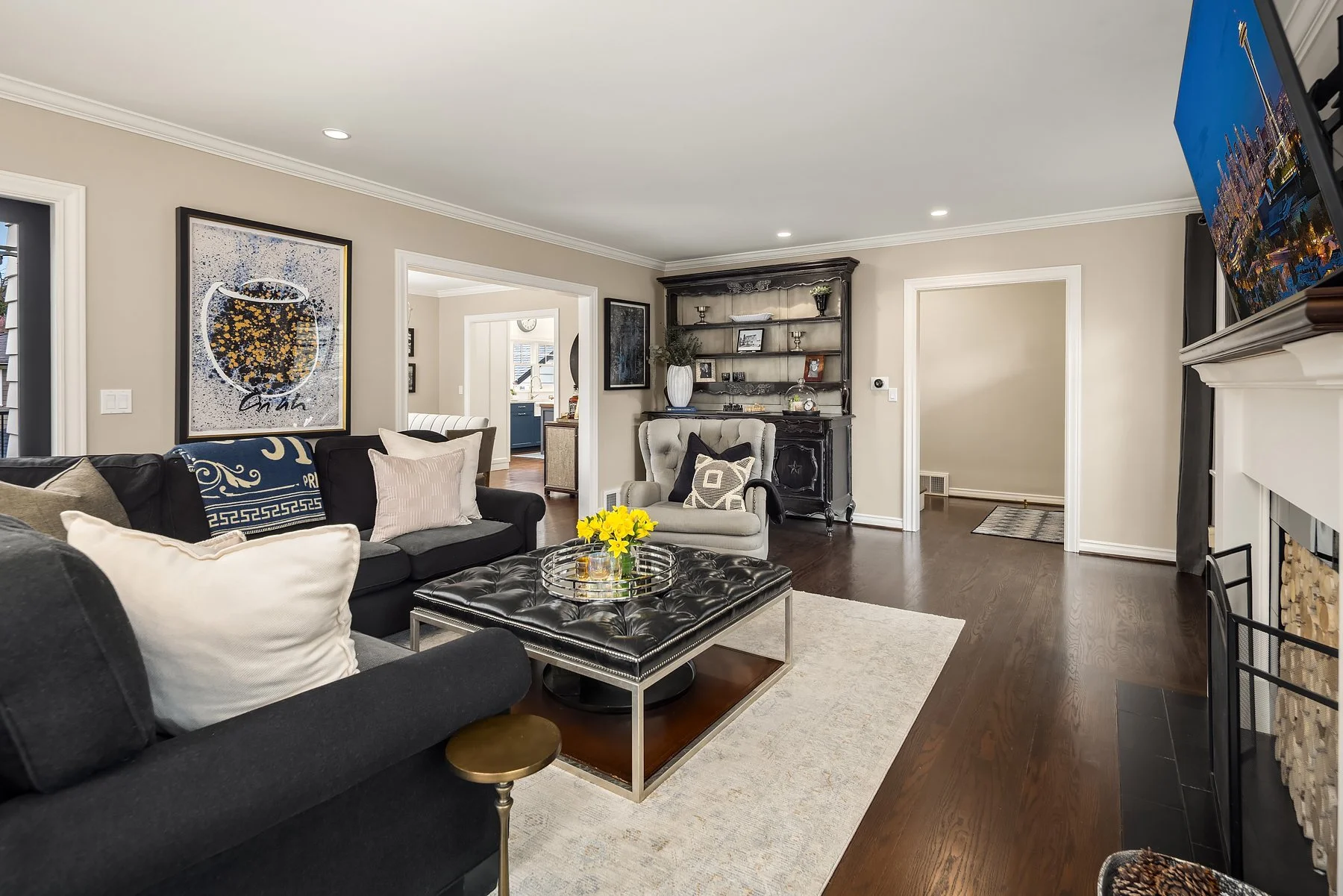 Architecturally refined with striking details, this Colonial Revival home features open living spaces, sleek design, and a premium location. Skylights and newly added Andersen wood windows fill the interiors with natural light, highlighting the stained oak floors and chic fireplace. The renovated kitchen showcases Carrara marble, thoughtful design elements, and high-end appliances.