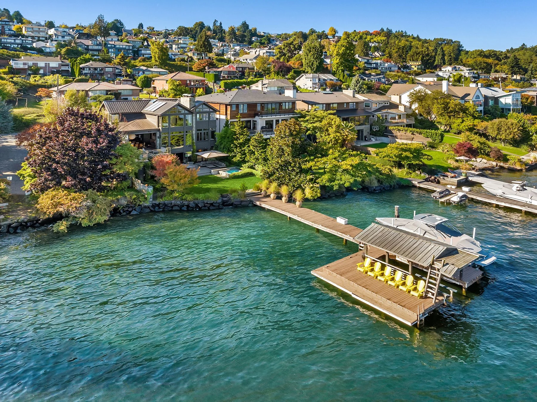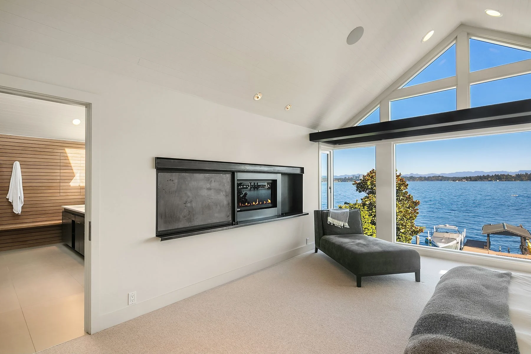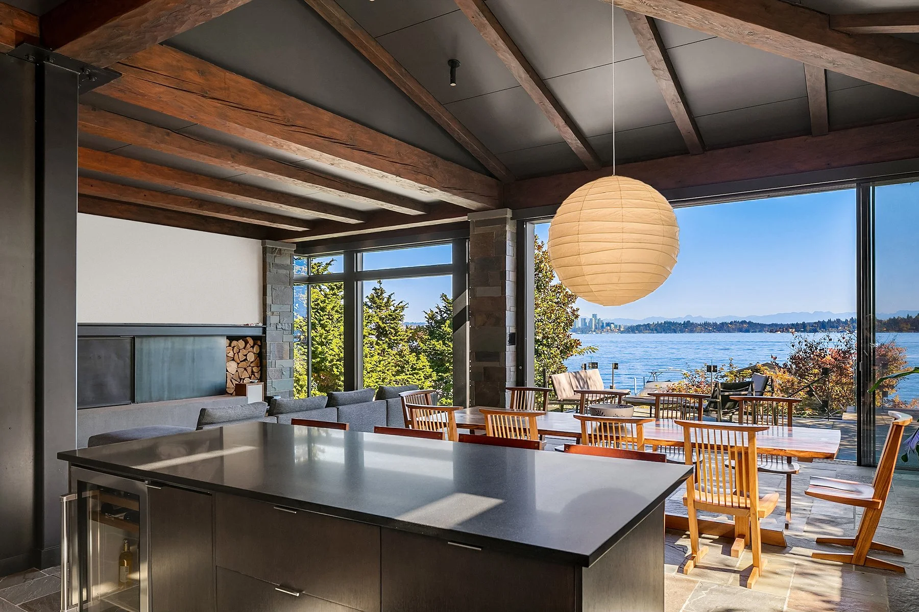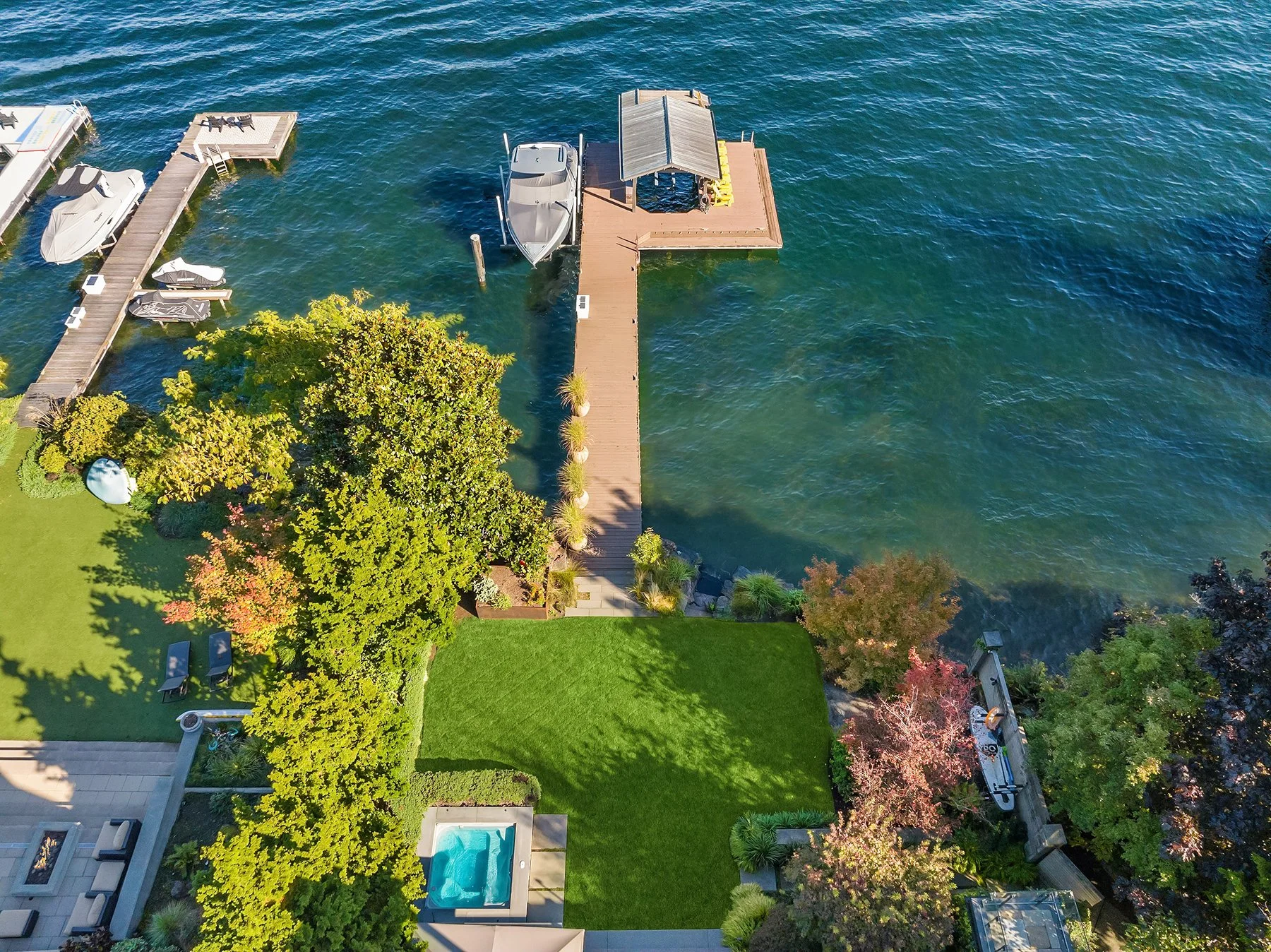Nestled along the tranquil banks of Lake Washington, this Northwest Contemporary masterpiece is showcased on 60± feet of waterfront. The renovation of this residence was completed by the renowned Tom Kundig, re-envisioned to present a loft-inspired open layout. The expansive great room is adorned with Kundig’s signature metal, wood, and stone accents. The home is centered on a gourmet kitchen designed by a cook, as well as a captivating steel staircase. The primary suite is perched above the lake, gifting city views and the majestic Cascade mountains. Features include a wine cellar, home theater, gym, and outdoor spa. The dock is equipped with two boat lifts, one with covered moorage.