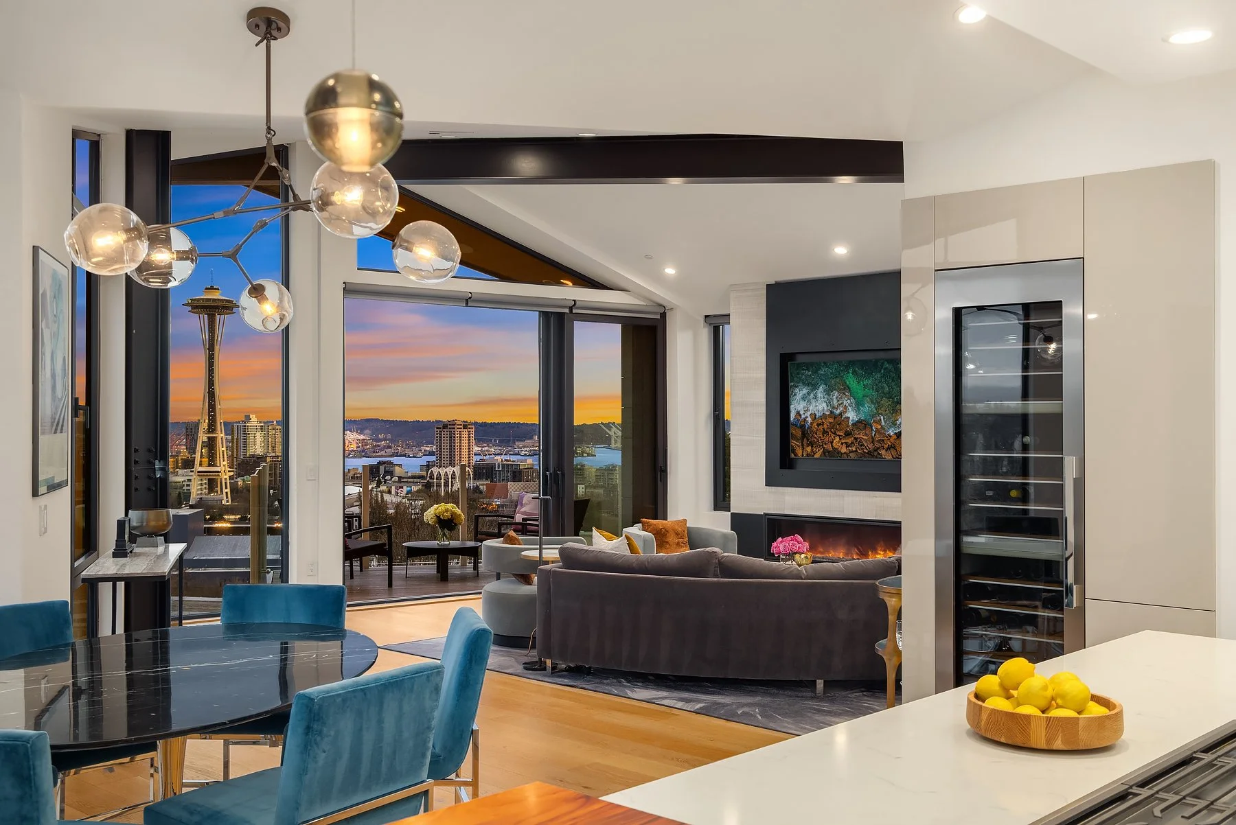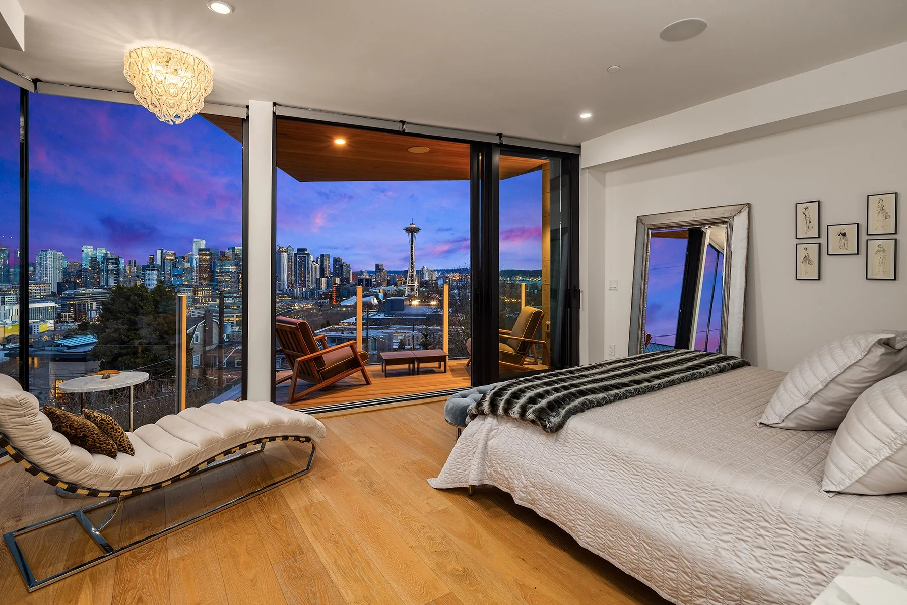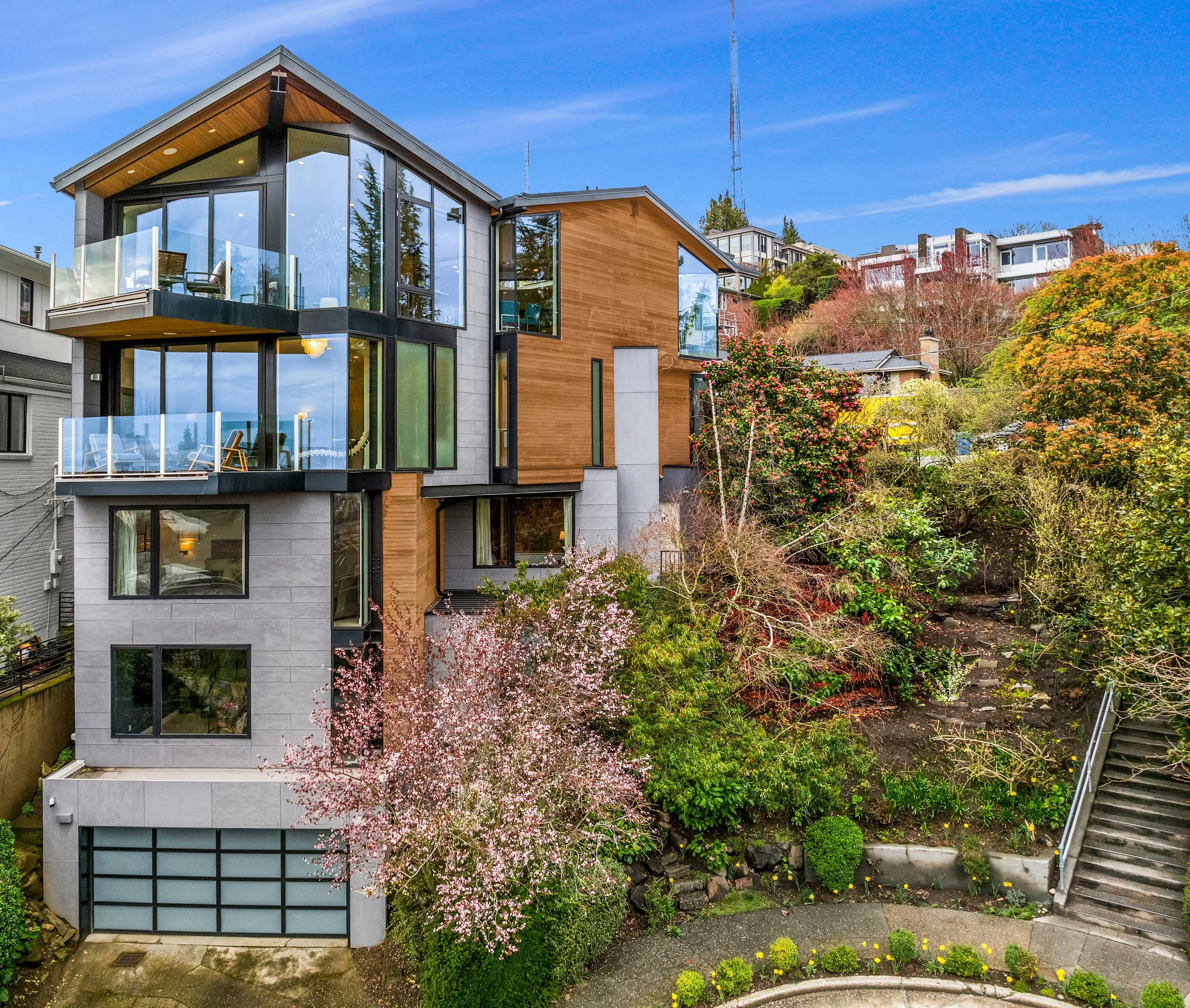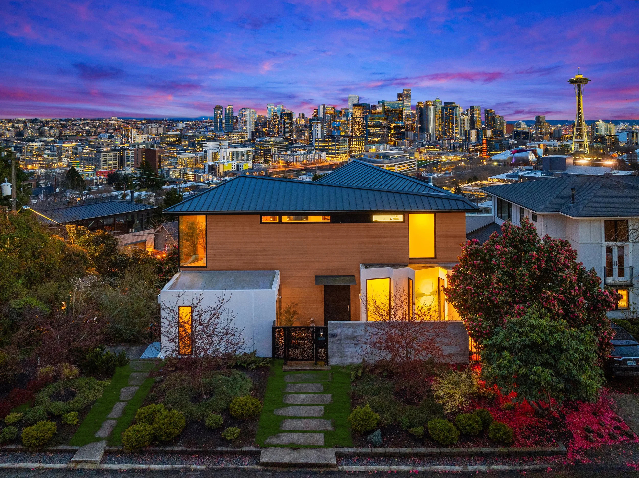 One-of-a-kind, recently built modern masterpiece with iconic panoramic views of Seattle, Puget Sound & the Space Needle on every level, framed by expansive floor-to-ceiling windows. This entertainer’s dream features an open flow with retractable balcony doors, a six-foot fireplace & a gourmet kitchen with built-in design & luxurious finishes. The serene primary suite boasts a private balcony & a tranquil bath framing the Space Needle. Amenities include state-of-the-art systems with unparalleled craftsmanship, luxury surfaces, tranquil office spaces, a gym, a media room with wet bar potential, a steam room & a garage with 220-volt outlets. Redefining modern luxury, this residence represents a rare combination of impeccable design, city access & neighborhood tranquility.