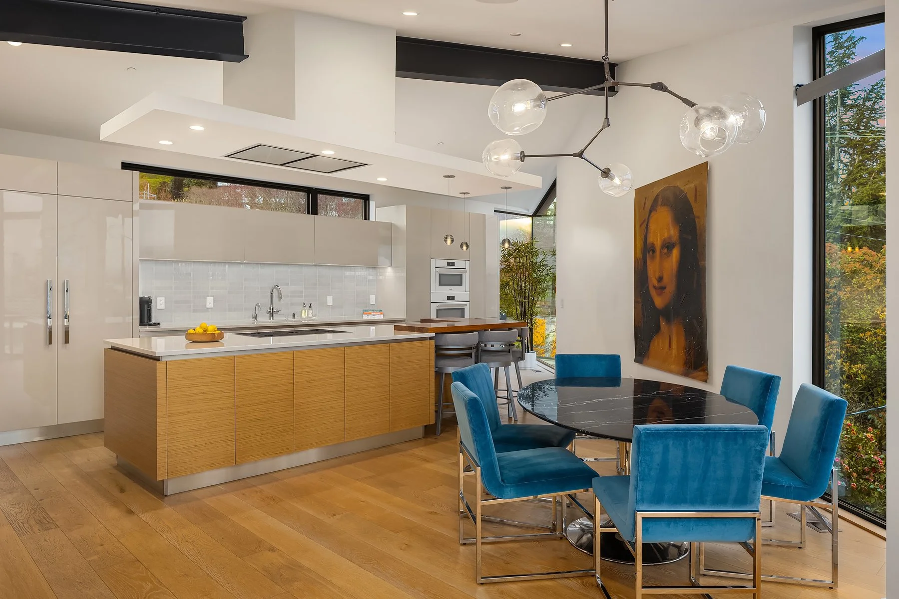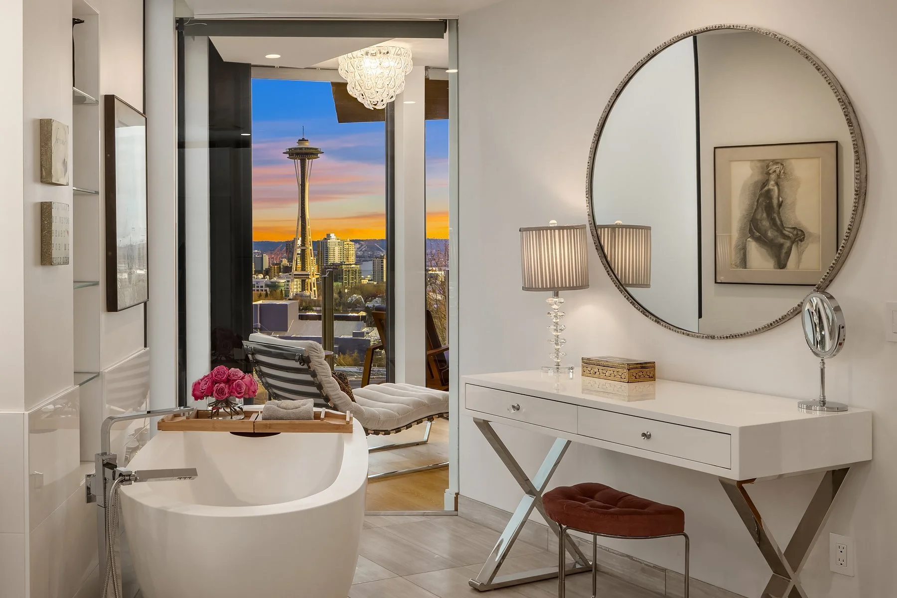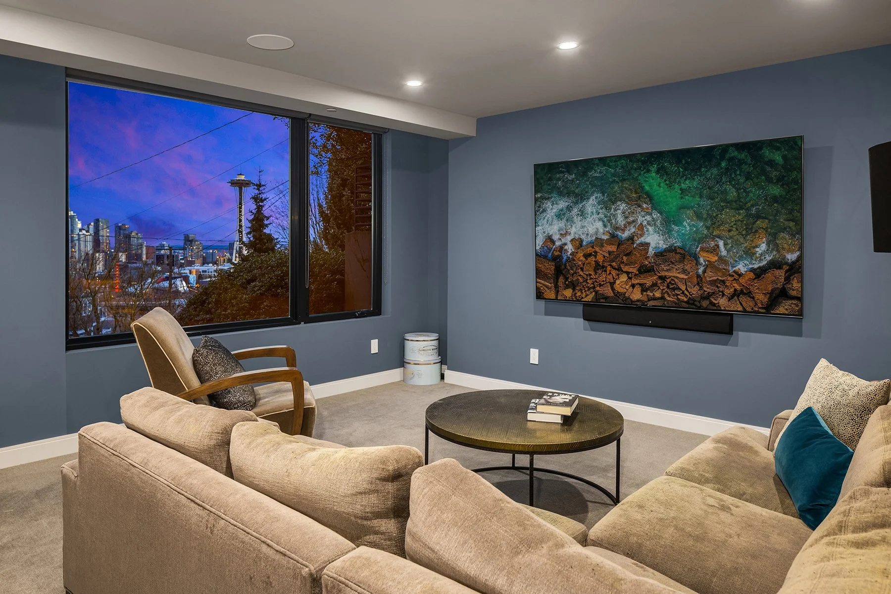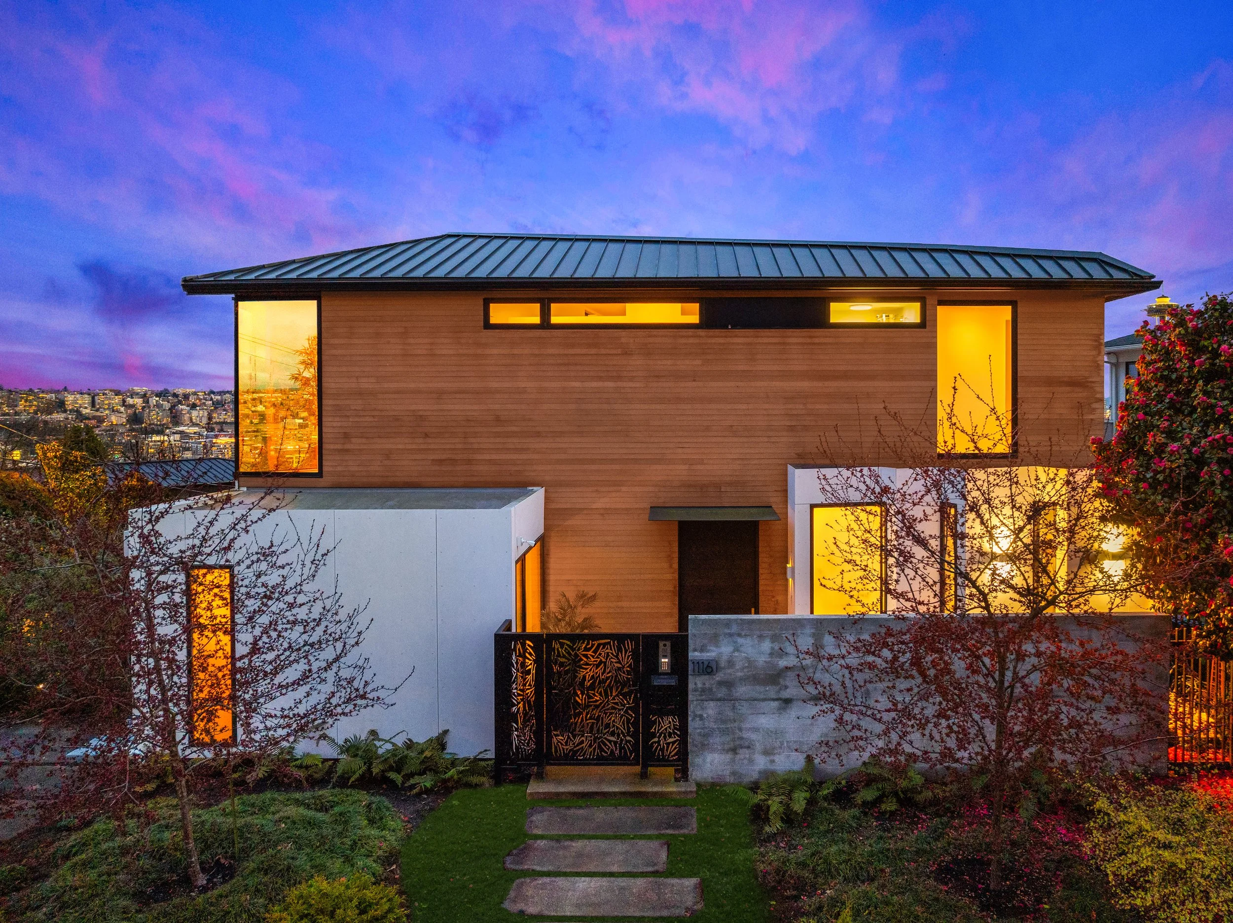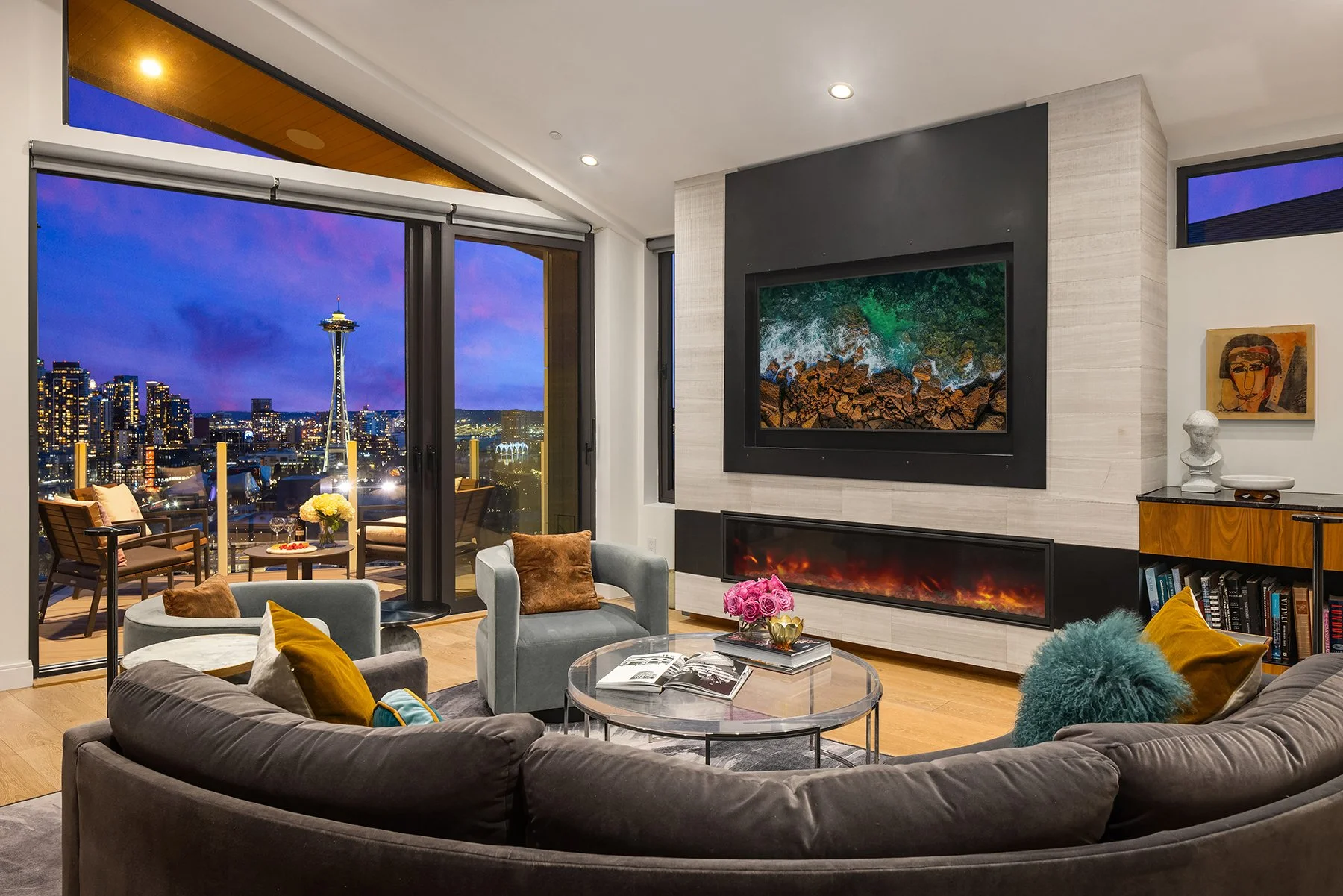 One-of-a-kind, recently built modern masterpiece with iconic panoramic views of Seattle, Puget Sound & the Space Needle on every level, framed by expansive floor-to-ceiling windows. This entertainer’s dream features an open flow with retractable balcony doors, a six-foot fireplace & a gourmet kitchen with built-in design & luxurious finishes. The serene primary suite boasts a private balcony & a tranquil bath framing the Space Needle. Amenities include state-of-the-art systems with unparalleled craftsmanship, luxury surfaces, tranquil office spaces, a gym, a media room with wet bar potential, a steam room & a garage with 220-volt outlets. Redefining modern luxury, this residence represents a rare combination of impeccable design, city access & neighborhood tranquility.